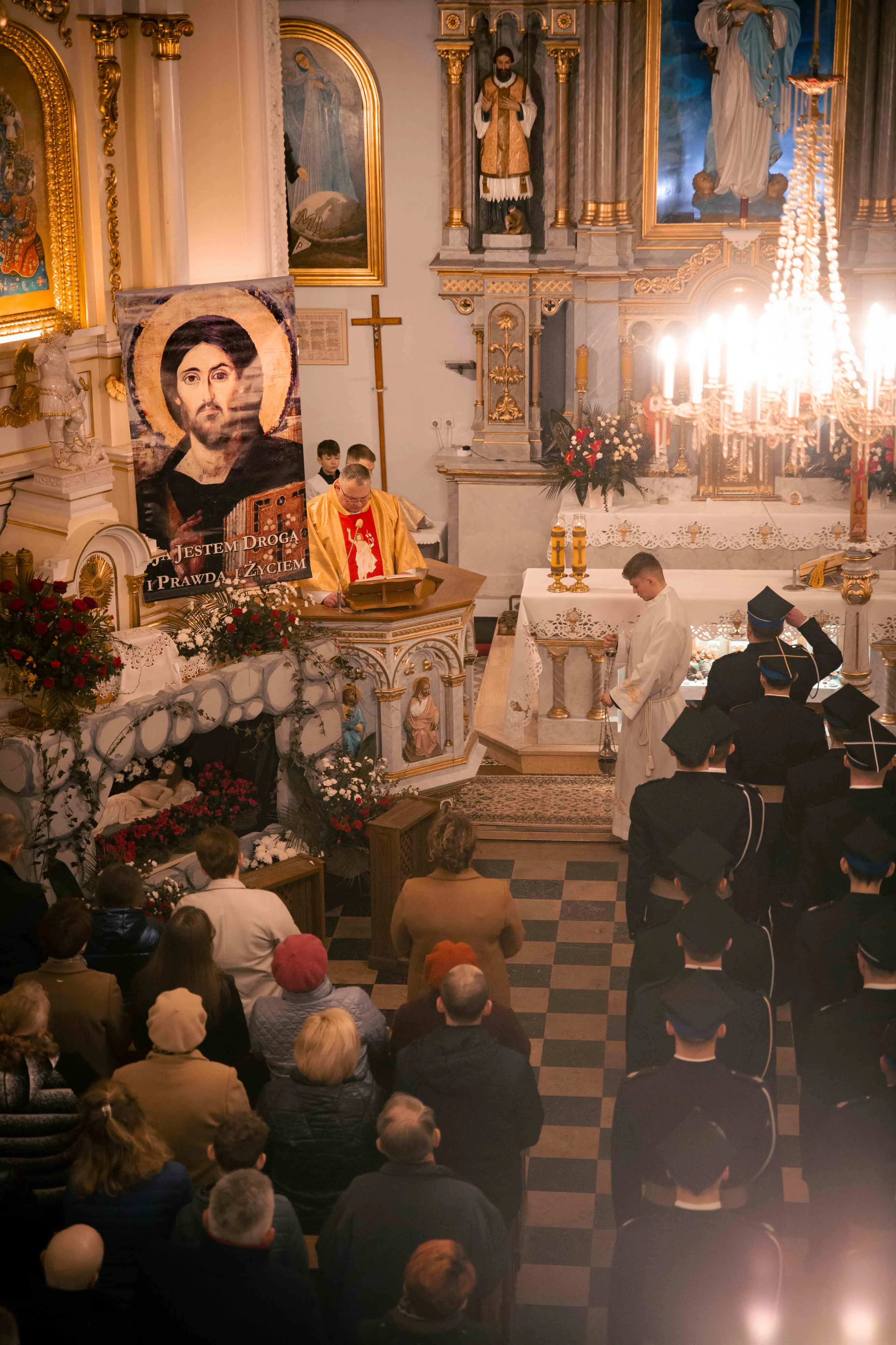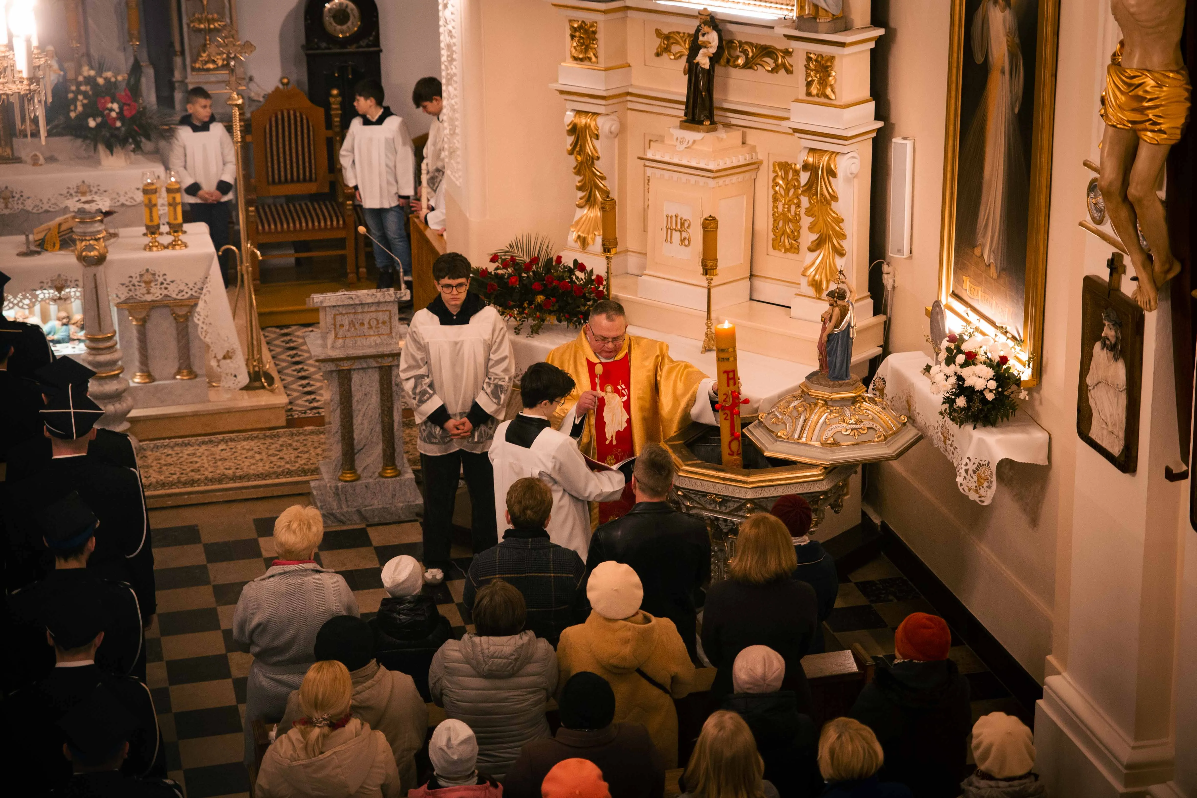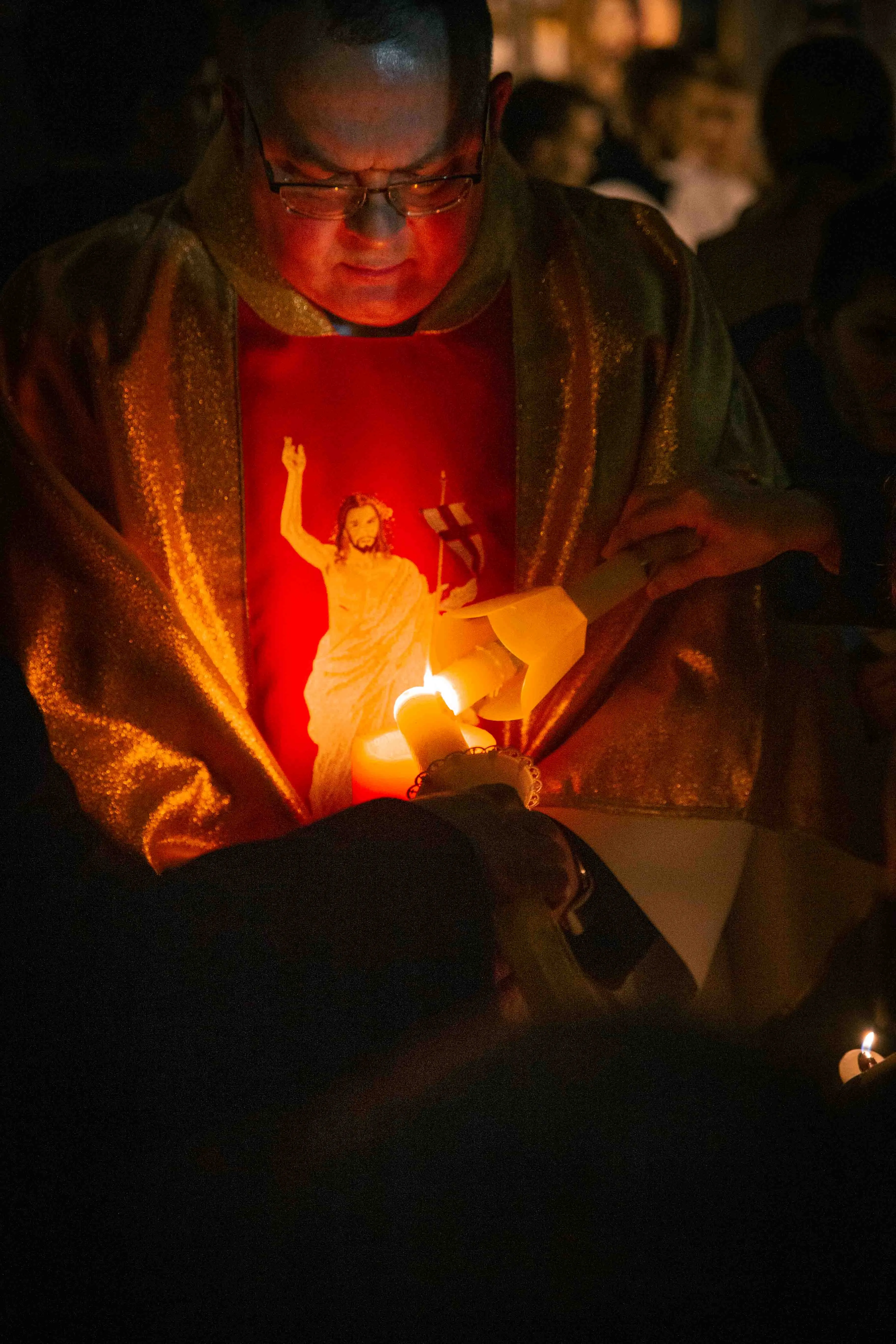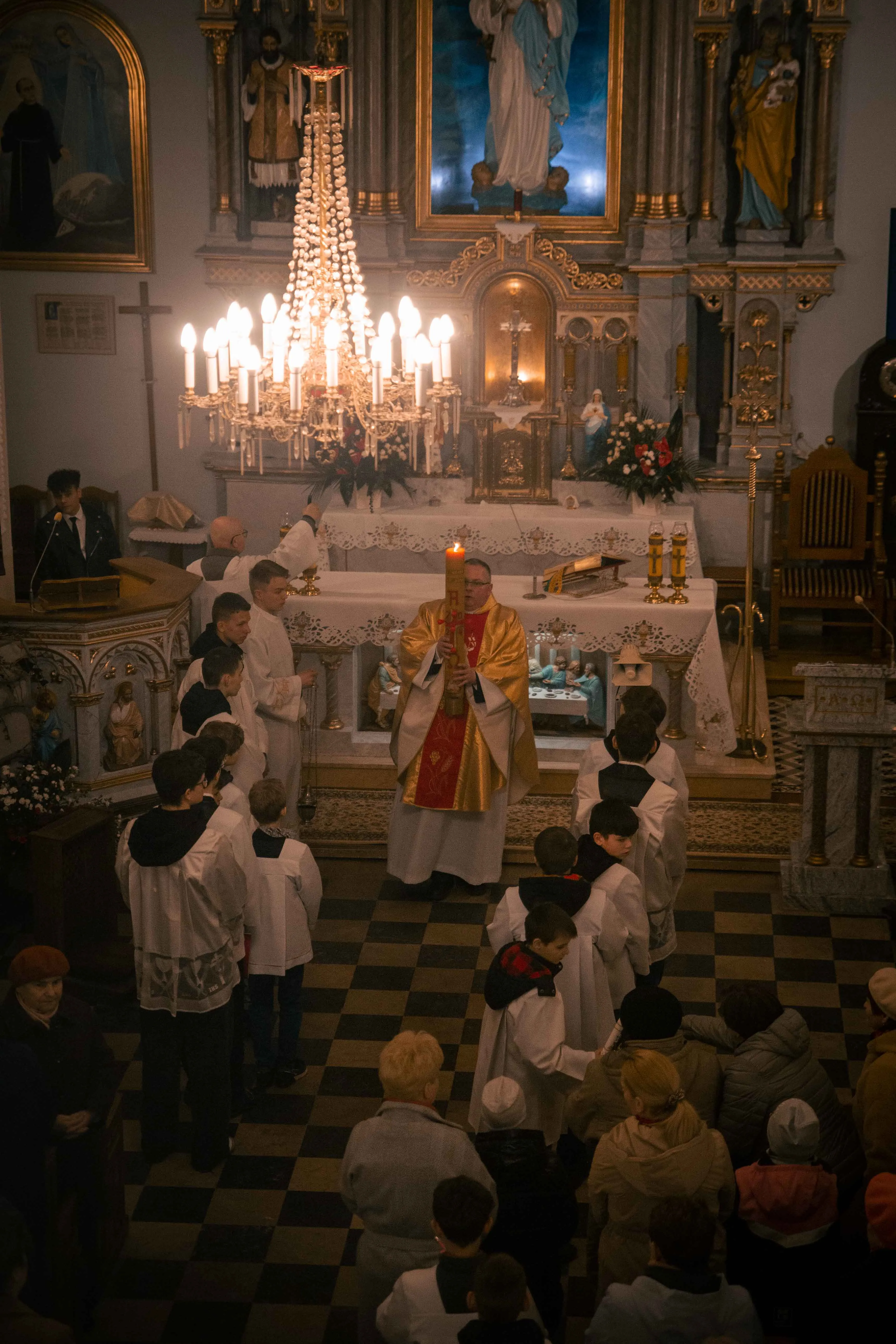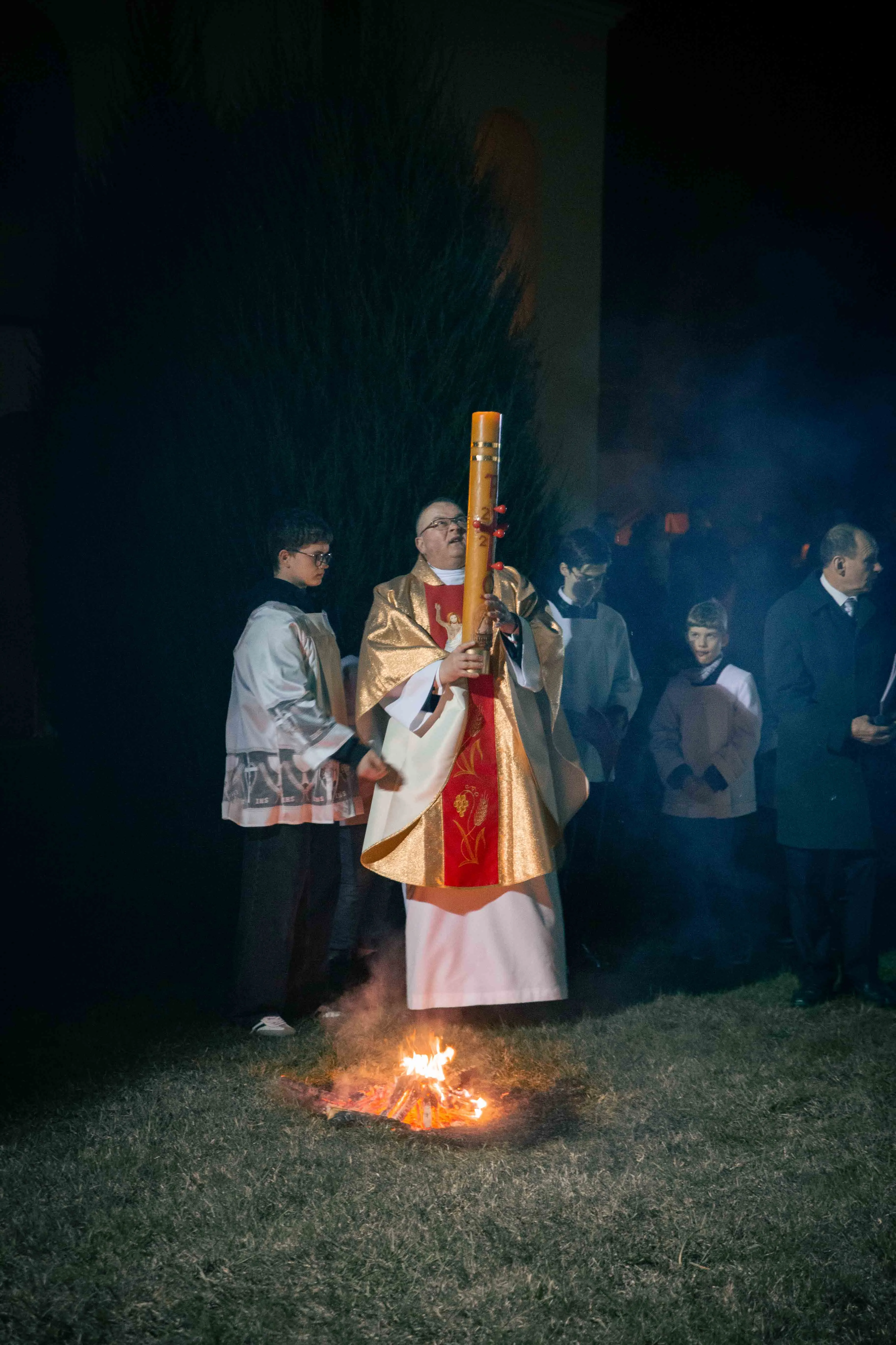Po zapadnięciu zmroku odprawiana jest msza Wigilii Paschalnej, na która składa się: Liturgia Światła, Liturgia Słowa Bożego, Liturgia Chrzcielna, Liturgia Eucharystyczna.