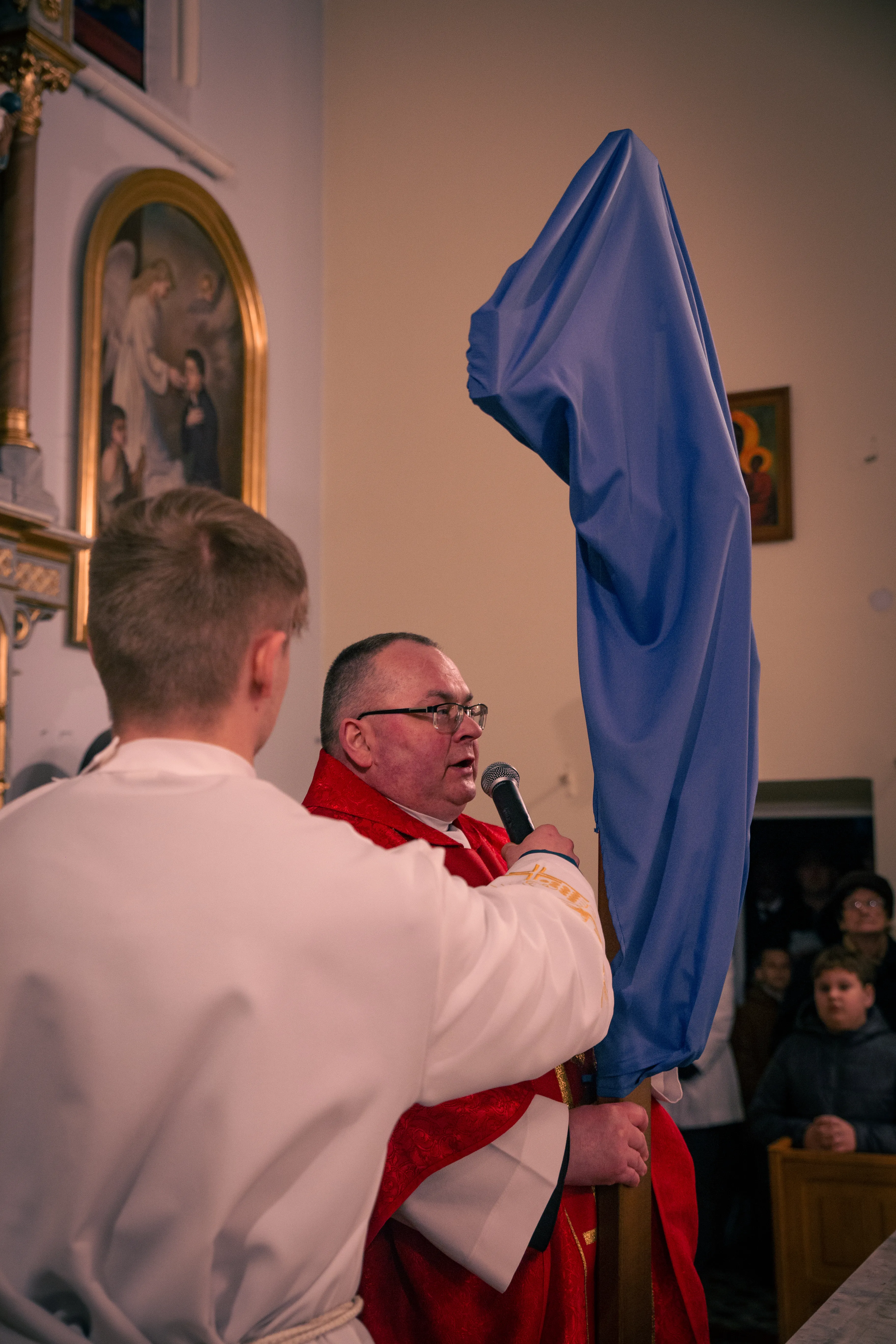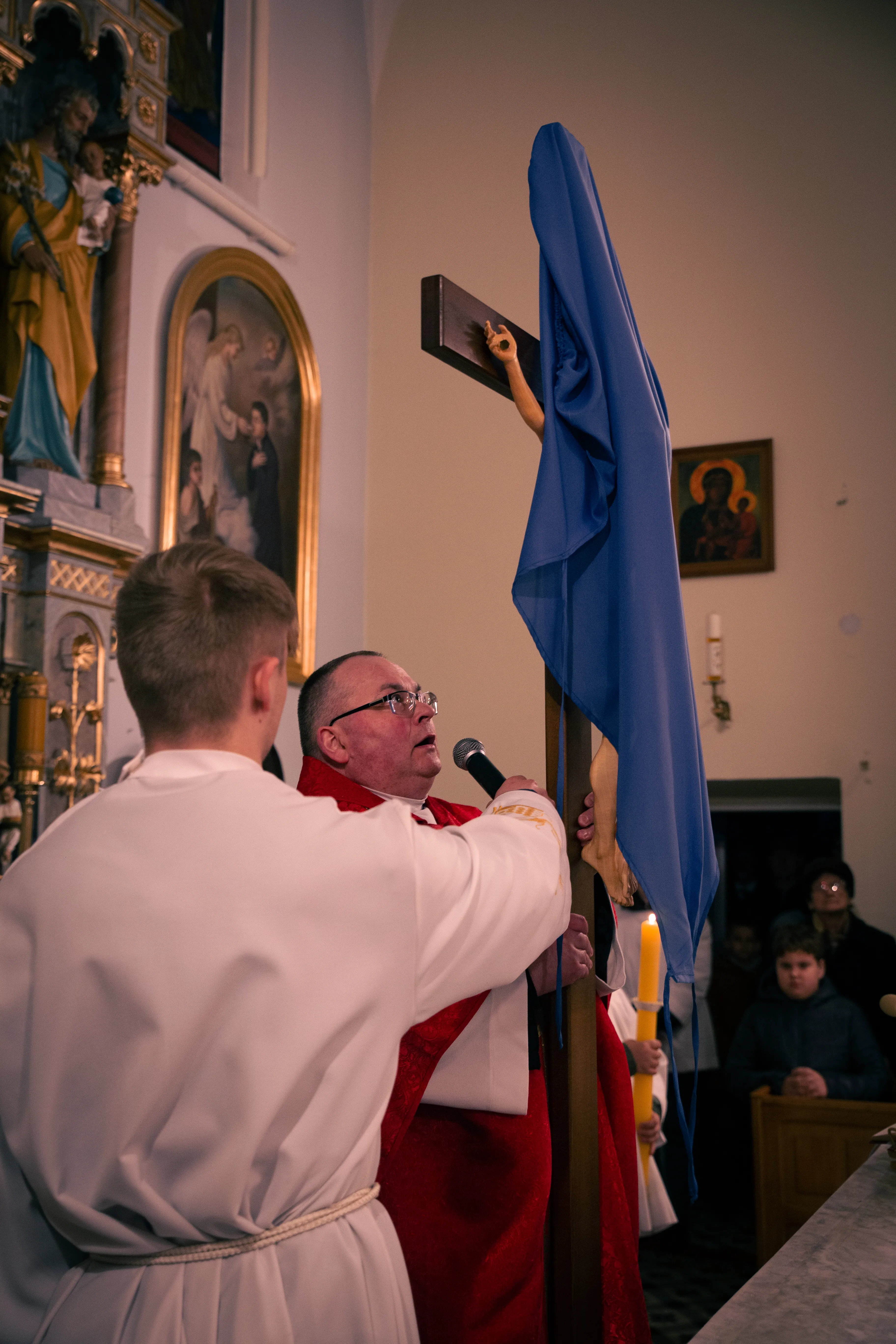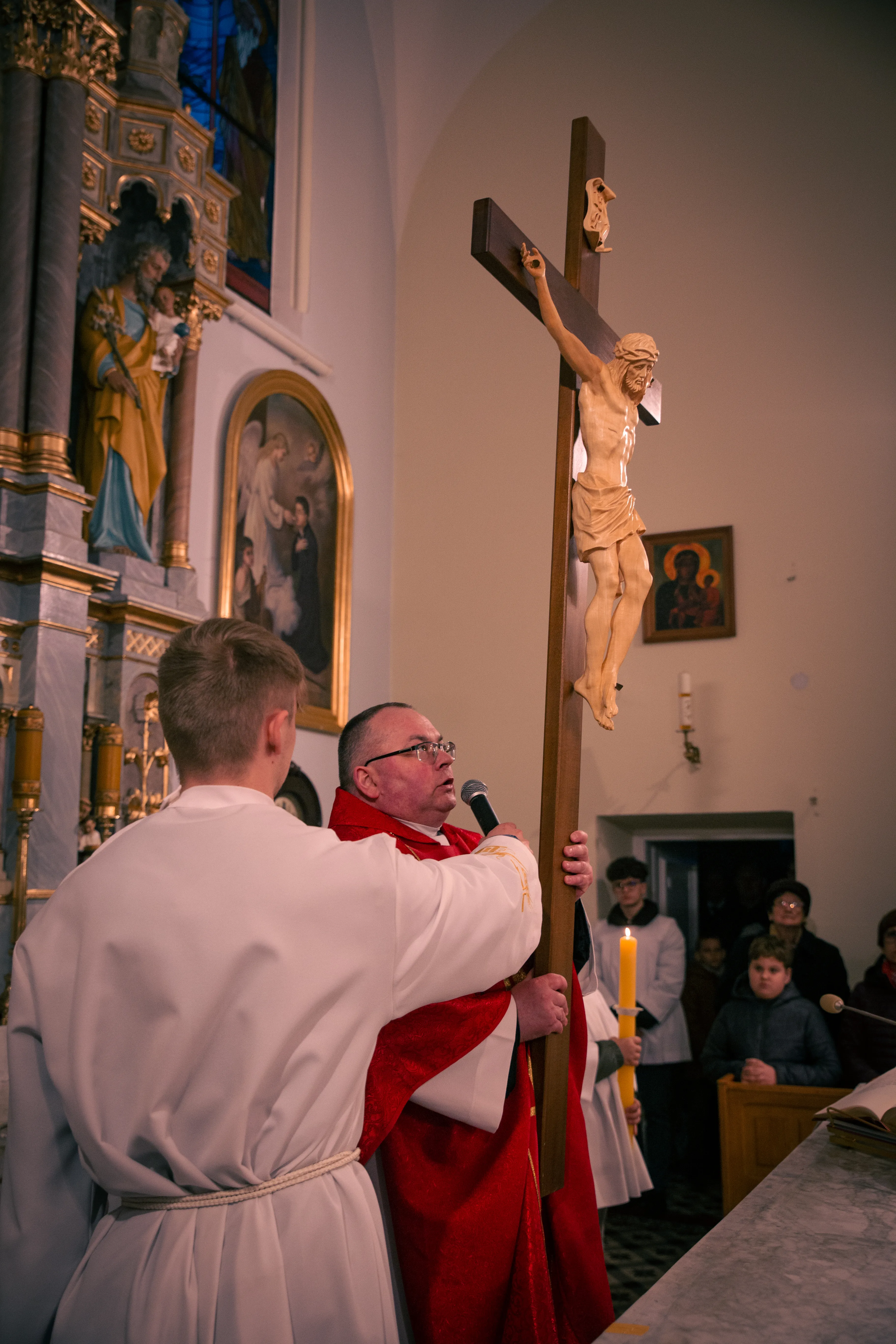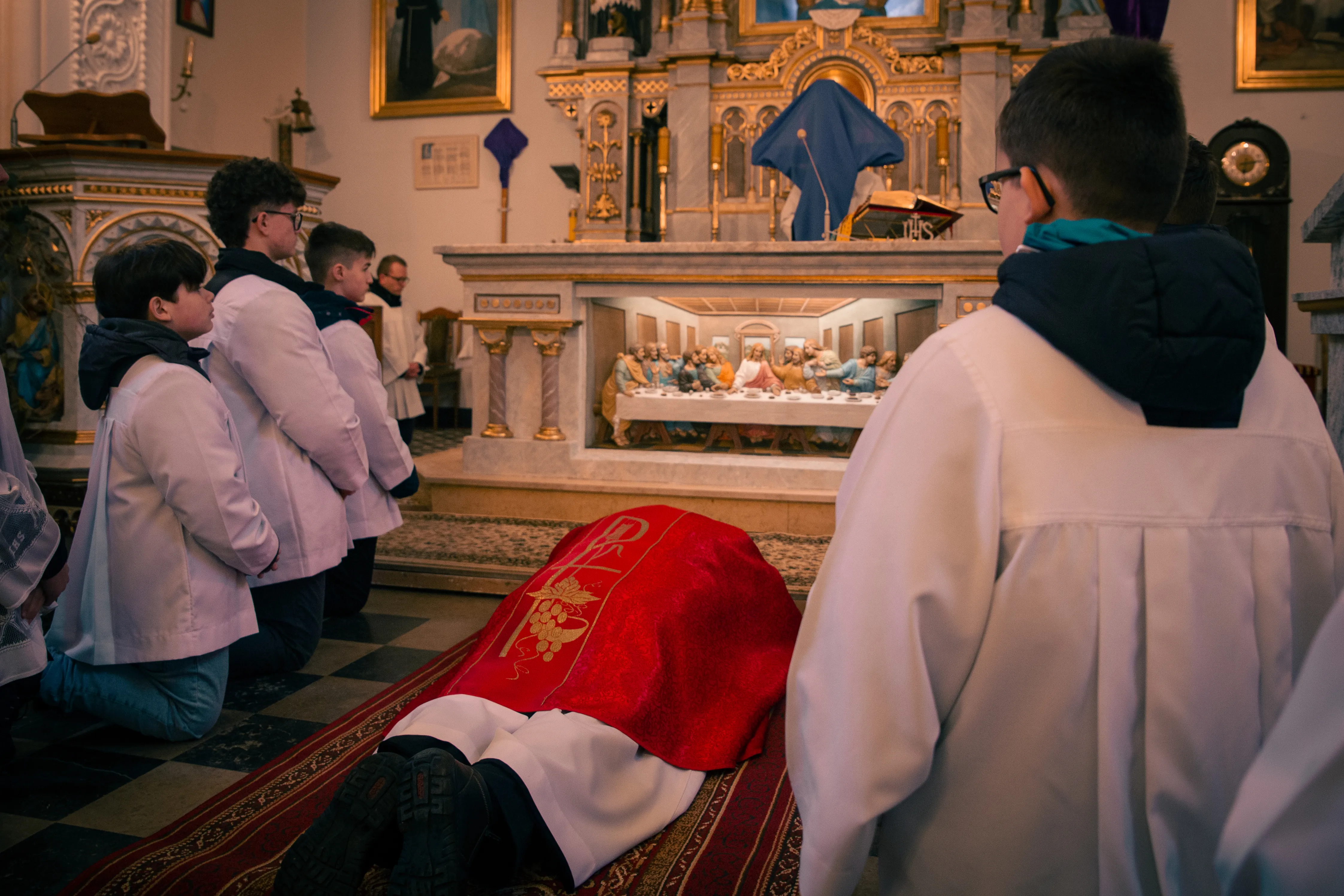 Ceremonię Wielkiego Piątku 15.04.2022 r rozpoczęła Droga Krzyżowa. Wielkopiątkowa liturgia jest pamiątką zwycięstwa odniesionego przez umęczonego i ukrzyżowanego Jezusa Chrystusa. W tym dniu używa się czerwonych szat liturgicznych symbolizujących miłość zwyciężającą na krzyżu, ale nie odprawia się Mszy świętej. Liturgię rozpoczęła milcząca procesja. Kapłan dokonał aktu prostracji, czyli leżenia krzyżem, co jest znakiem najgłębszej adoracji, uniżenia i pokuty.