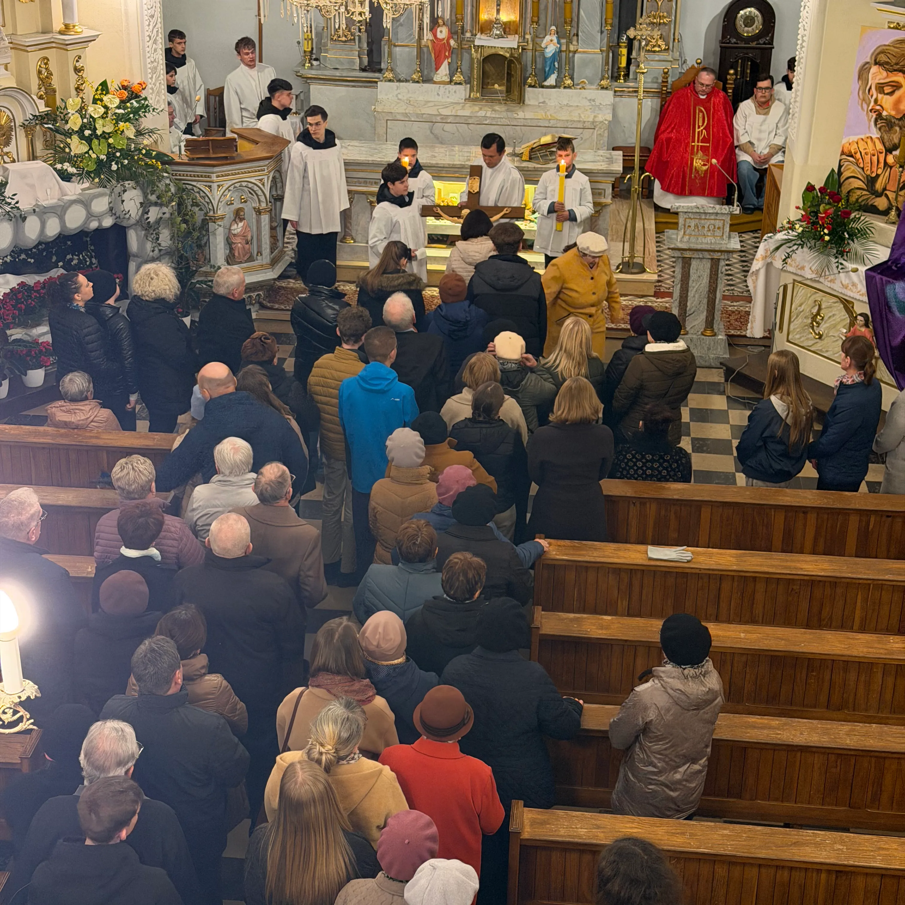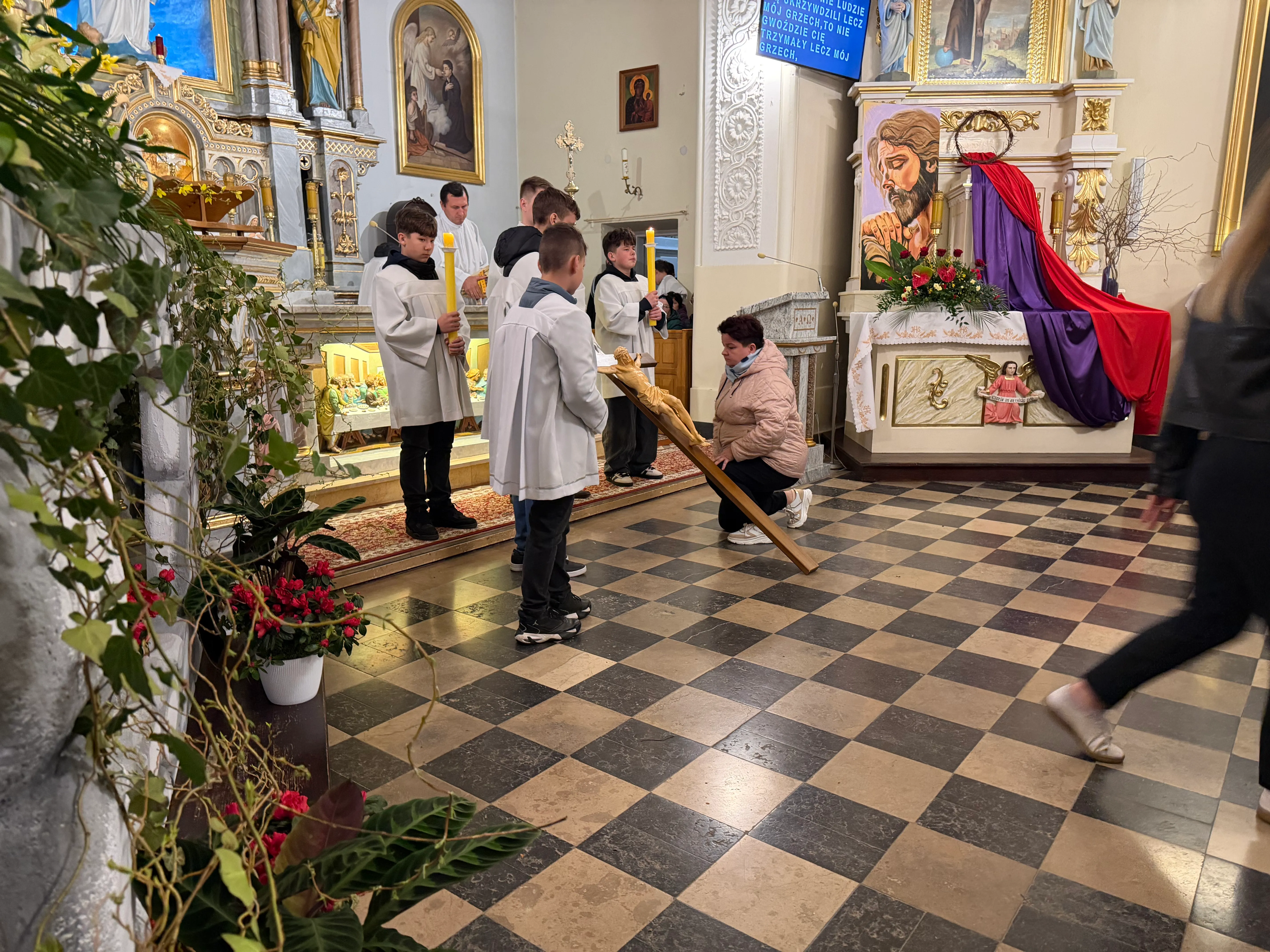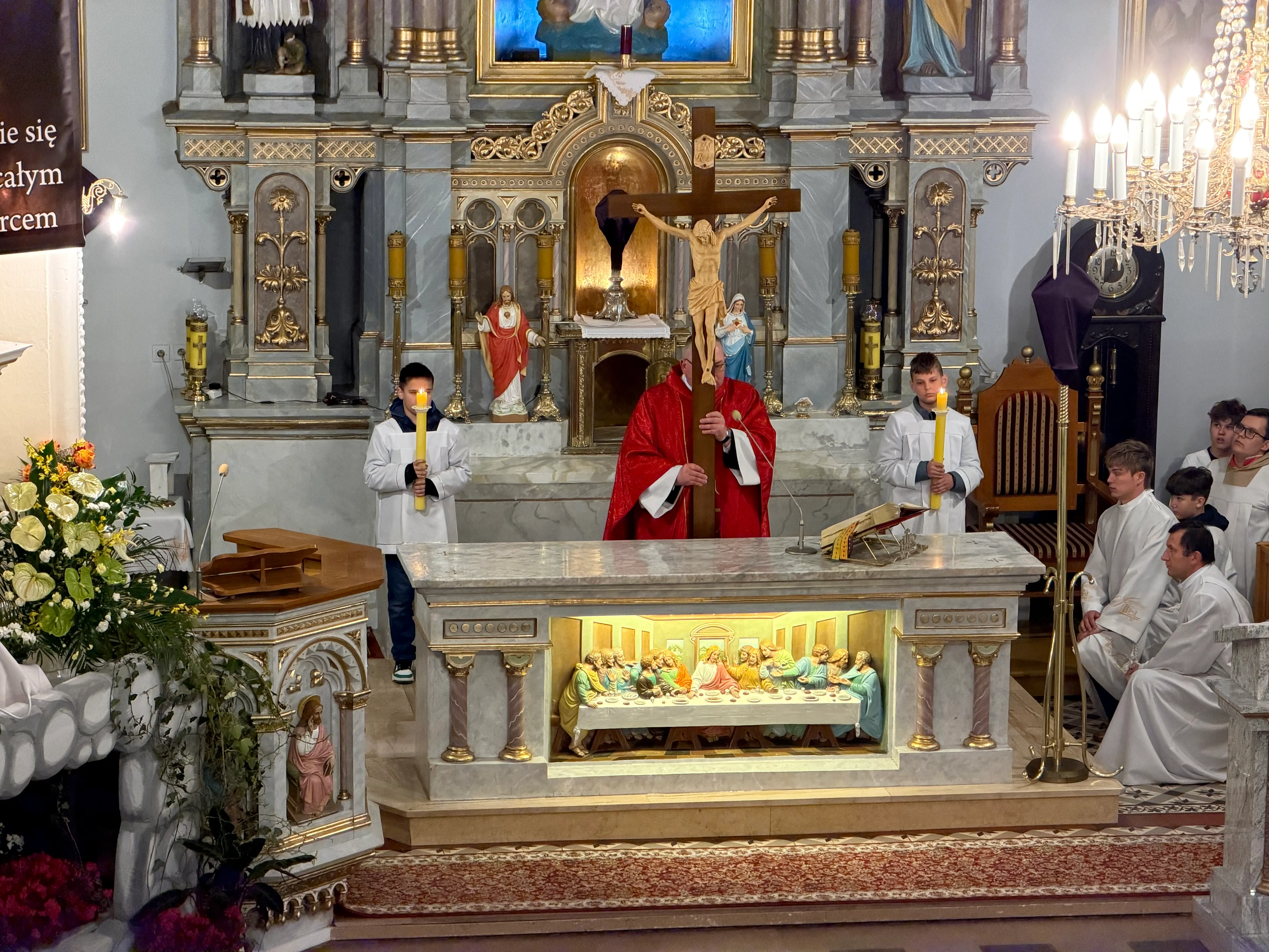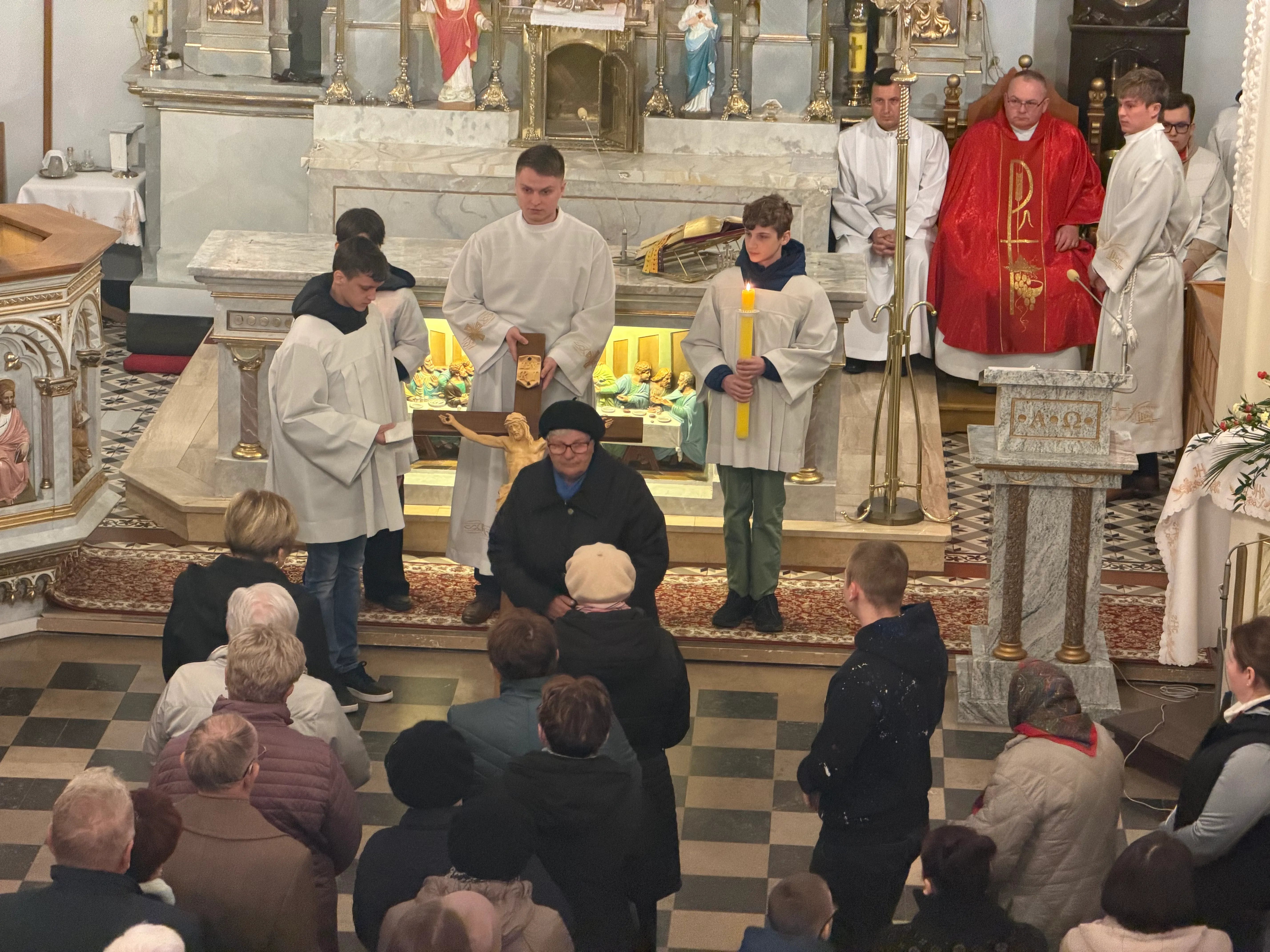Ceremonię Wielkiego Piątku rozpoczęła Droga Krzyżowa. Wielkopiątkowa liturgia jest pamiątką zwycięstwa odniesionego przez umęczonego i ukrzyżowanego Jezusa Chrystusa. W tym dniu używa się czerwonych szat liturgicznych symbolizujących miłość zwyciężającą na krzyżu, ale nie odprawia się Mszy świętej. Liturgię rozpoczęła milcząca procesja. Kapłan dokonał aktu prostracji, czyli leżenia krzyżem, co jest znakiem najgłębszej adoracji, uniżenia i pokuty.