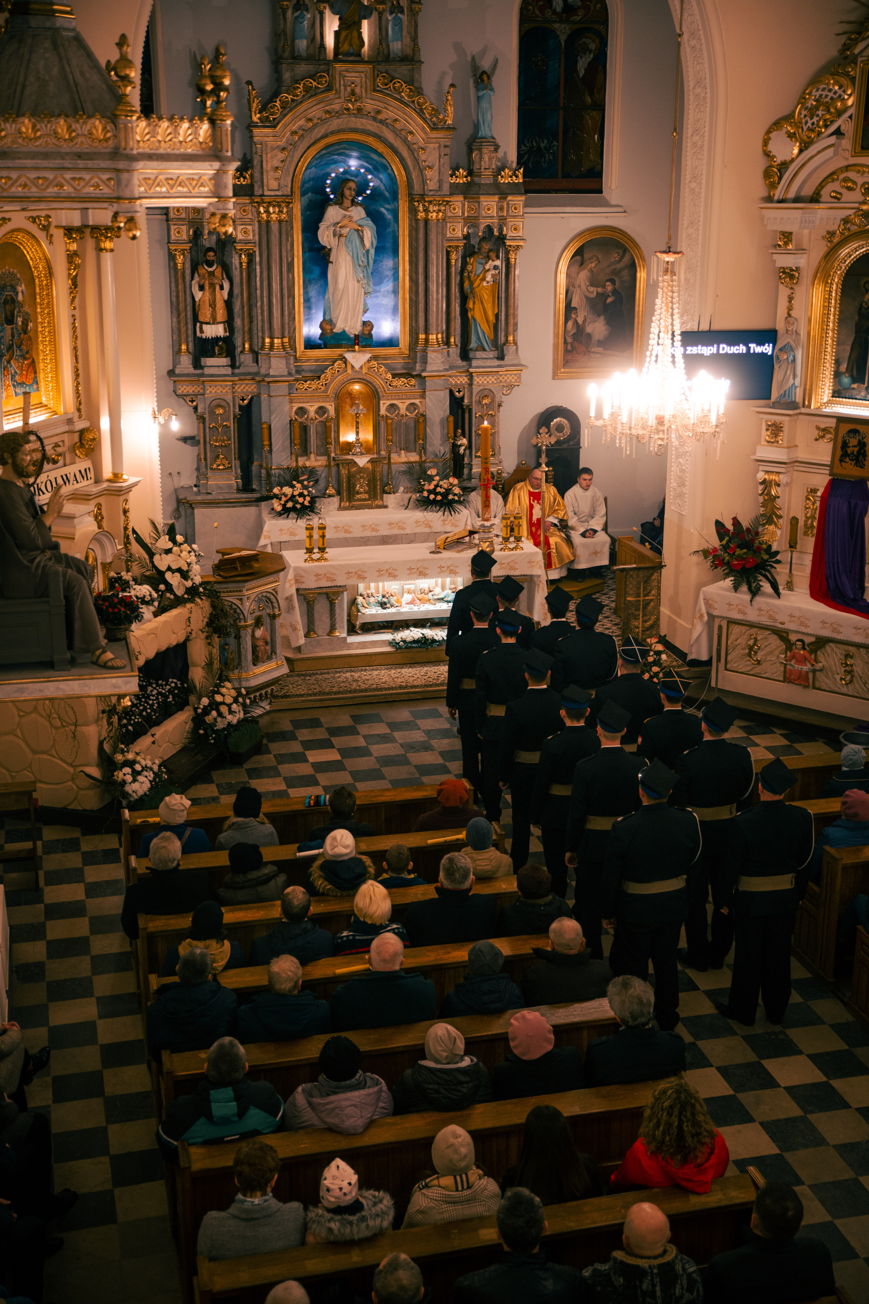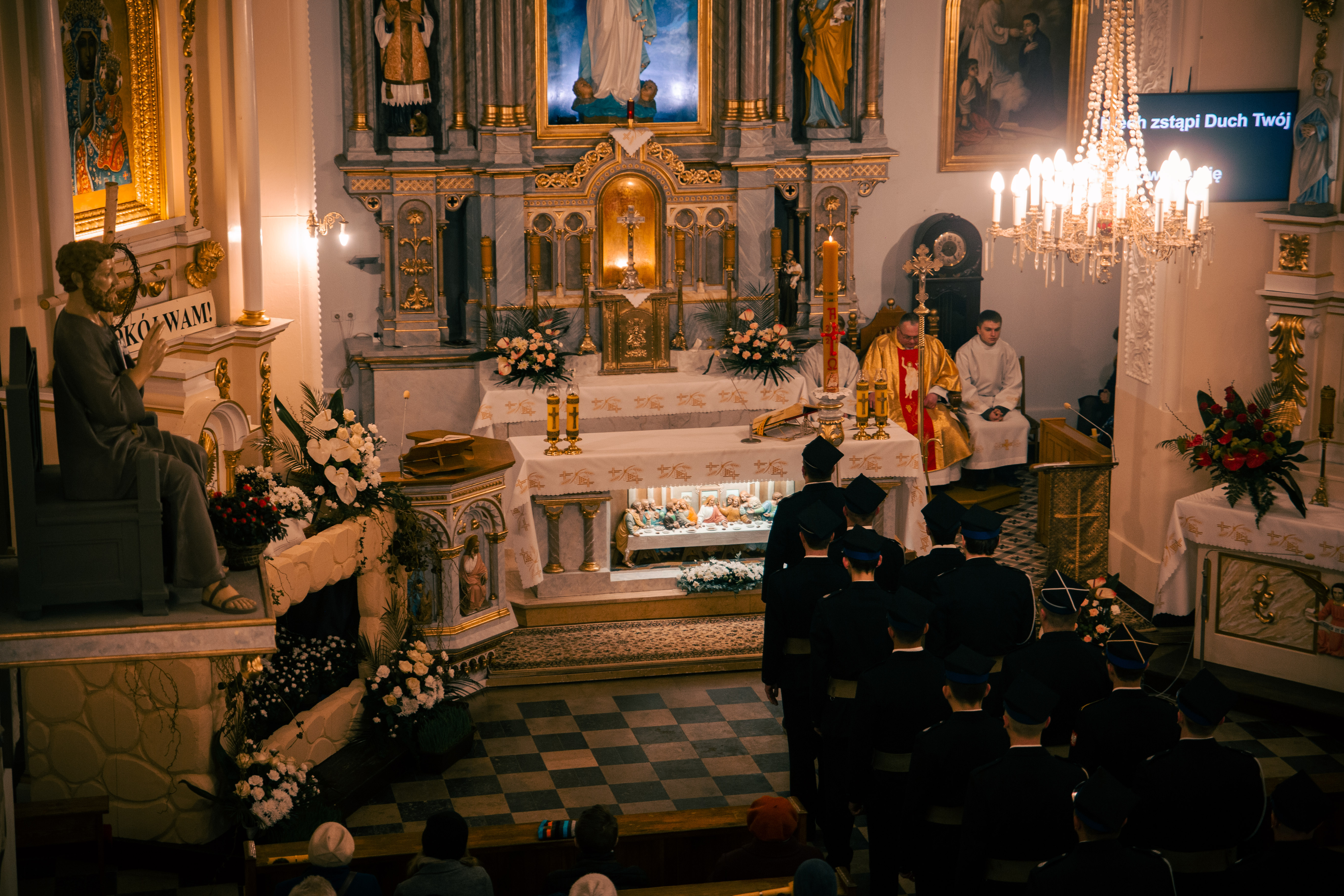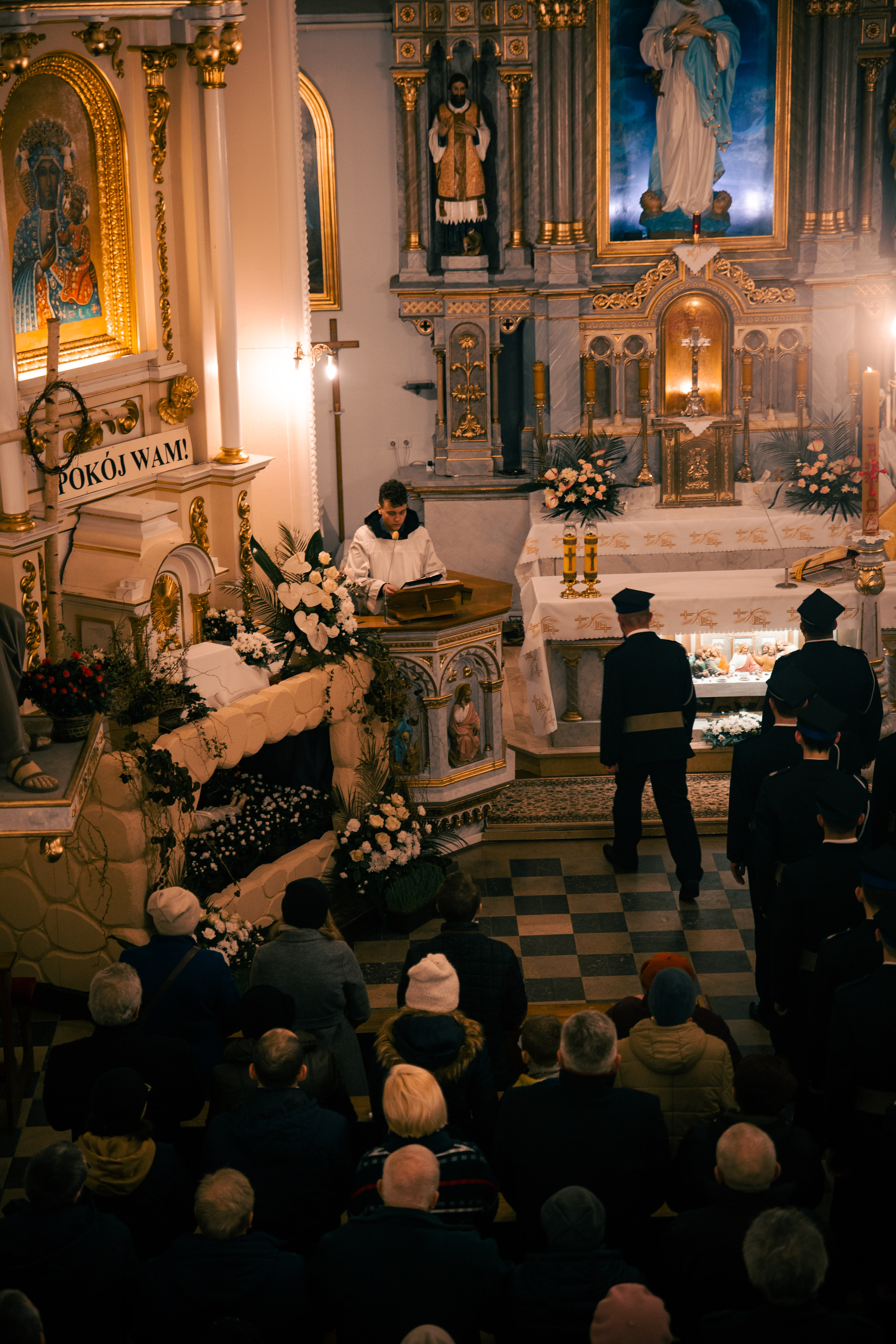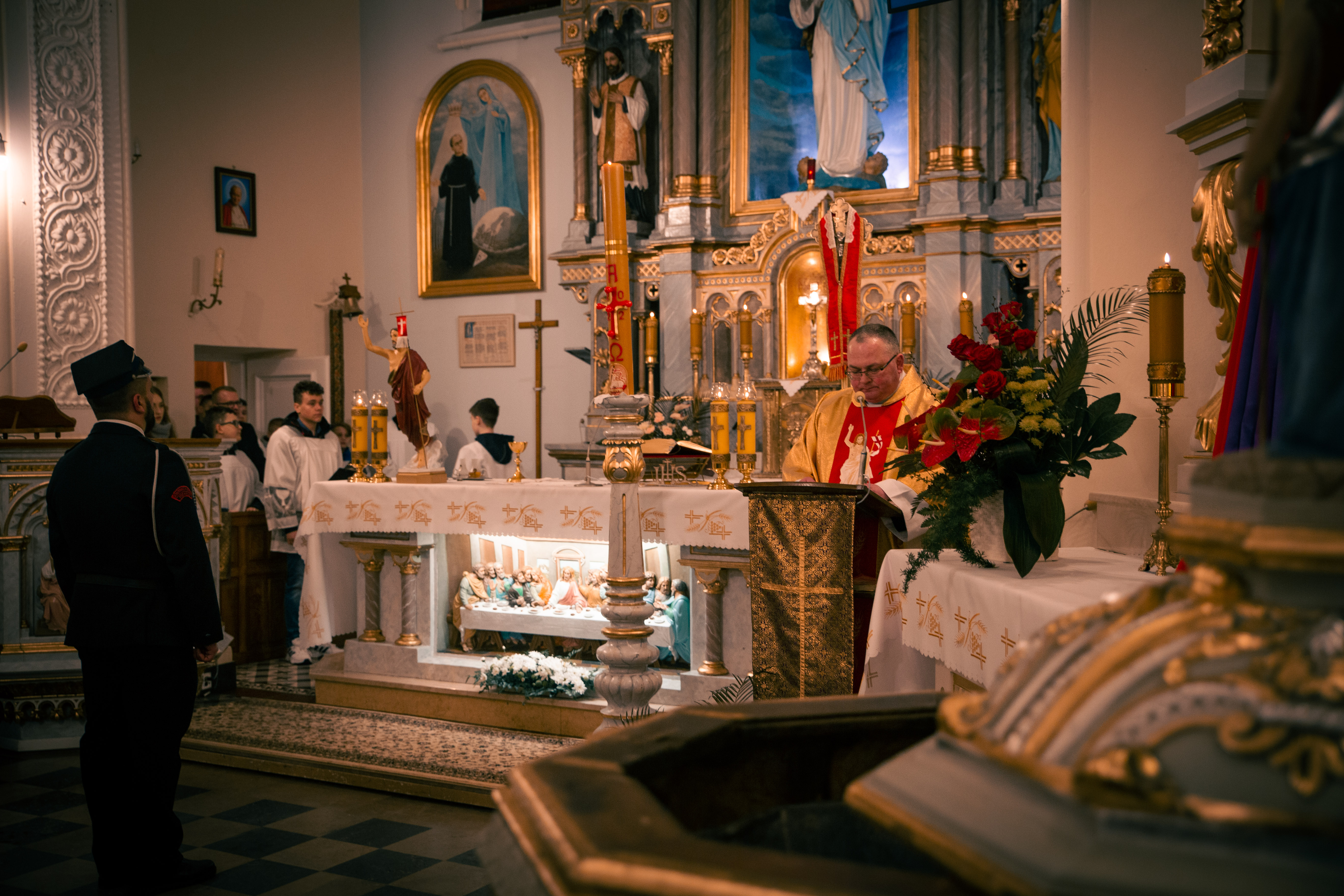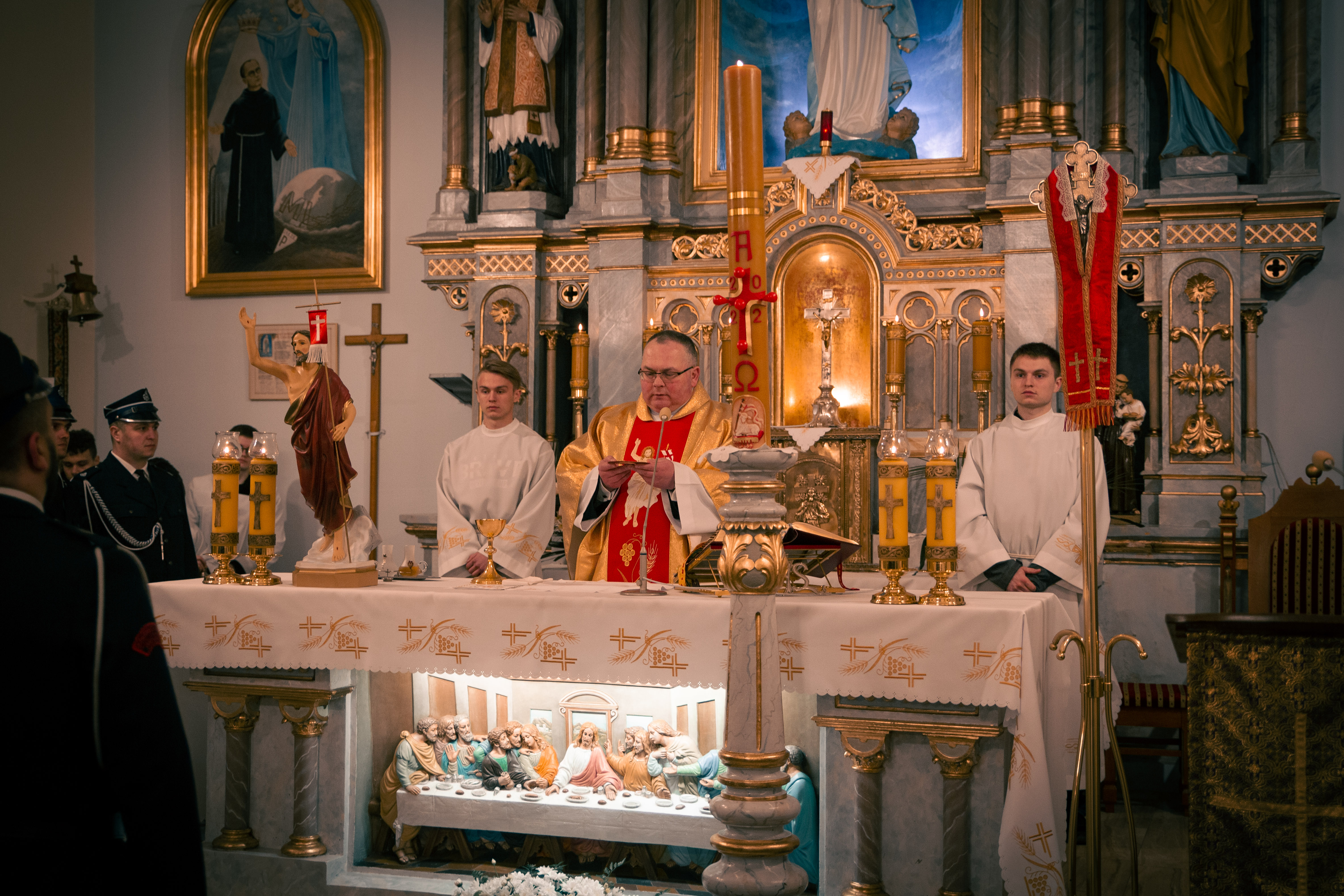 Po zapadnięciu zmroku odprawiana jest msza Wigilii Paschalnej, na która składa się: Liturgia Światła, Liturgia Słowa Bożego, Liturgia Chrzcielna, Liturgia Eucharystyczna.