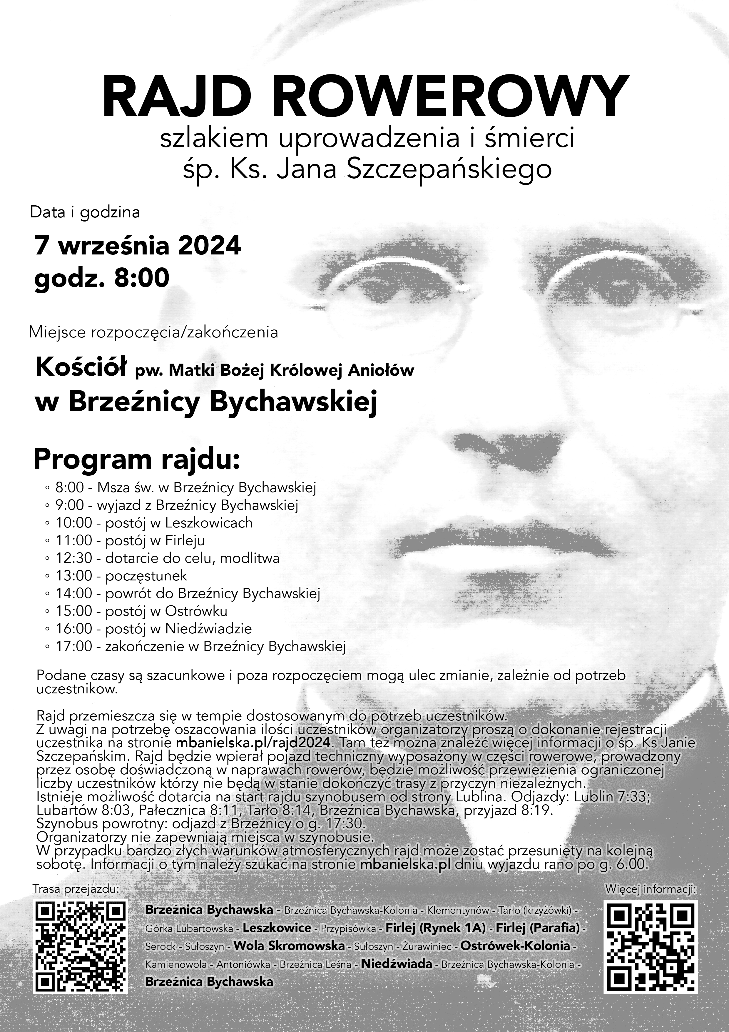 Rajd poprzedzi Msza św. która rozpocznie się o g. 8.00. Około g. 9.00 uczestnicy wyrusza na trasę. Rajd przemieszcza się w tempie dostosowanym do możliwości uczestników. W tym roku będzie ich wspierał samochód techniczny wyposażony w części rowerowe i osoba doświadczona w naprawach rowerów. Będzie możliwość przewiezienia ograniczonej liczby uczestników, którzy nie będą w stanie dokończyć trasy z przyczyn niezależnych. W punkcie docelowym zostanie zmówiona modlitwa za śp. ks. Jana, po której uczestnicy zostaną zaproszeni na poczęstunek przed drogą powrotną. Z uwagi na potrzebę oszacowania ilości uczestników organizatorzy proszą o dokonanie rejestracji na stronie mbanielska.pl/rajd2024. Osoby, które nie dokonają rejestracji będą mogły wziąć udział w rajdzie, jednak organizatorzy proszą o zarejestrowanie się w miarę możliwości. Na stronie parafii można znaleźć więcej informacji o śp. ks. Janie Szczepańskim oraz o samym rajdzie, w tym jego dokładną trasę. W przypadku wystąpienia bardzo złych warunków atmosferycznych rajd może zostać przesunięty na kolejną sobotę. Informacji o tym należy szukać na naszej stronie w dniu wyjazdu, rano po g. 6.00. Zachęcamy do uczestnictwa w rajdzie i odwiedzenia Brzeźnicy w tym czasie, aby pamięć o śp. ks. Janie Szczepańskim trwała przez kolejne lata. Przejdź do artykułu opisującego losy ks. Jana.