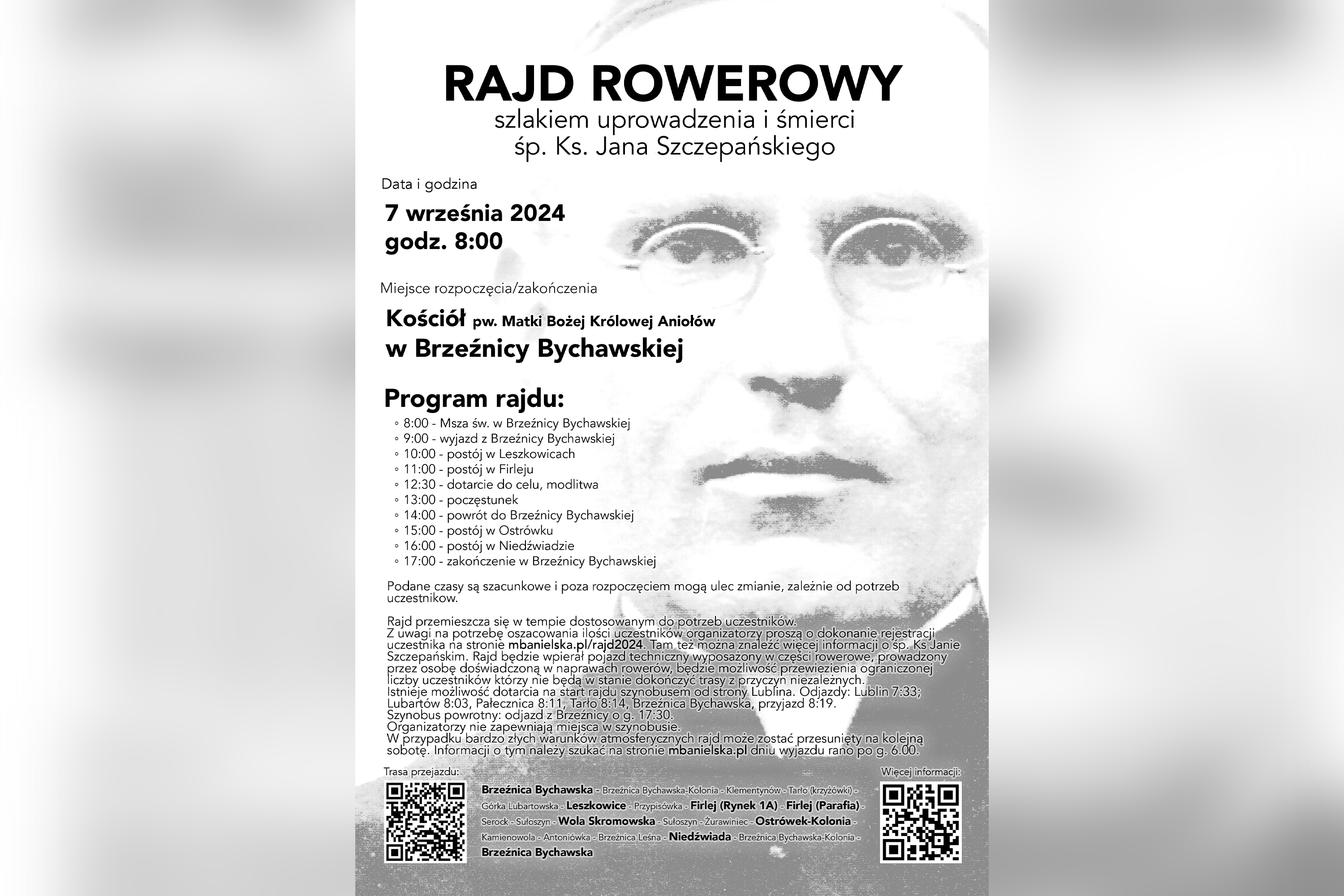 W sobotę 7-go września spod naszego kościoła wyruszy Rajd Rowerowy szlakiem uprowadzenia i śmierci śp. ks. Jana Szczepańskiego, proboszcza naszej parafii w latach 1947-48. Trasa prowadzi do Woli Skromowskiej nad rzekę Wieprz, gdzie zostało odnalezione ciało śp. ks. Jana.