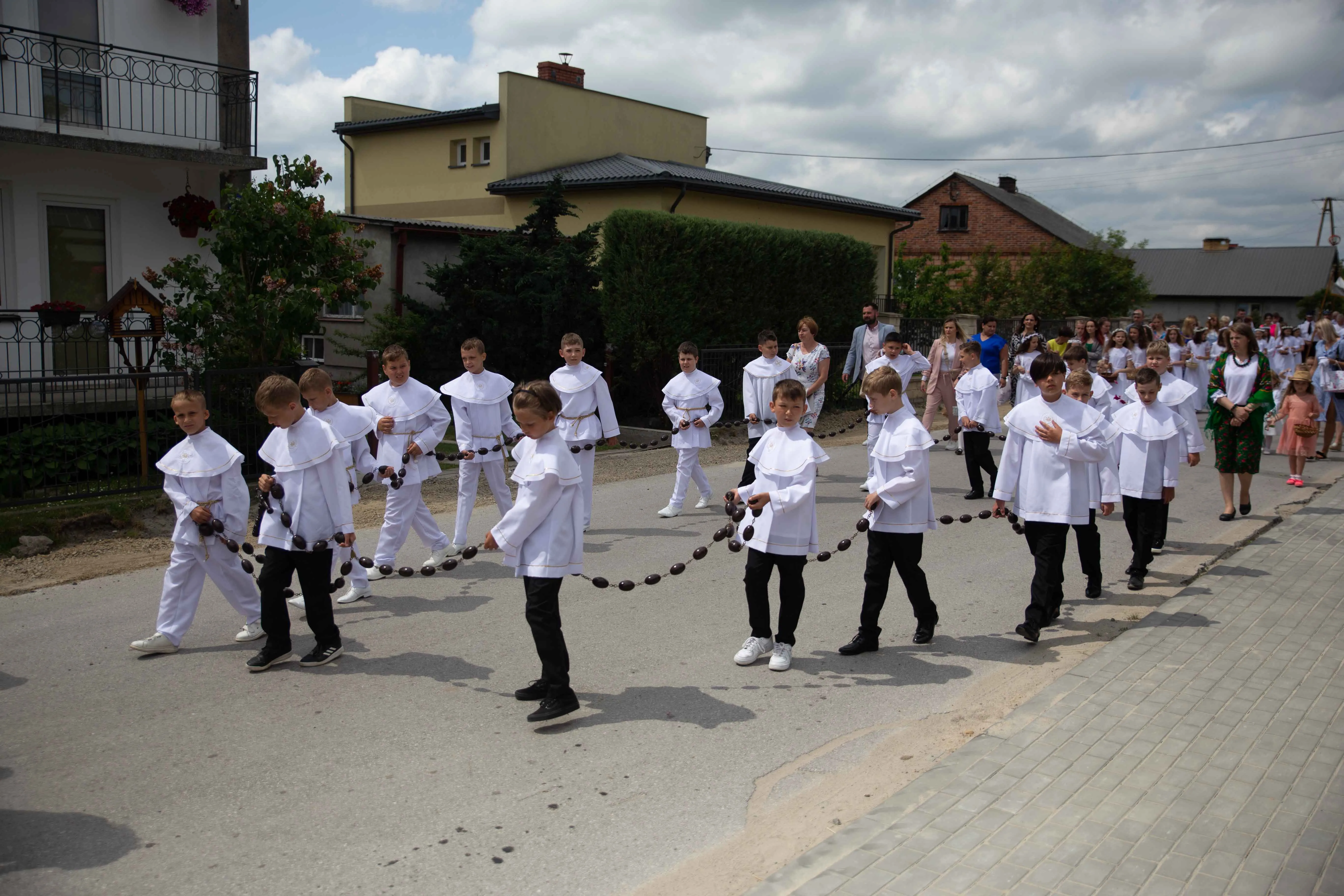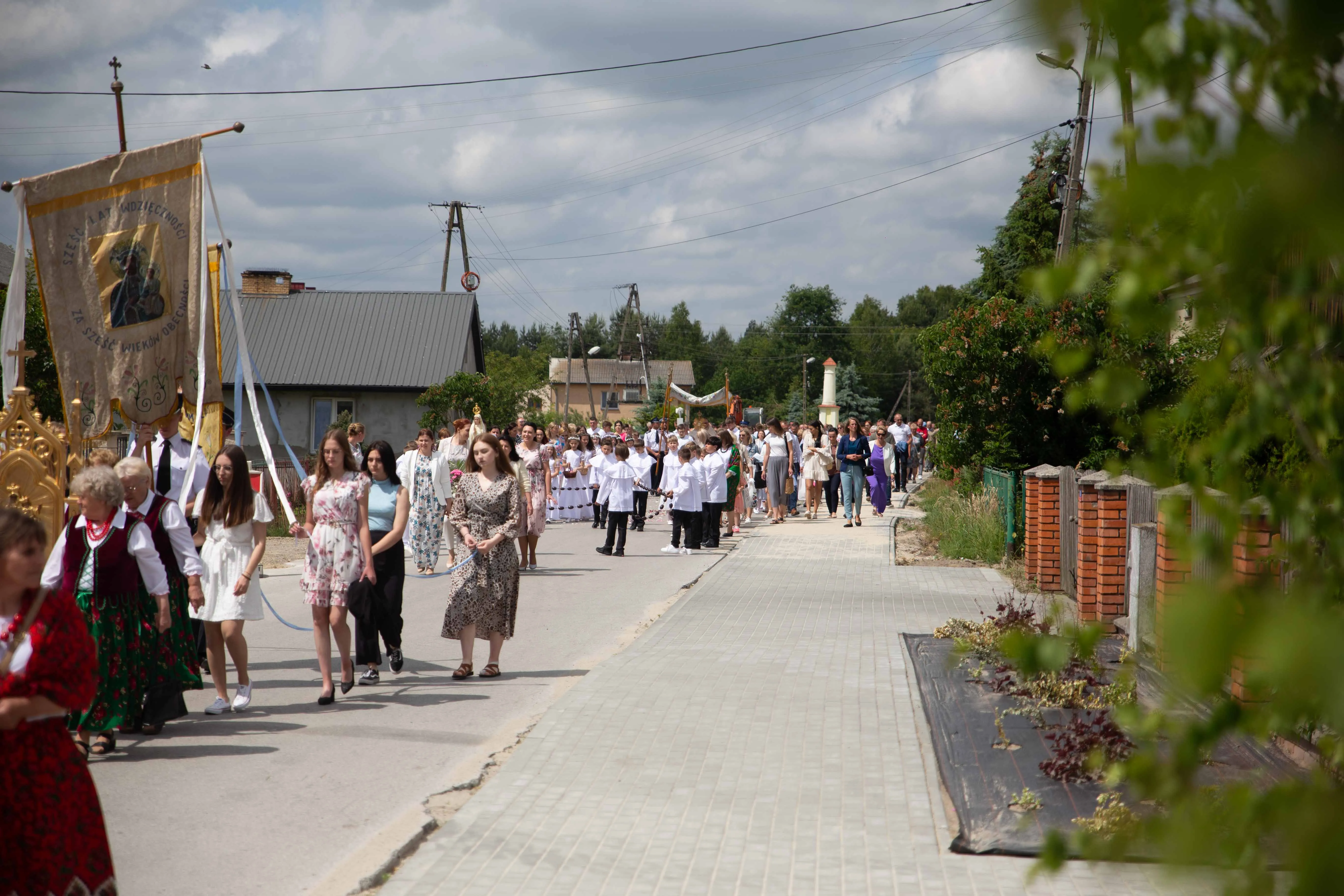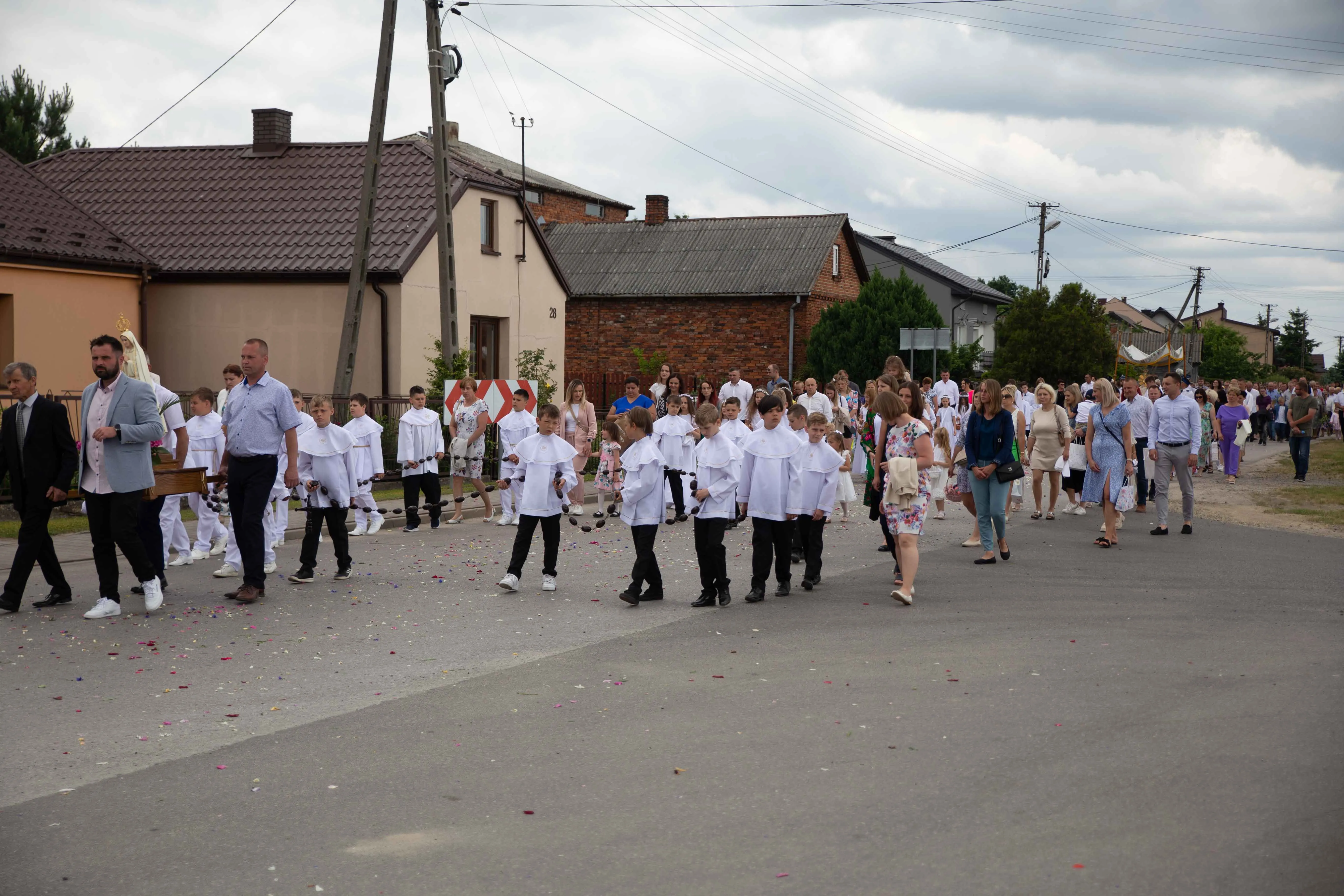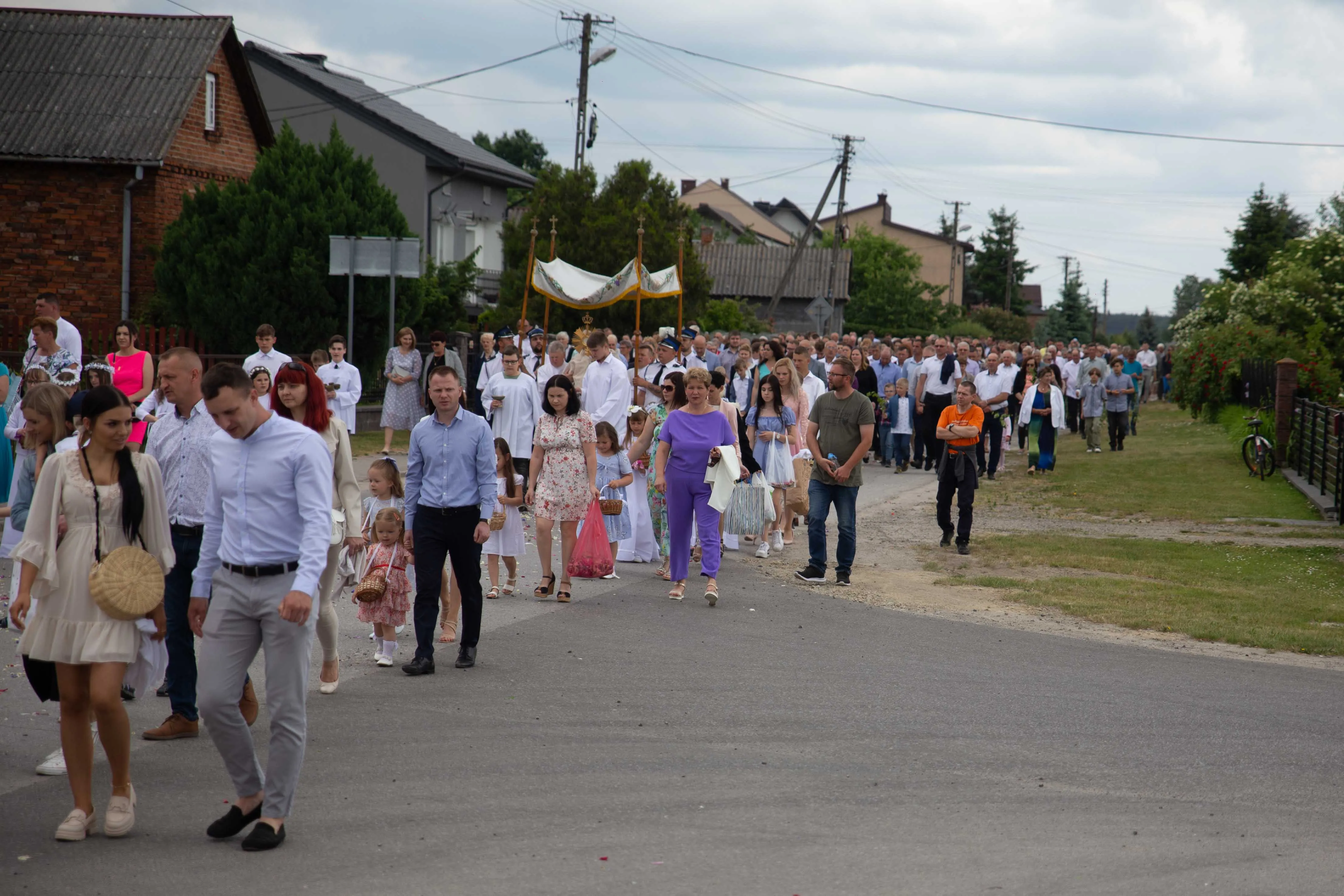 Przy dźwiękach dzwonów, ze śpiewem na ustach barwny orszak procesyjny przemierzał trasę do ustawionych, w tych samych miejscach, co w latach poprzednich, czterech ołtarzy, przygotowanych kolejno przez parafian. Obecne były dzieci pierwszokomunijne i dzieci obchodzące I rocznicę Komunii św. ubrane w białe stroje, dziewczynki sypiące wielobarwne kwiaty, chłopcy w komżach nieśli różaniec. Niesiono kościelne chorągwie i feretrony oraz figurę Matki Bożej Fatimskiej. Przy każdym z ołtarzy kapłan czytał fragmenty poszczególnych Ewangelii. Śpiewano suplikacje, hymn "Ciebie Boga wysławiamy", a na zakończenie ksiądz proboszcz pobłogosławił uczestników procesji Najświętszym Sakramentem. Na zakończenie podziękował za przygotowanie ołtarzy, za udział w procesji i jej uświetnienie przez, strażaków, młodzież, Koła Gospodyń i dzieci.