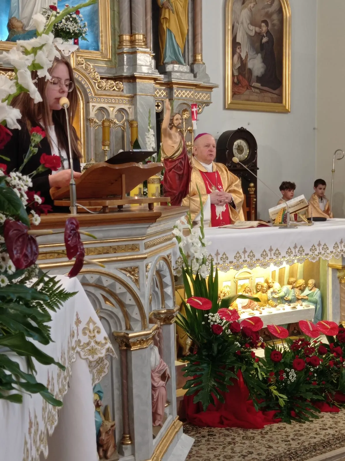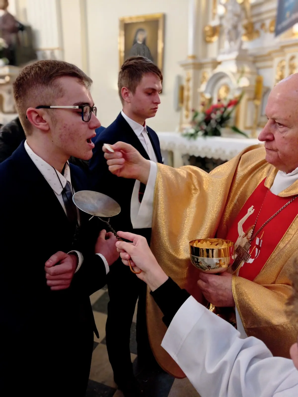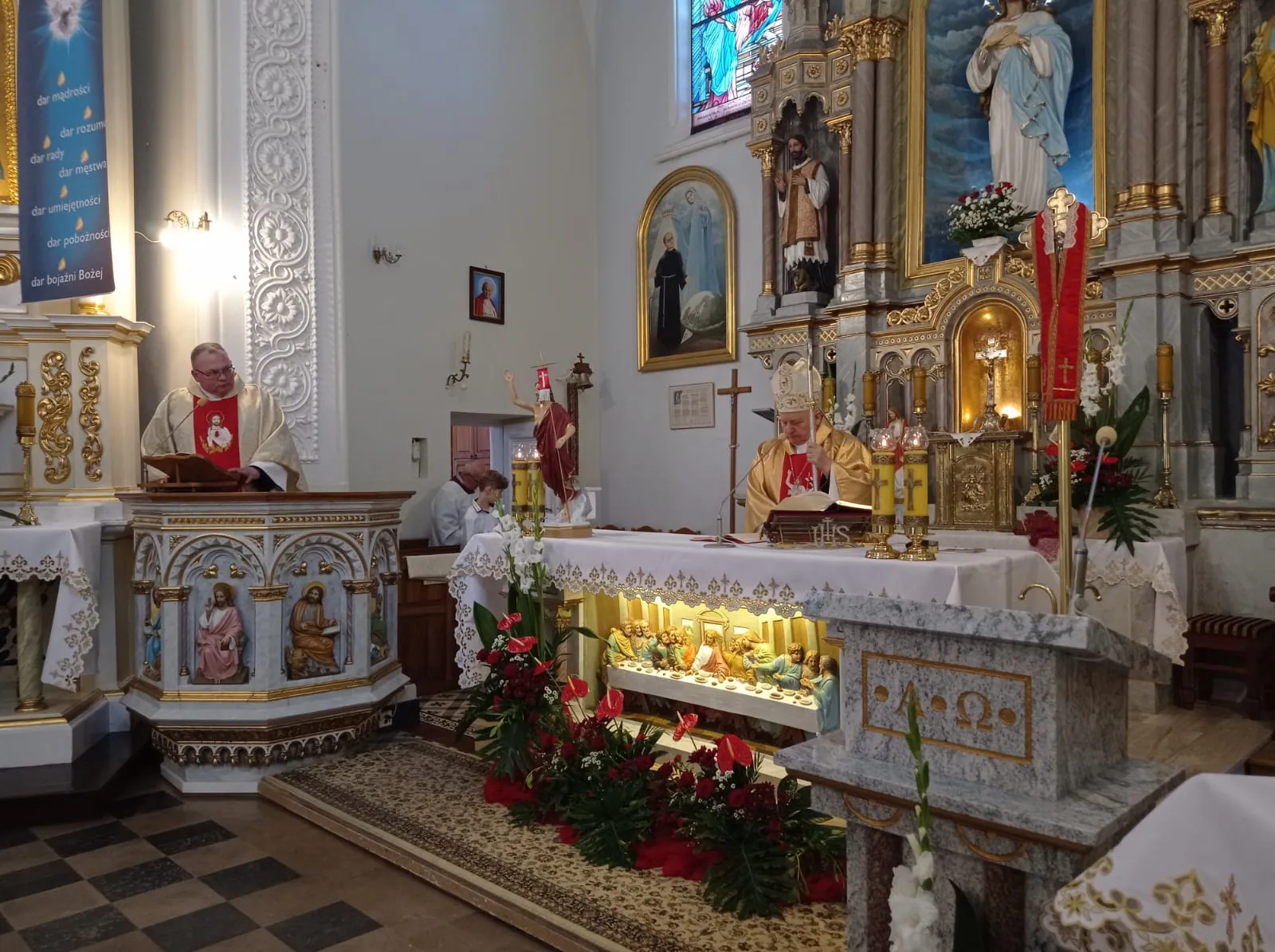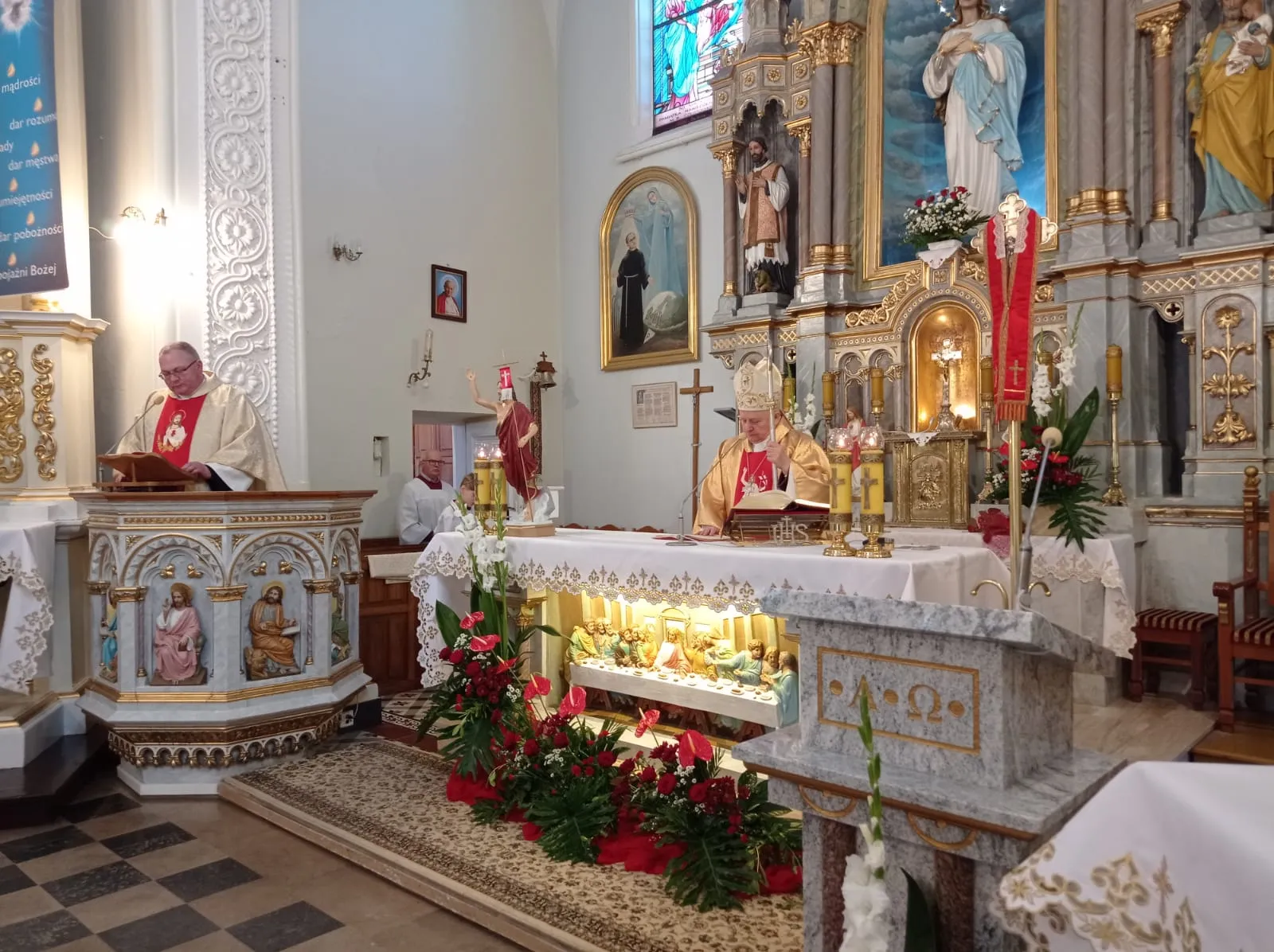 O godz. 10.00 rozpoczęła się uroczysta Eucharystia. Na samym początku przedstawiciele rodziców witając ks. biskupa poprosili o udzielenie ich dzieciom sakramentu dojrzałości chrześcijańskiej. Po Ewangelii ks. biskup przeprowadził dialog z ks. proboszczem pytając czy młodzież jest przygotowana do przyjęcia tego sakramentu. Ks. proboszcz zaświadczył, że są godni przyjęcia tego sakramentu, że przygotowywali się do niego przez rok. Następnie sama młodzież musiała wyrazić chęć przyjęcia go i powiedzenia czego oczekują.Po homilii, którą wygłosił ks. biskup, kandydaci odnowili przyrzeczenia chrzcielne. I nadszedł moment udzielenia sakramentu bierzmowania. Najpierw ks. biskup i ksiądz Grzegorz z wyciągniętymi nad kandydatami rękami odmówili modlitwę. Po niej nadszedł moment namaszczenia krzyżmem św. czoła każdego bierzmowanego. Po Komunii św. młodzież wyraziła swoje podziękowanie najpierw ks. biskupowi, następnie księdzu proboszczowi, wychowawcom, świadkom i wszystkim którzy pomogli im właściwie przygotować się do przyjęcia tego sakramentu i otaczali ich swoją modlitwą.Niech na co dzień doświadczają Ducha Świętego, który rozlewa Bożą miłość w naszych sercach i uczą się żyć darami Ducha, które potrzebę są każdego dnia, by być silnym w Panu mocą Jego potęgi.