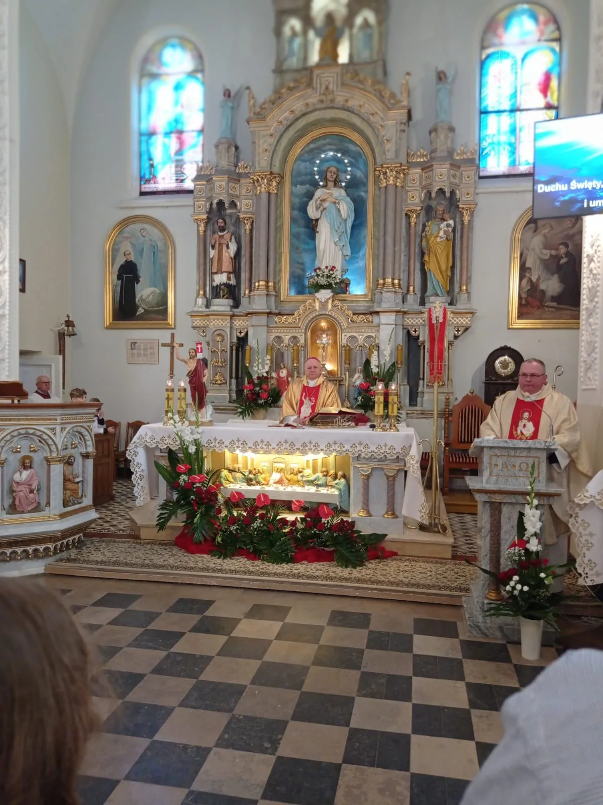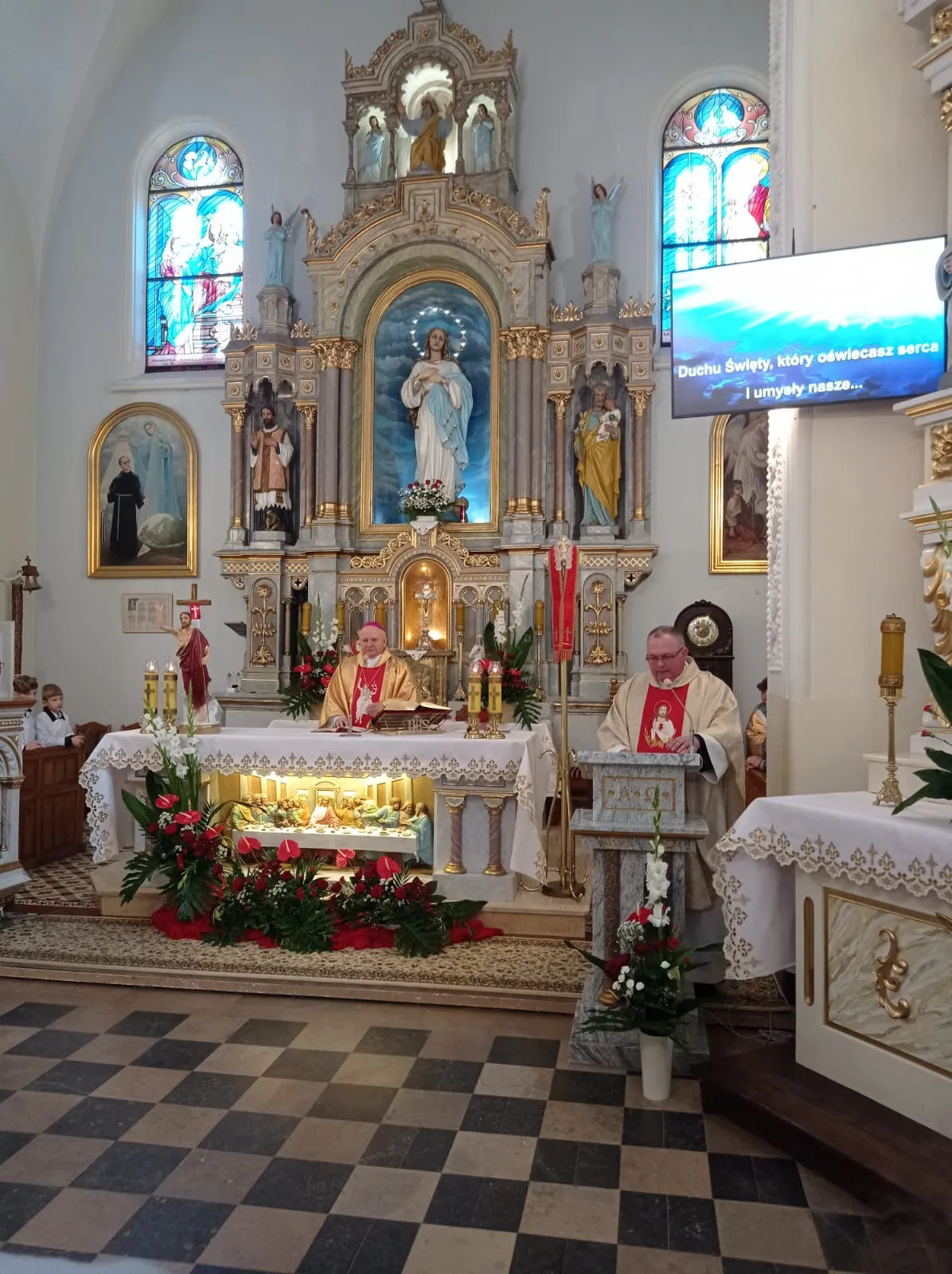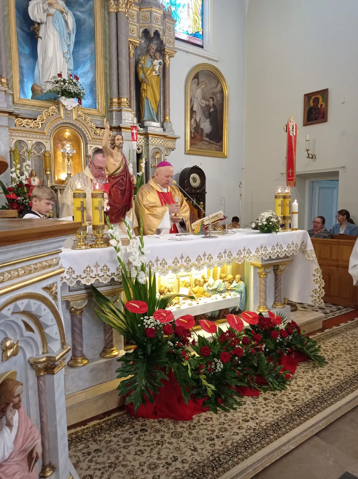 O godz. 10.00 rozpoczęła się uroczysta Eucharystia. Na samym początku przedstawiciele rodziców witając ks. biskupa poprosili o udzielenie ich dzieciom sakramentu dojrzałości chrześcijańskiej. Po Ewangelii ks. biskup przeprowadził dialog z ks. proboszczem pytając czy młodzież jest przygotowana do przyjęcia tego sakramentu. Ks. proboszcz zaświadczył, że są godni przyjęcia tego sakramentu, że przygotowywali się do niego przez rok. Następnie sama młodzież musiała wyrazić chęć przyjęcia go i powiedzenia czego oczekują.Po homilii, którą wygłosił ks. biskup, kandydaci odnowili przyrzeczenia chrzcielne. I nadszedł moment udzielenia sakramentu bierzmowania. Najpierw ks. biskup i ksiądz Grzegorz z wyciągniętymi nad kandydatami rękami odmówili modlitwę. Po niej nadszedł moment namaszczenia krzyżmem św. czoła każdego bierzmowanego. Po Komunii św. młodzież wyraziła swoje podziękowanie najpierw ks. biskupowi, następnie księdzu proboszczowi, wychowawcom, świadkom i wszystkim którzy pomogli im właściwie przygotować się do przyjęcia tego sakramentu i otaczali ich swoją modlitwą.Niech na co dzień doświadczają Ducha Świętego, który rozlewa Bożą miłość w naszych sercach i uczą się żyć darami Ducha, które potrzebę są każdego dnia, by być silnym w Panu mocą Jego potęgi.
