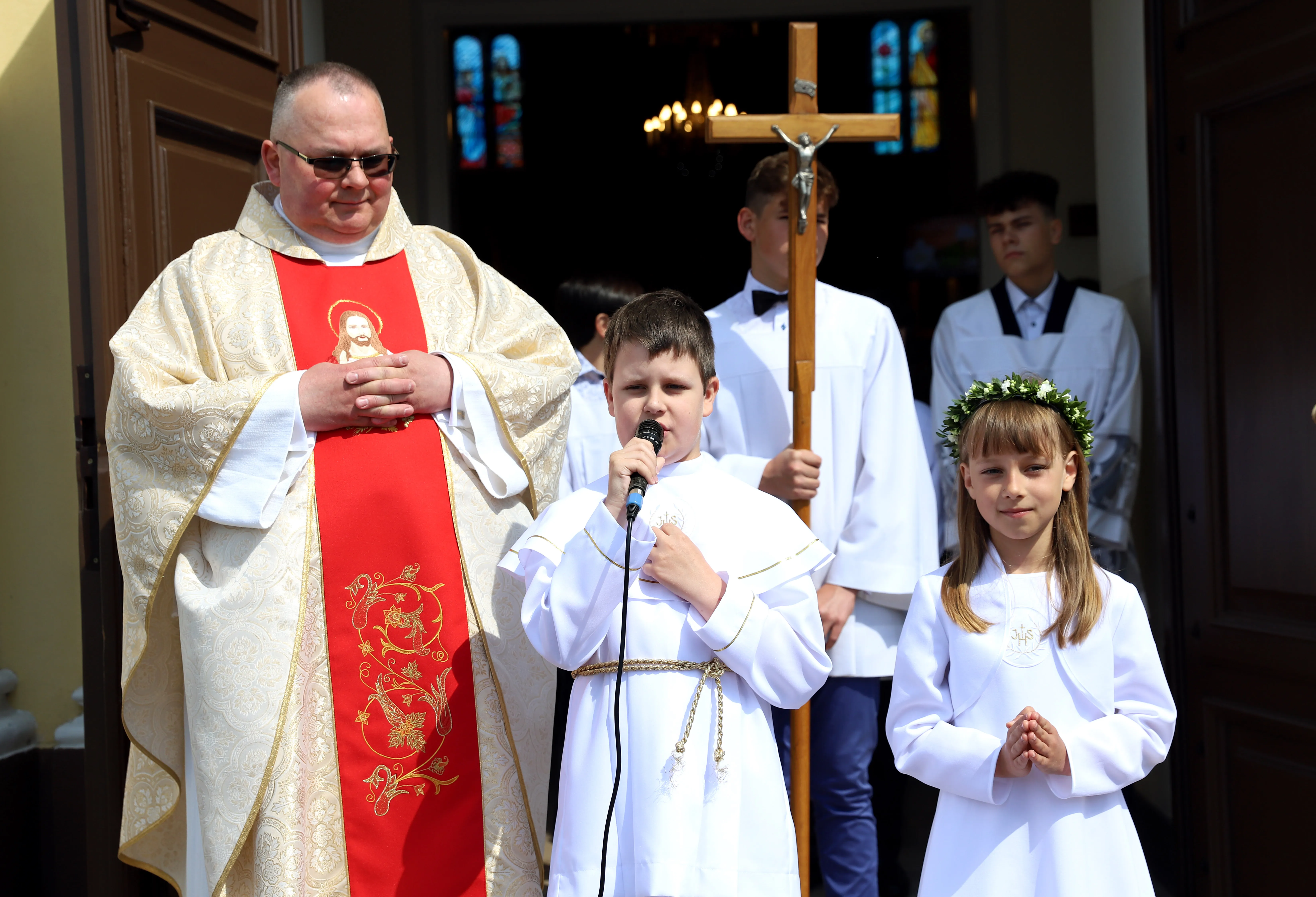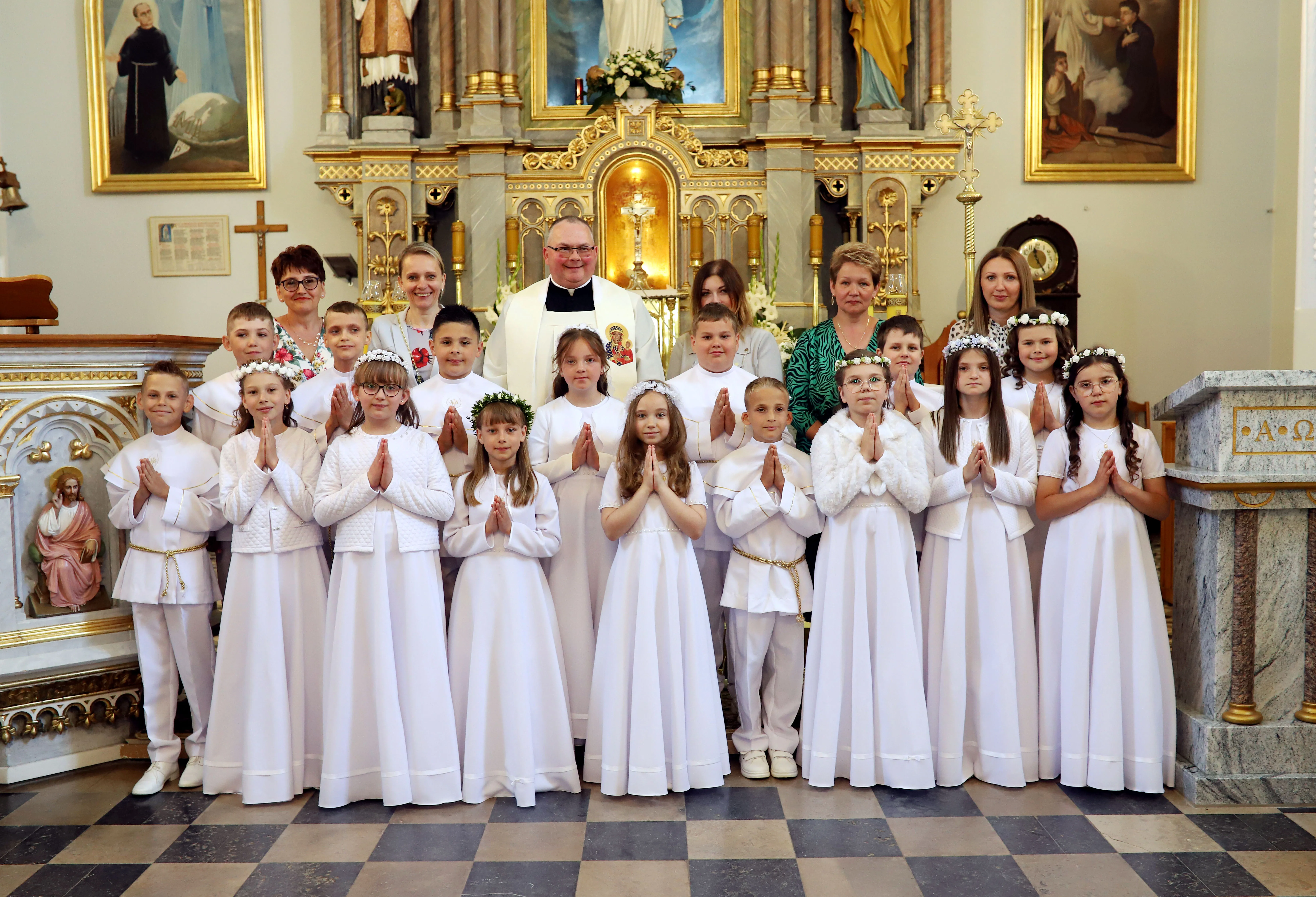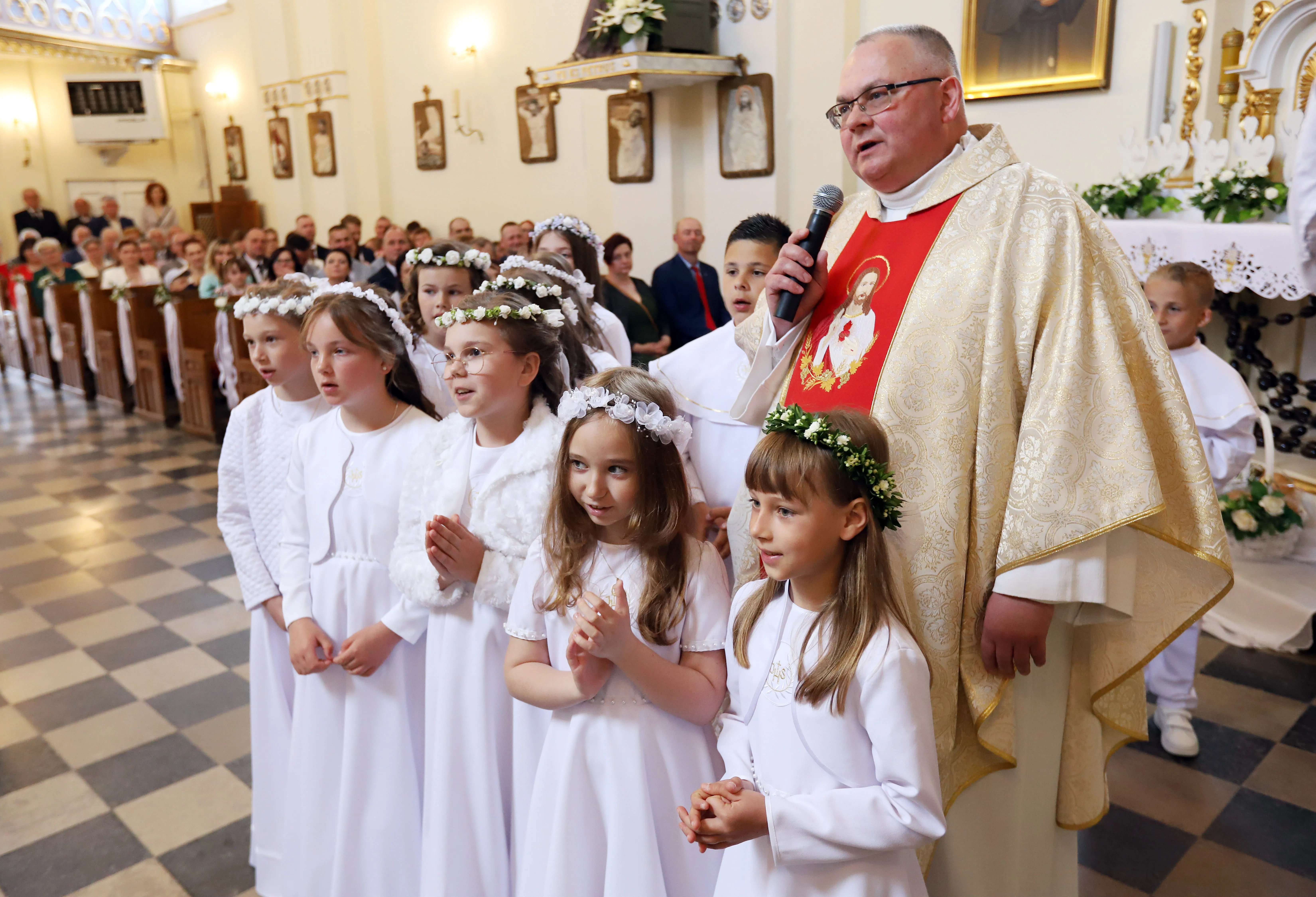 Grupa 16 uczniów z klasy trzeciej szkoły podstawowej po raz pierwszy w pełni uczestniczyła w ofierze Mszy Świętej. W czasie uroczystej Eucharystii odprawionej przez księdza proboszcza Grzegorza Warchuła dzieci przyjęły do swoich serc Ciało Boże pod postacią Najświętszej Hostii. W intencji dzieci i ich rodziców modliły się całe rodziny i licznie zgromadzeni goście.