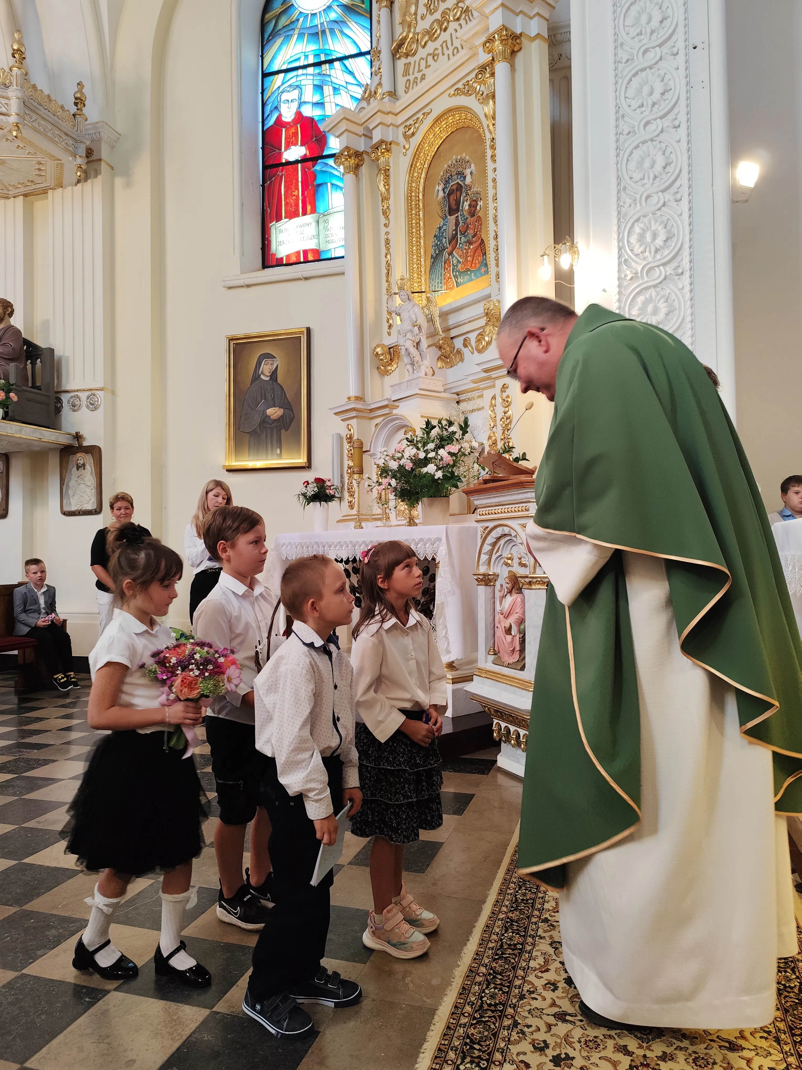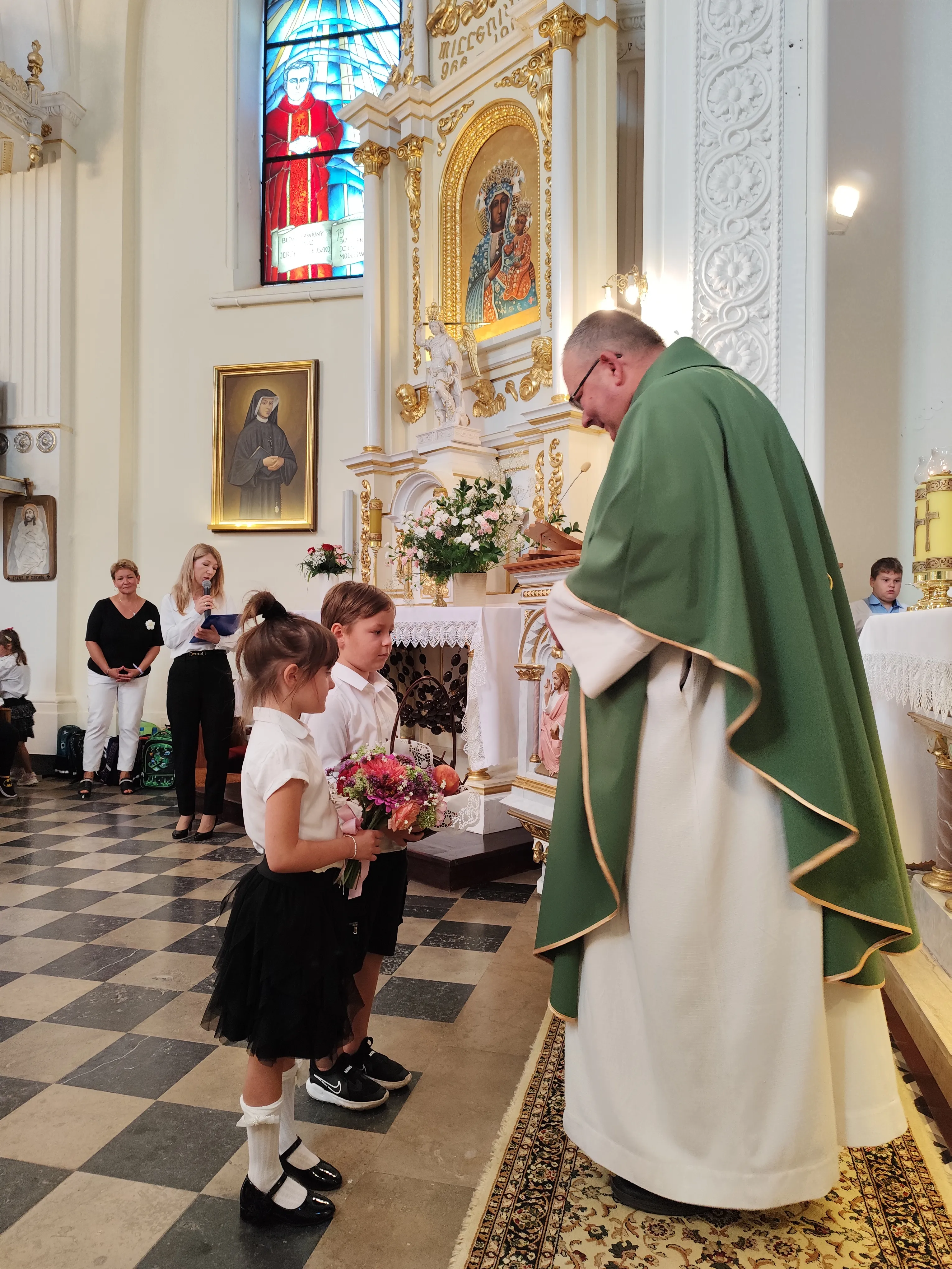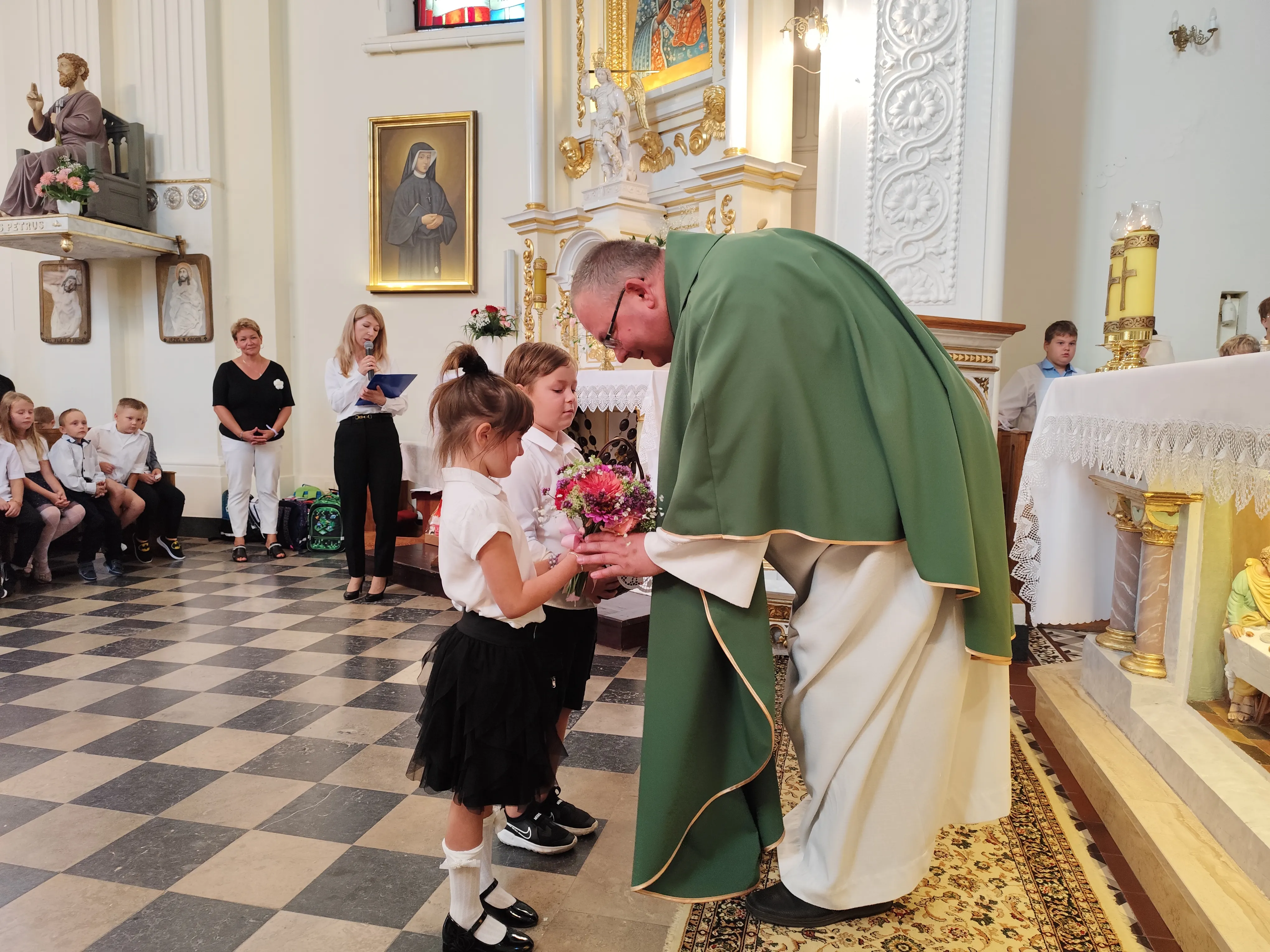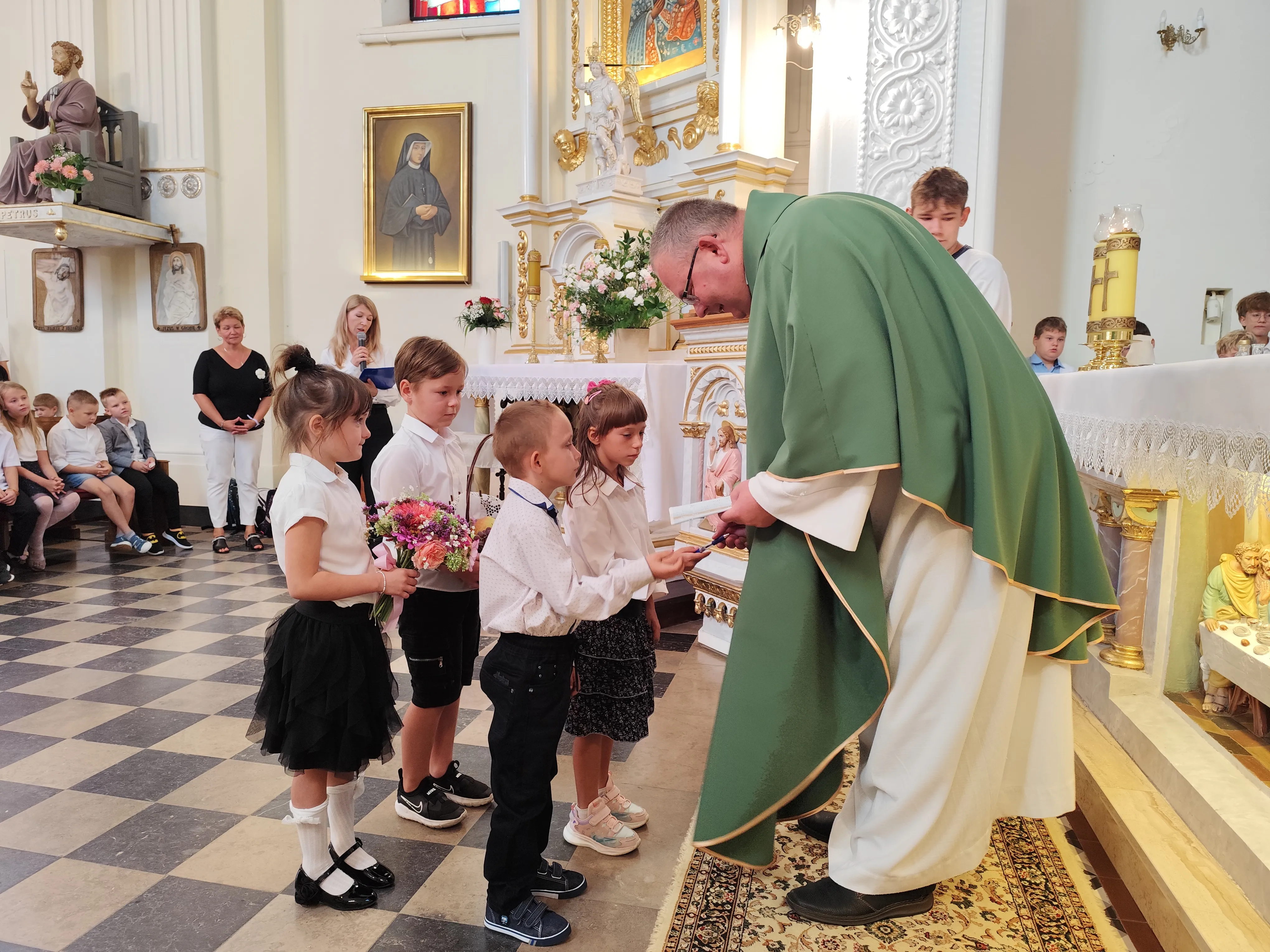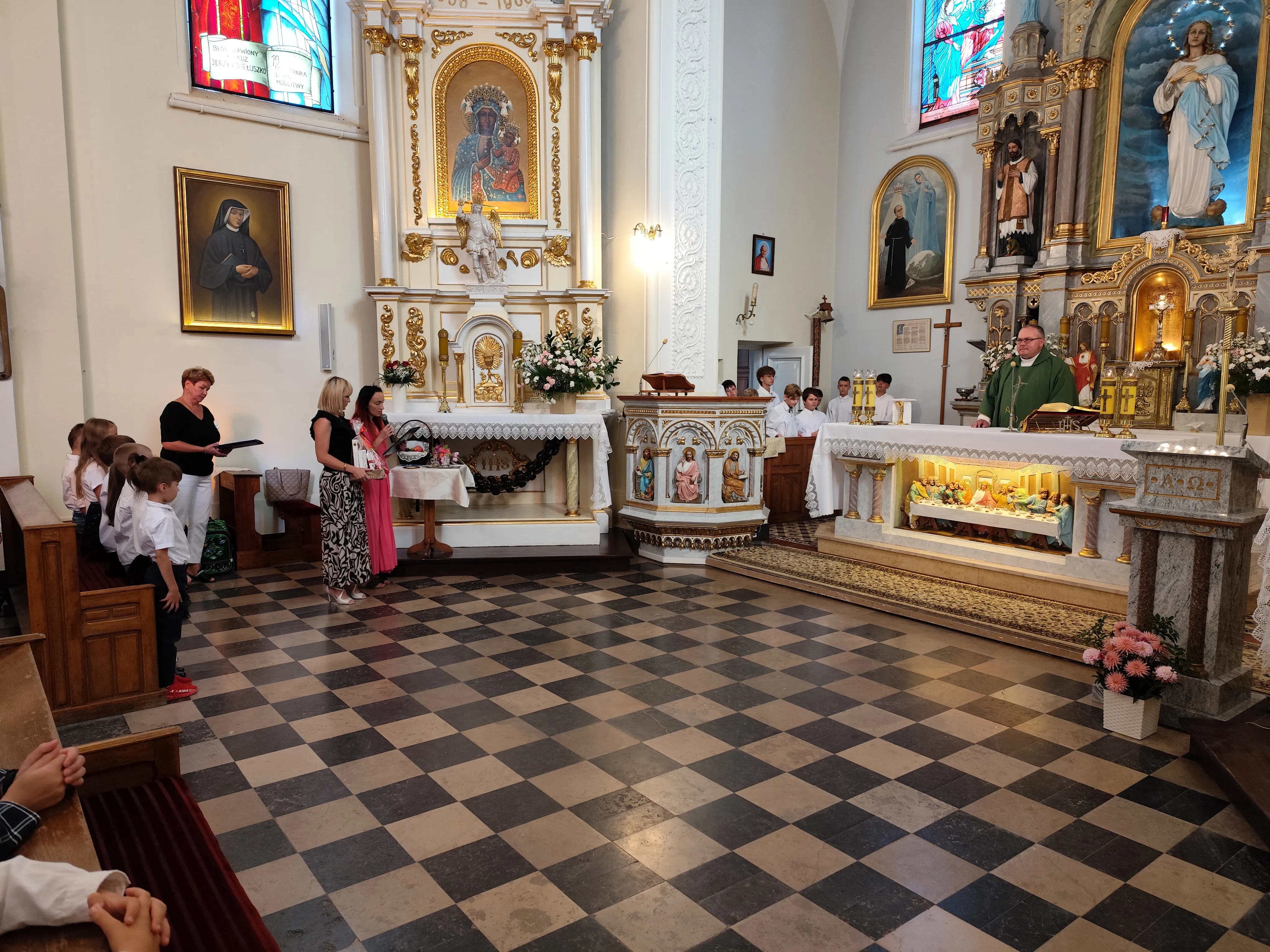 Na początku Eucharystii zebranych uczniów, członków ich rodzin oraz nauczycieli powitał ks. proboszcz. Zapewnił zebranych uczniów, że w naszej szkole zadbamy zarówno o ich rozwój intelektualny, jak też duchowy, ale również o budującą atmosferę wzajemnej życzliwości.Po mszy św. uczniowie pod opieką rodziców udali się do szkoły, gdzie zostali zapoznani z najważniejszymi informacjami dotyczącymi organizacji nowego roku szkolnego.