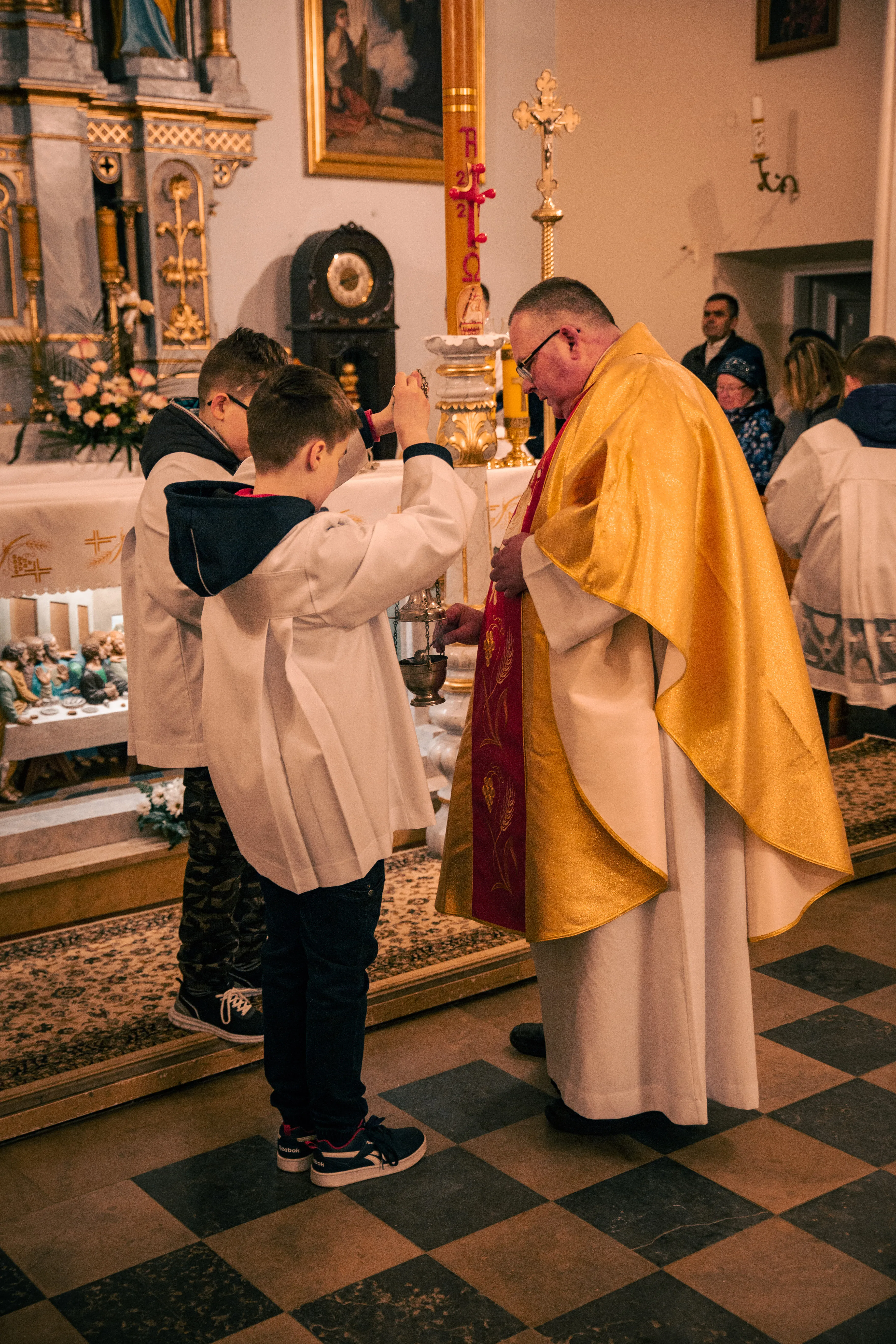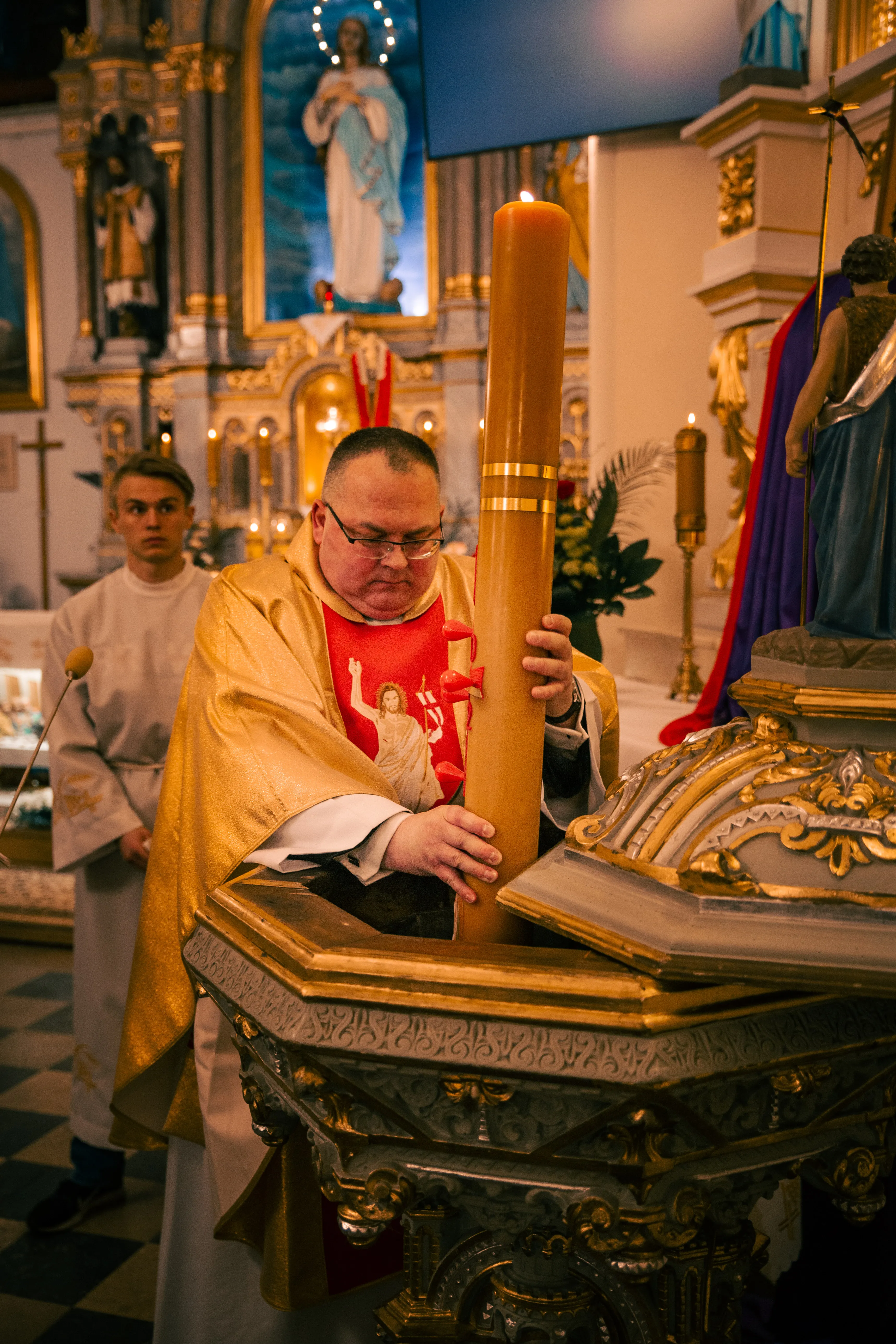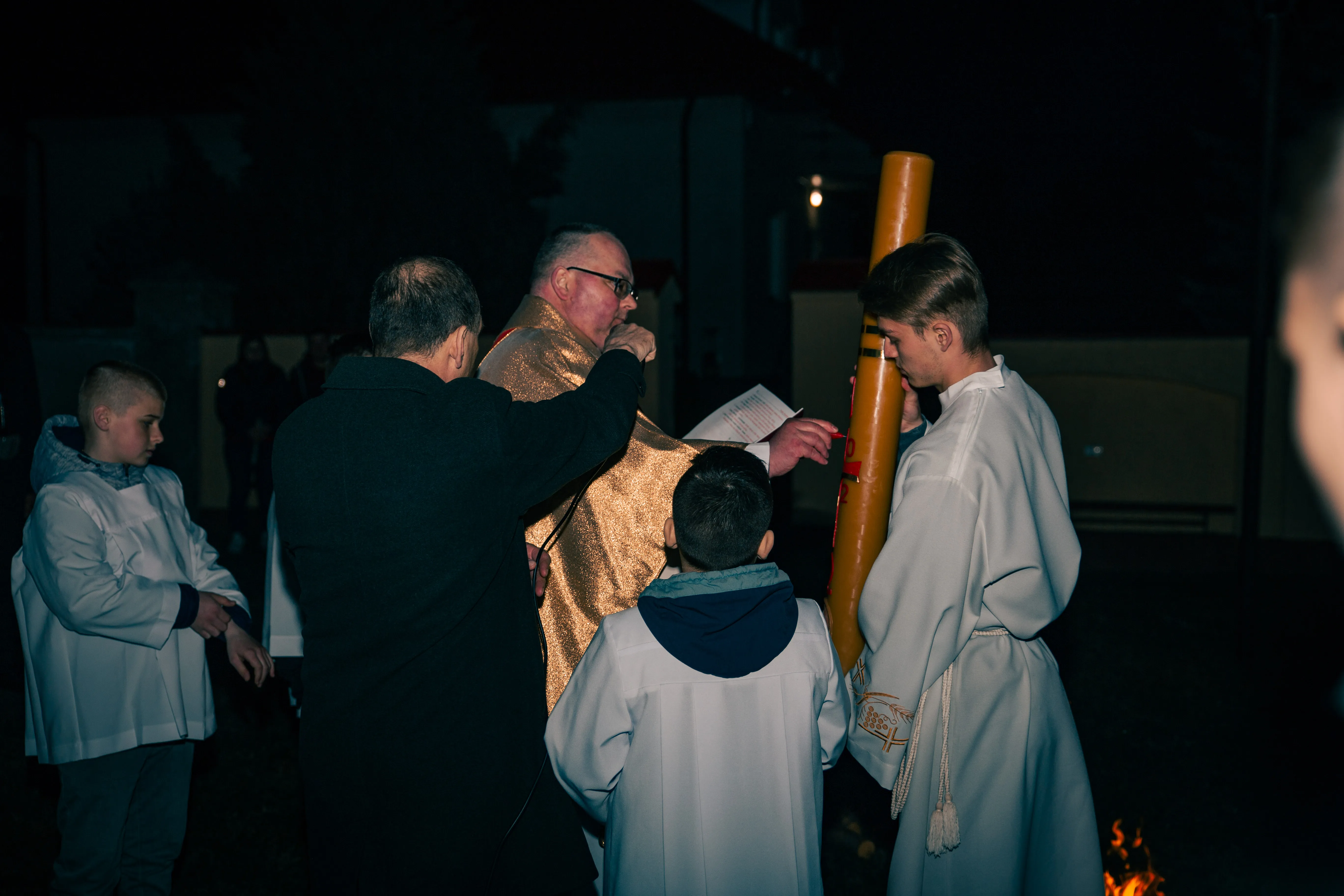 Wielka Sobota 16.04.2022 r. – to przedostatni dzień Wielkiego Tygodnia, poprzedzający święto Zmartwychwstania. W Kościele dzień ten jest dniem wyciszenia i oczekiwania na przyjście Chrystusa. Od wczesnych godzin rannych katolicy adorują Najświętszy Sakrament w Grobie Pańskim. Tradycyjnie w naszej parafii przy Grobie Pańskim czuwają dziewczynki, strażacy i parafianie. Tradycyjnie w tym dniu, przed południem błogosławi się pokarmy na stół wielkanocny. Po zapadnięciu zmroku odprawiana jest msza Wigilii Paschalnej, na która składa się: Liturgia Światła, Liturgia Słowa Bożego, Liturgia Chrzcielna, Liturgia Eucharystyczna.