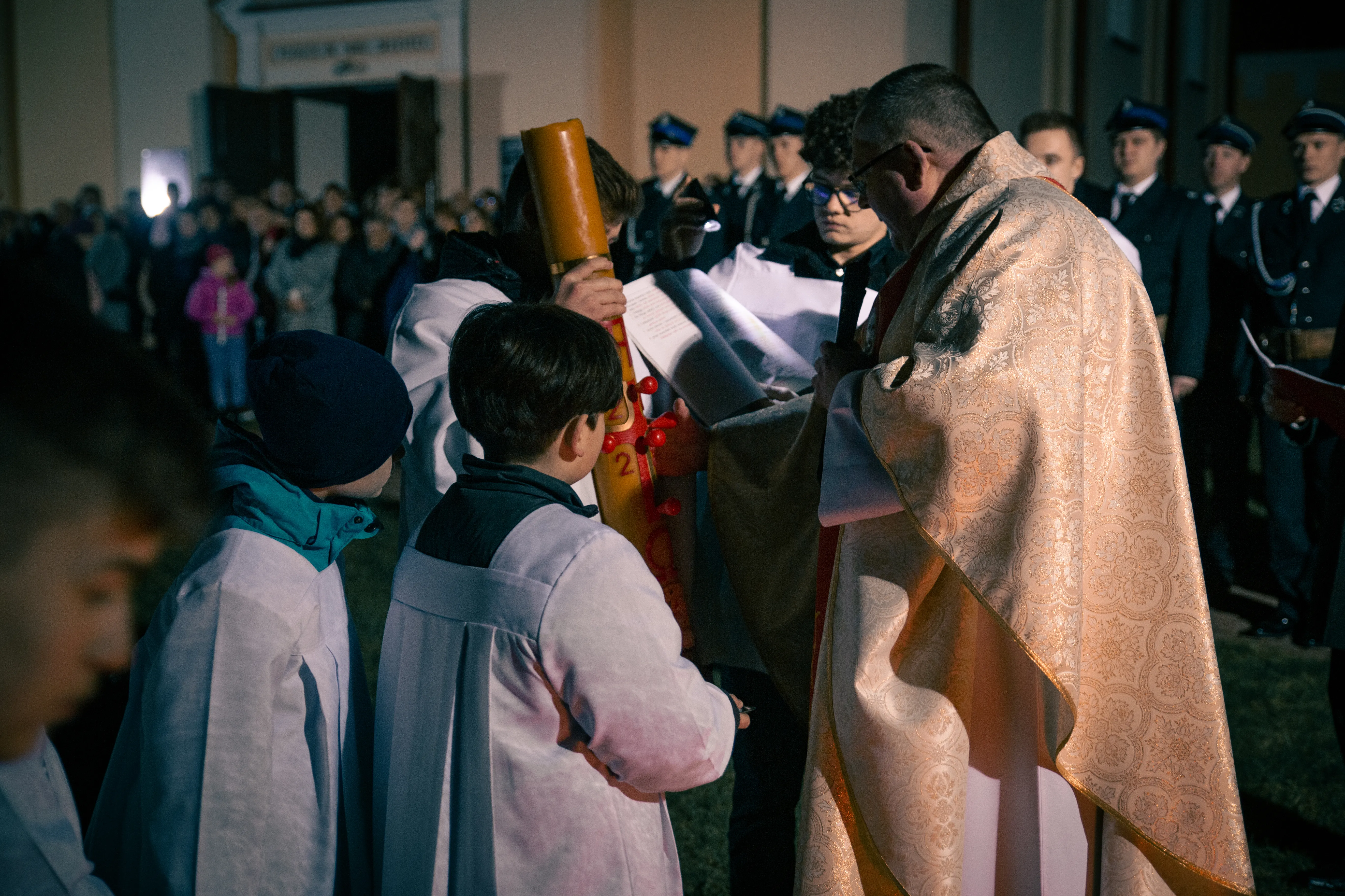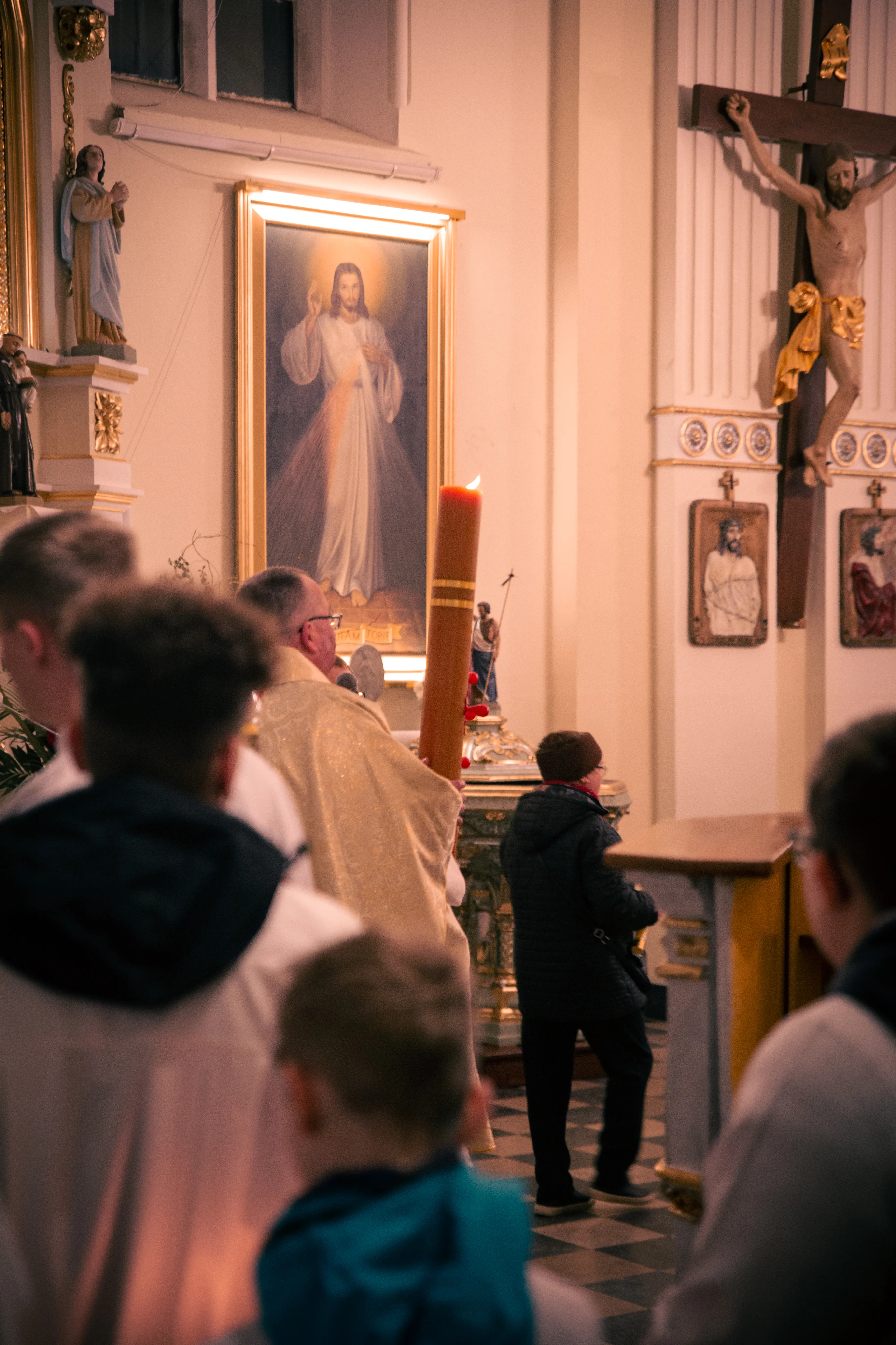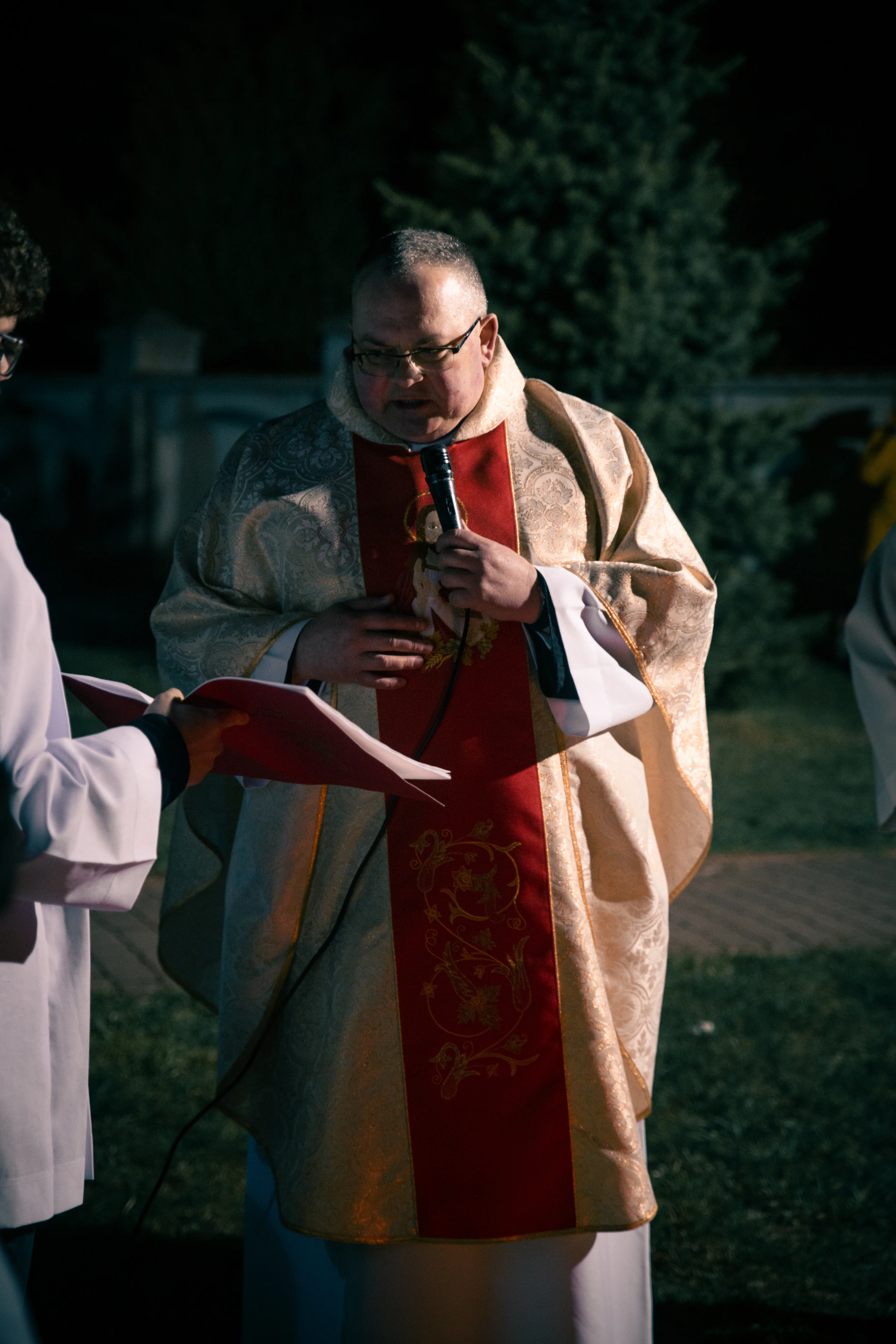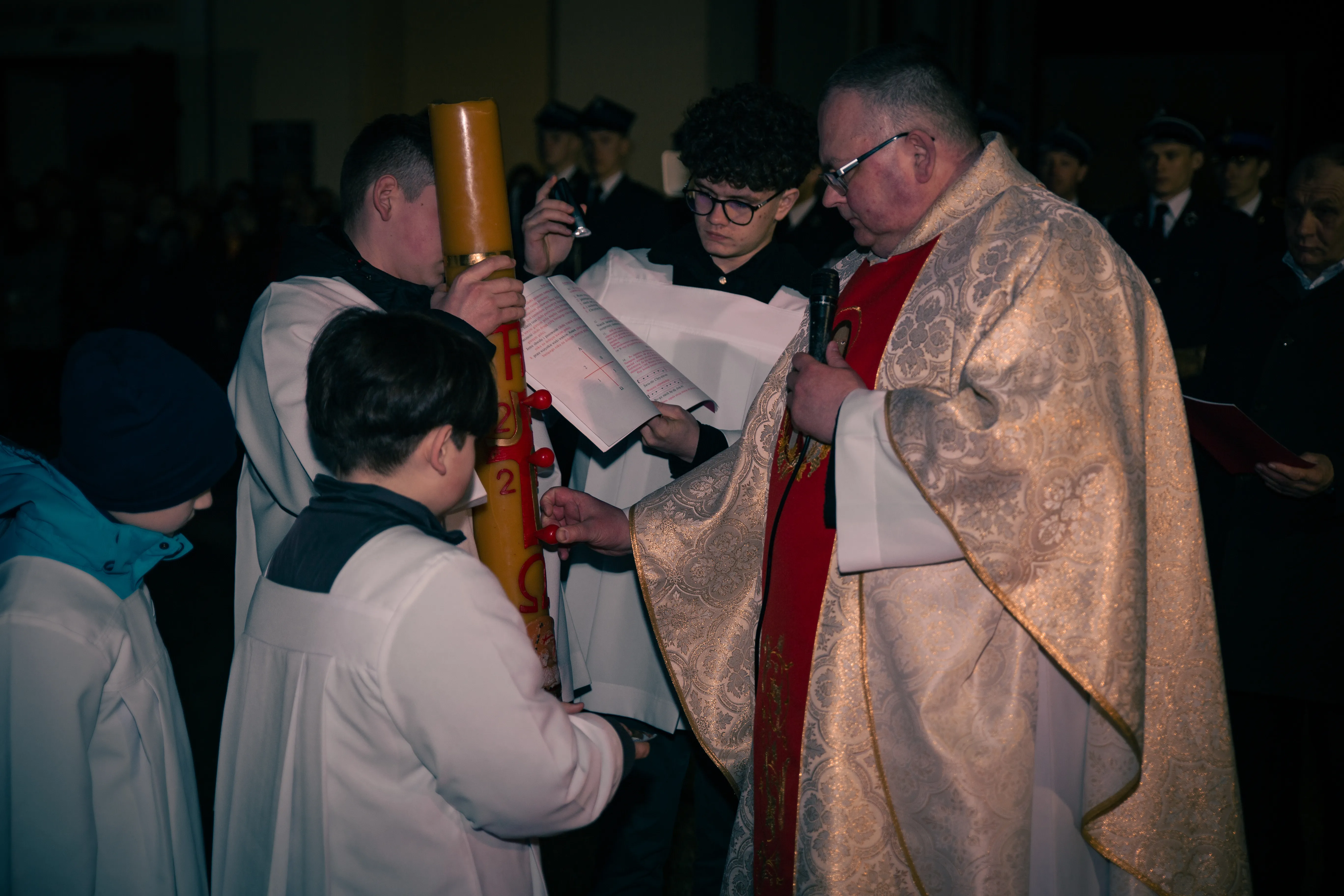 Po zapadnięciu zmroku odprawiana jest msza Wigilii Paschalnej, na która składa się: Liturgia Światła, Liturgia Słowa Bożego, Liturgia Chrzcielna, Liturgia Eucharystyczna.