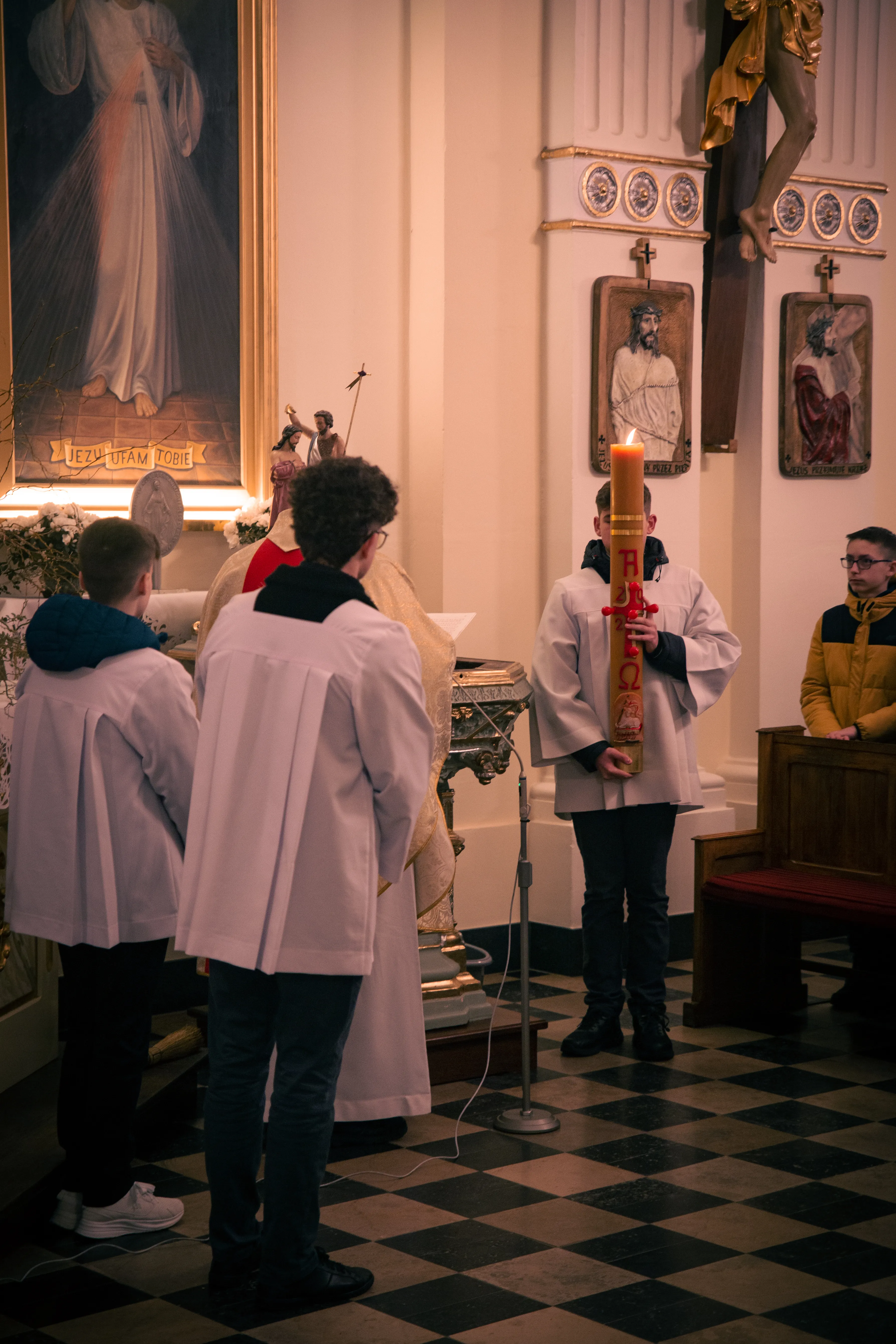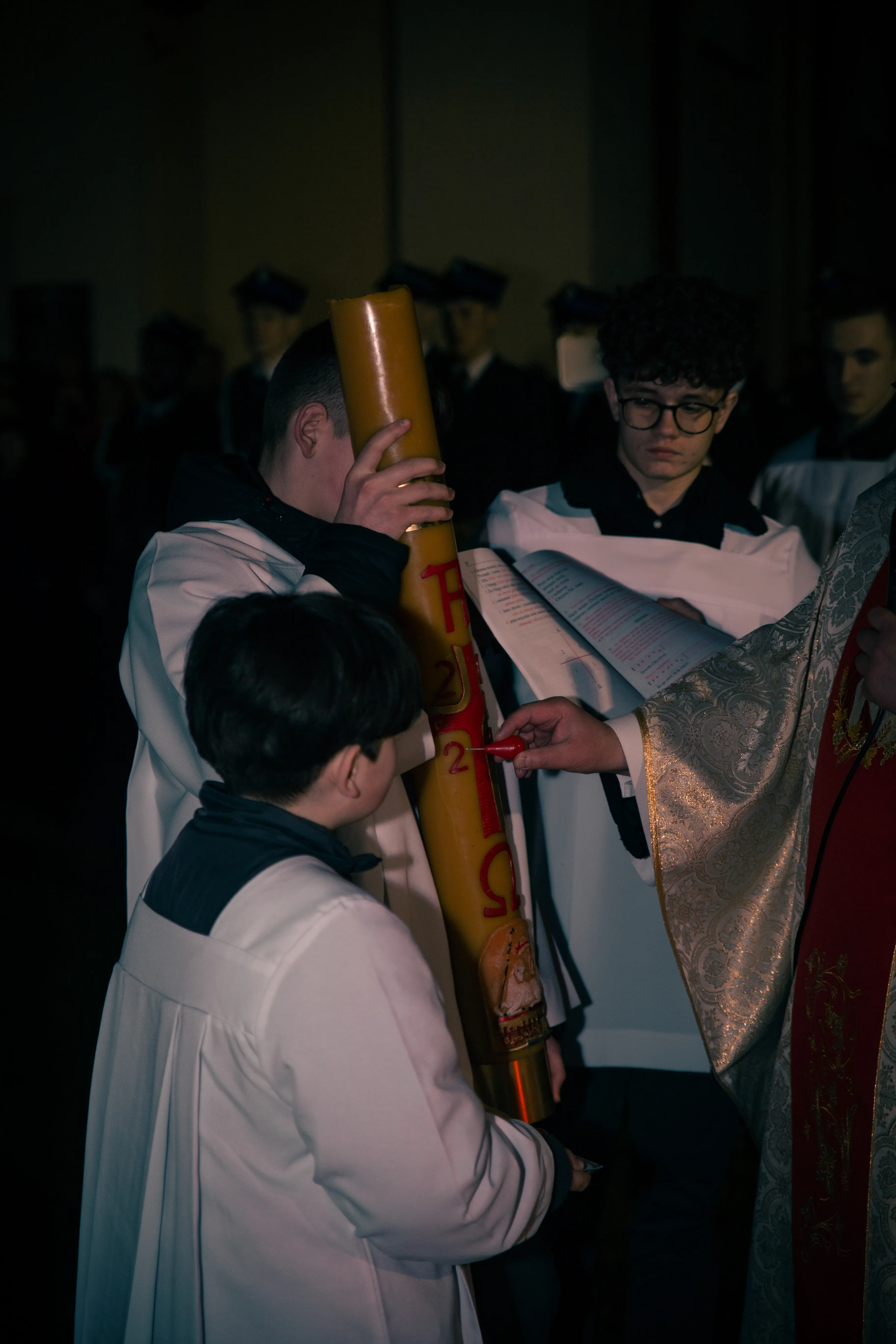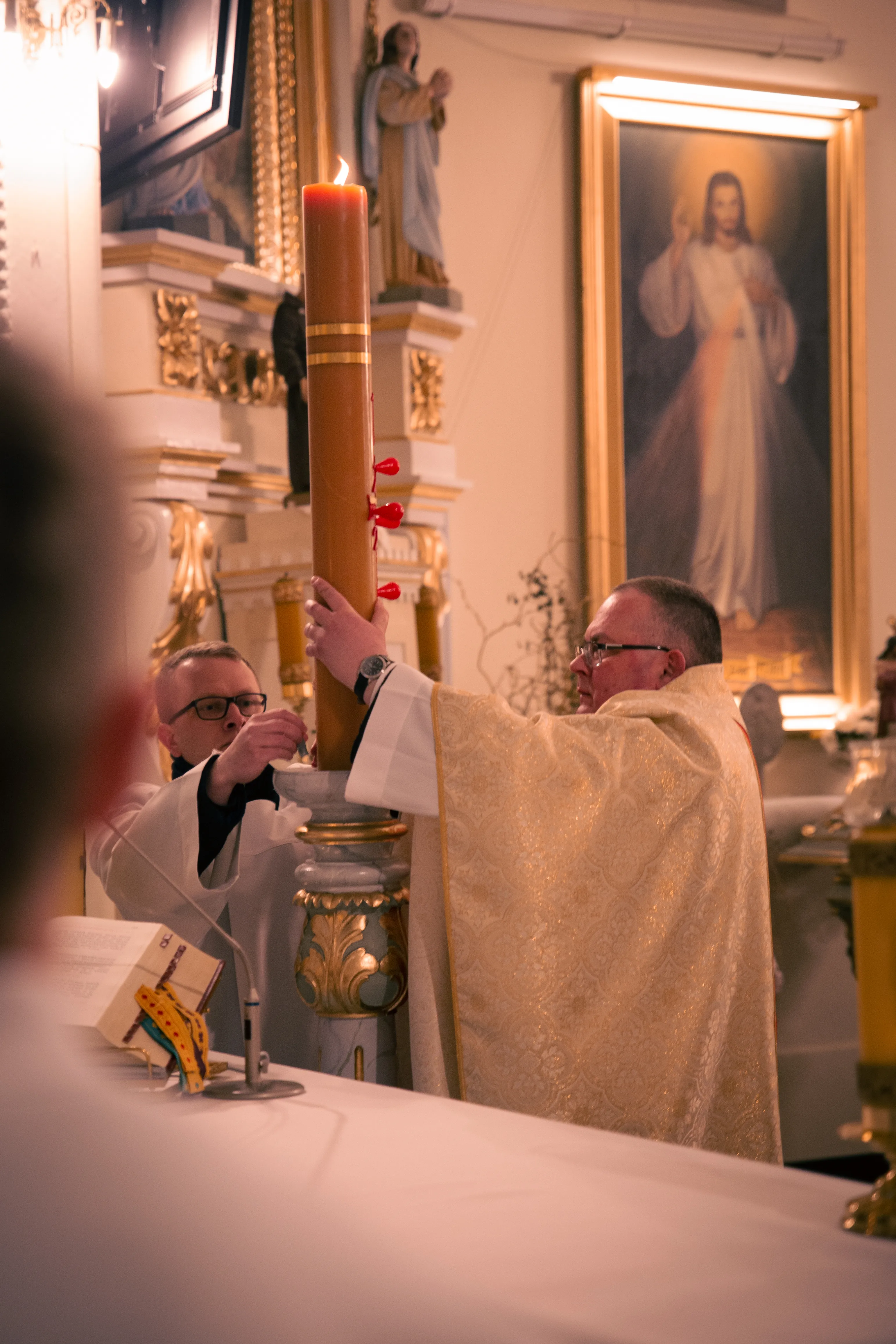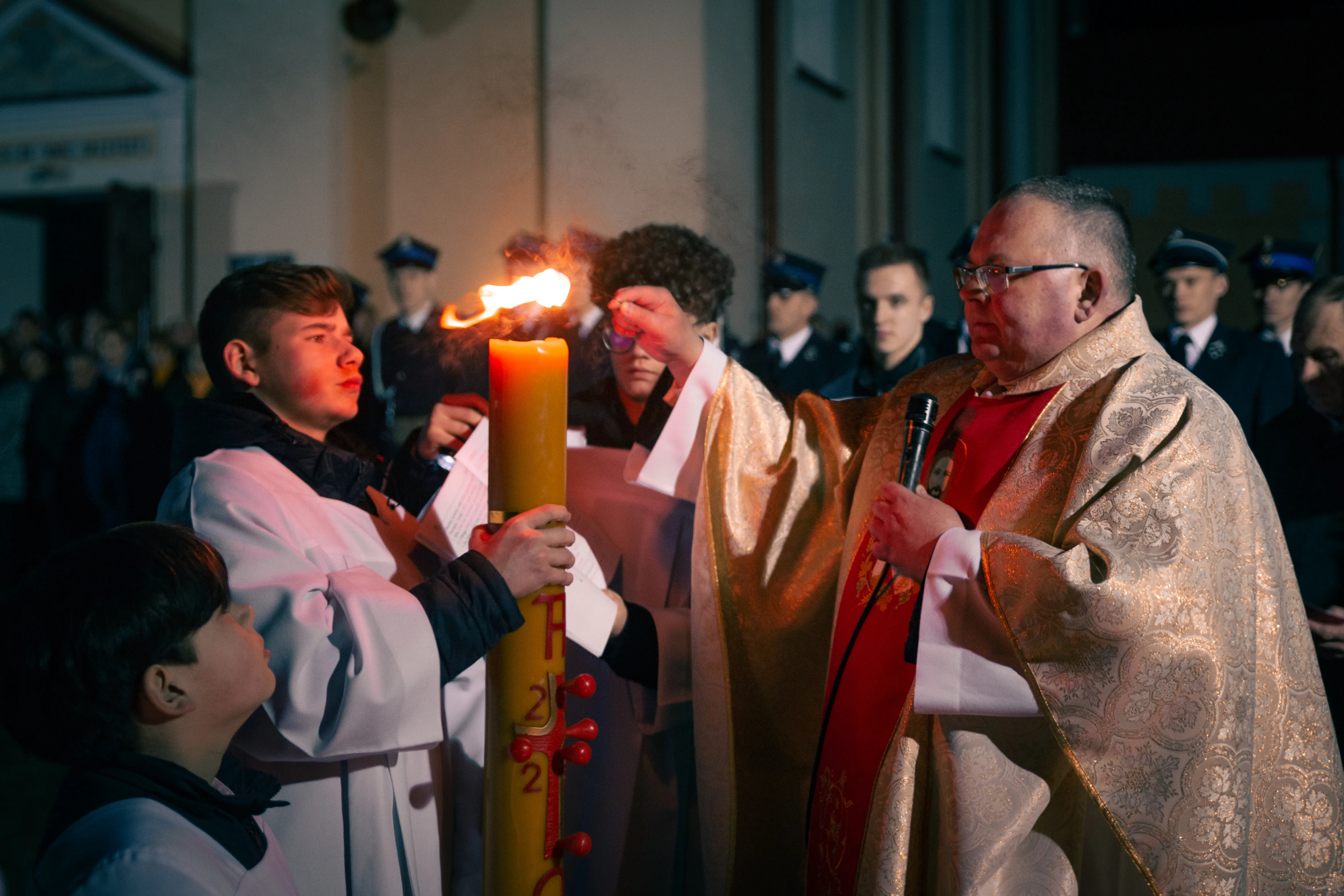 Po zapadnięciu zmroku odprawiana jest msza Wigilii Paschalnej, na która składa się: Liturgia Światła, Liturgia Słowa Bożego, Liturgia Chrzcielna, Liturgia Eucharystyczna.