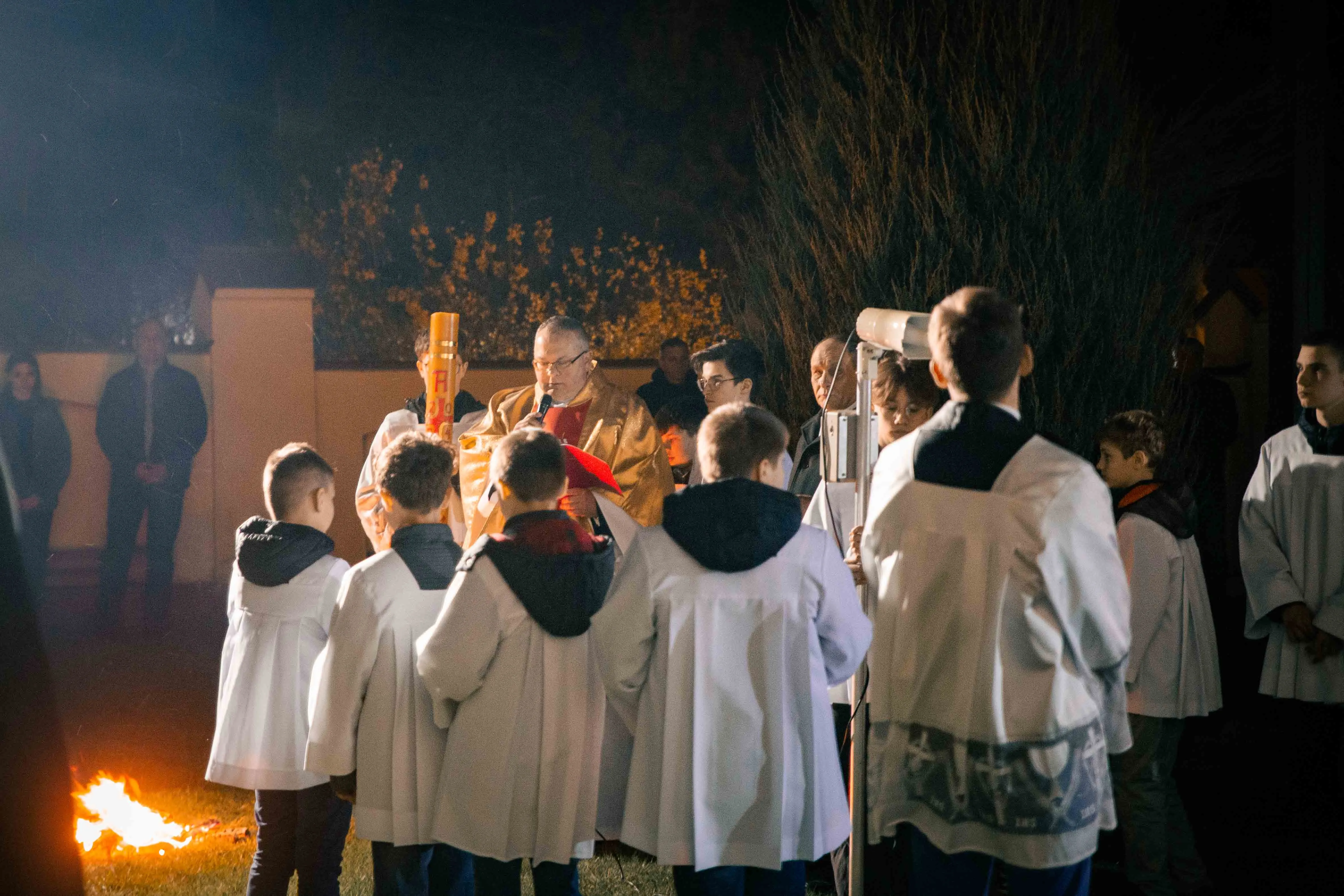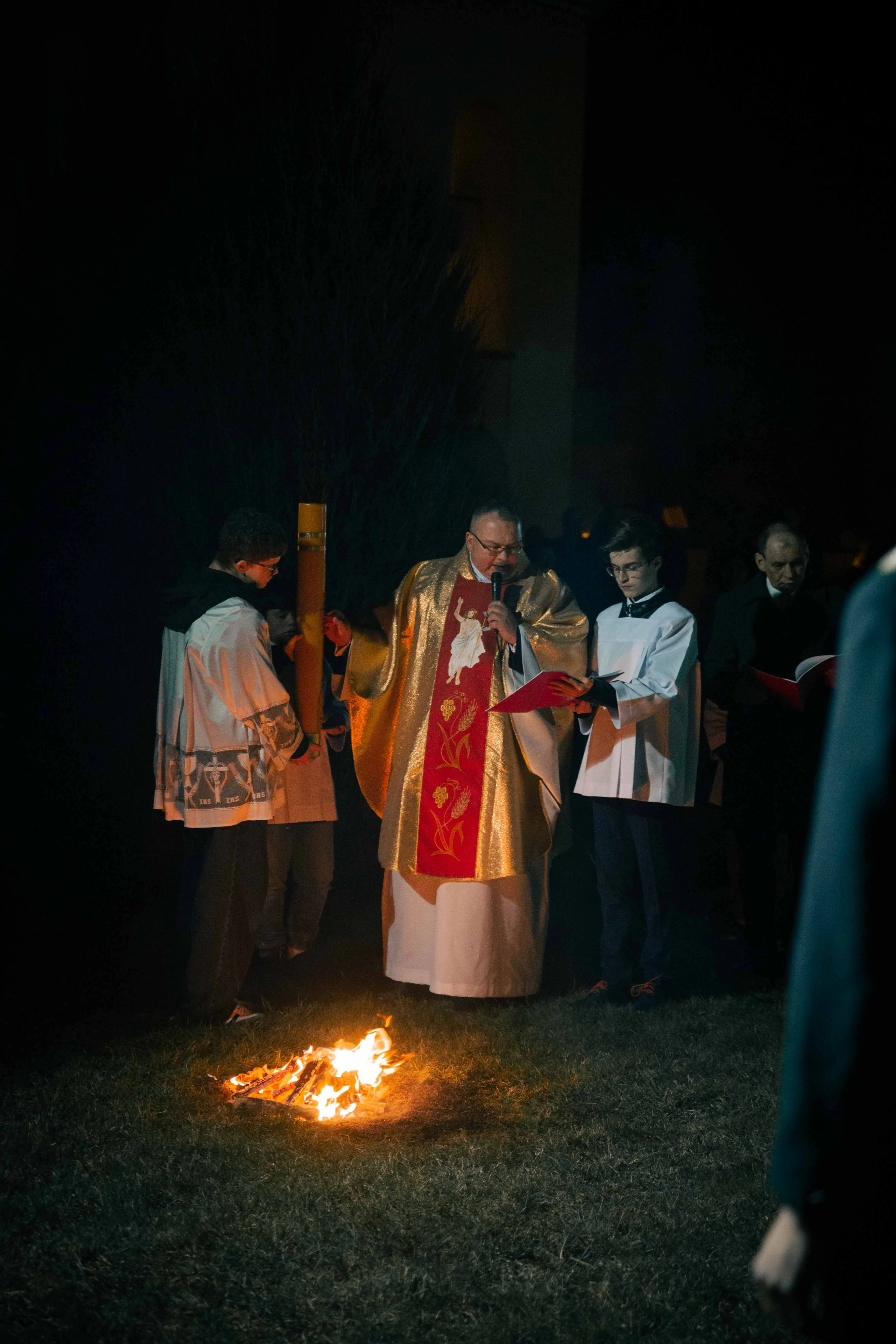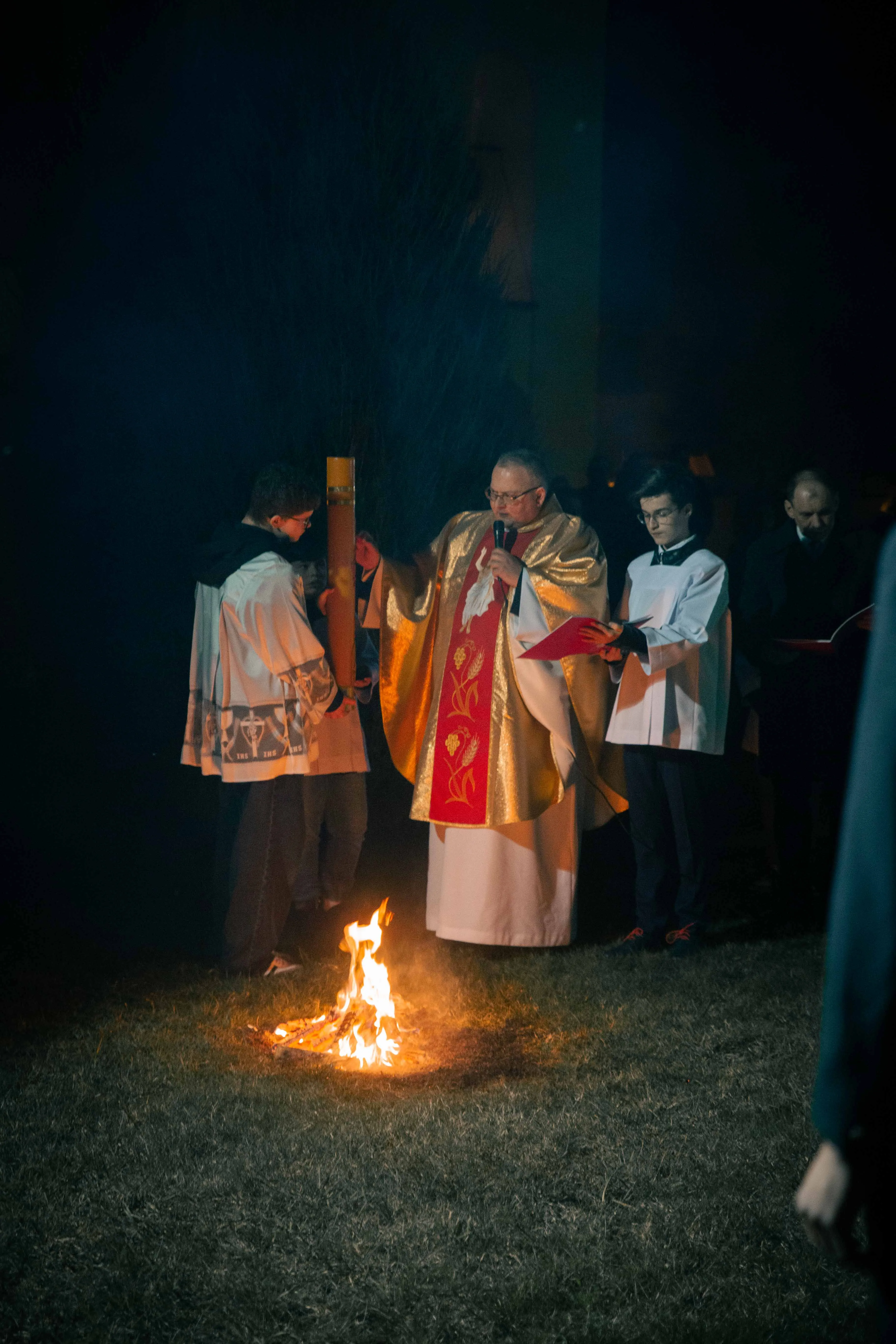 Po zapadnięciu zmroku odprawiana jest msza Wigilii Paschalnej, na która składa się: Liturgia Światła, Liturgia Słowa Bożego, Liturgia Chrzcielna, Liturgia Eucharystyczna.