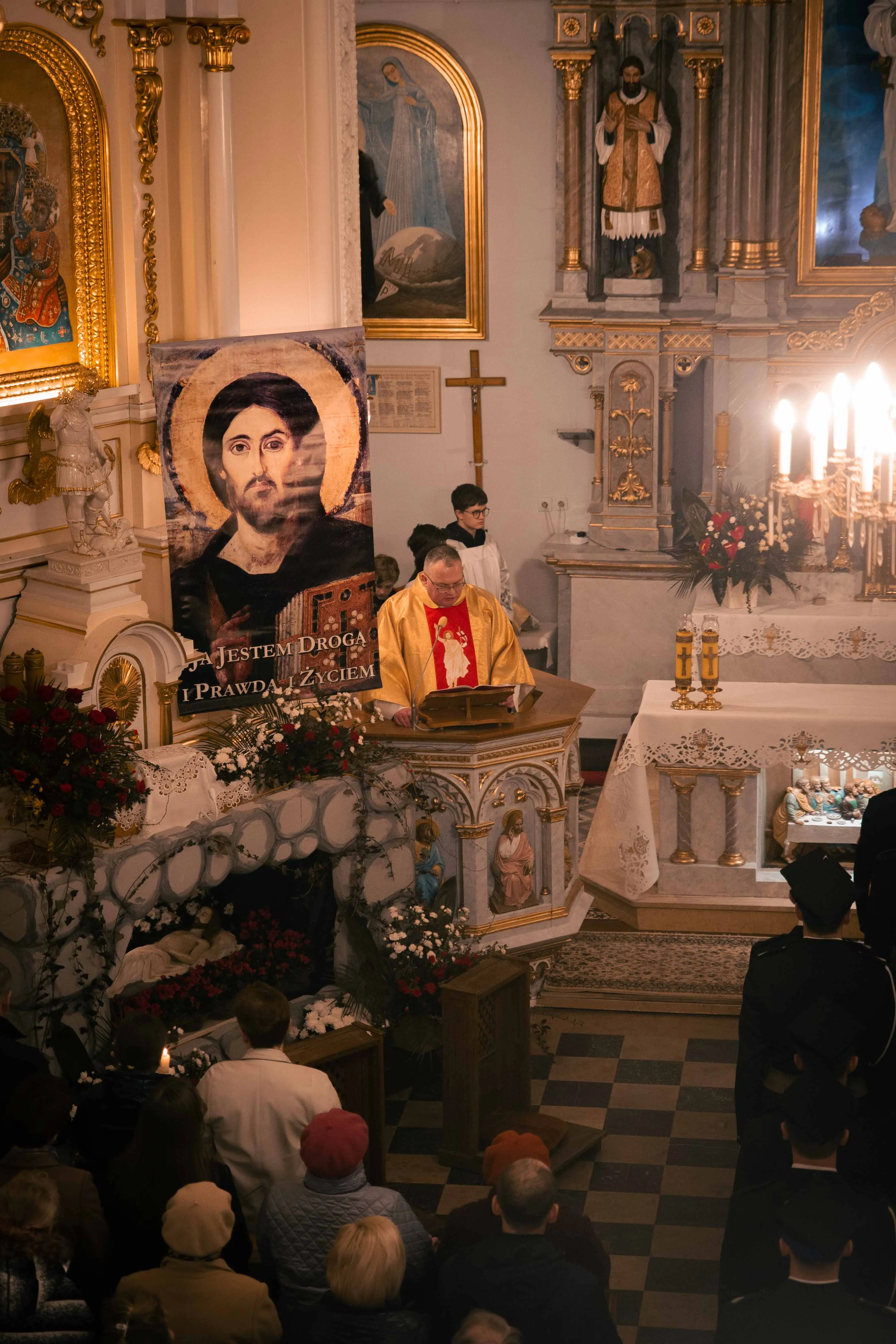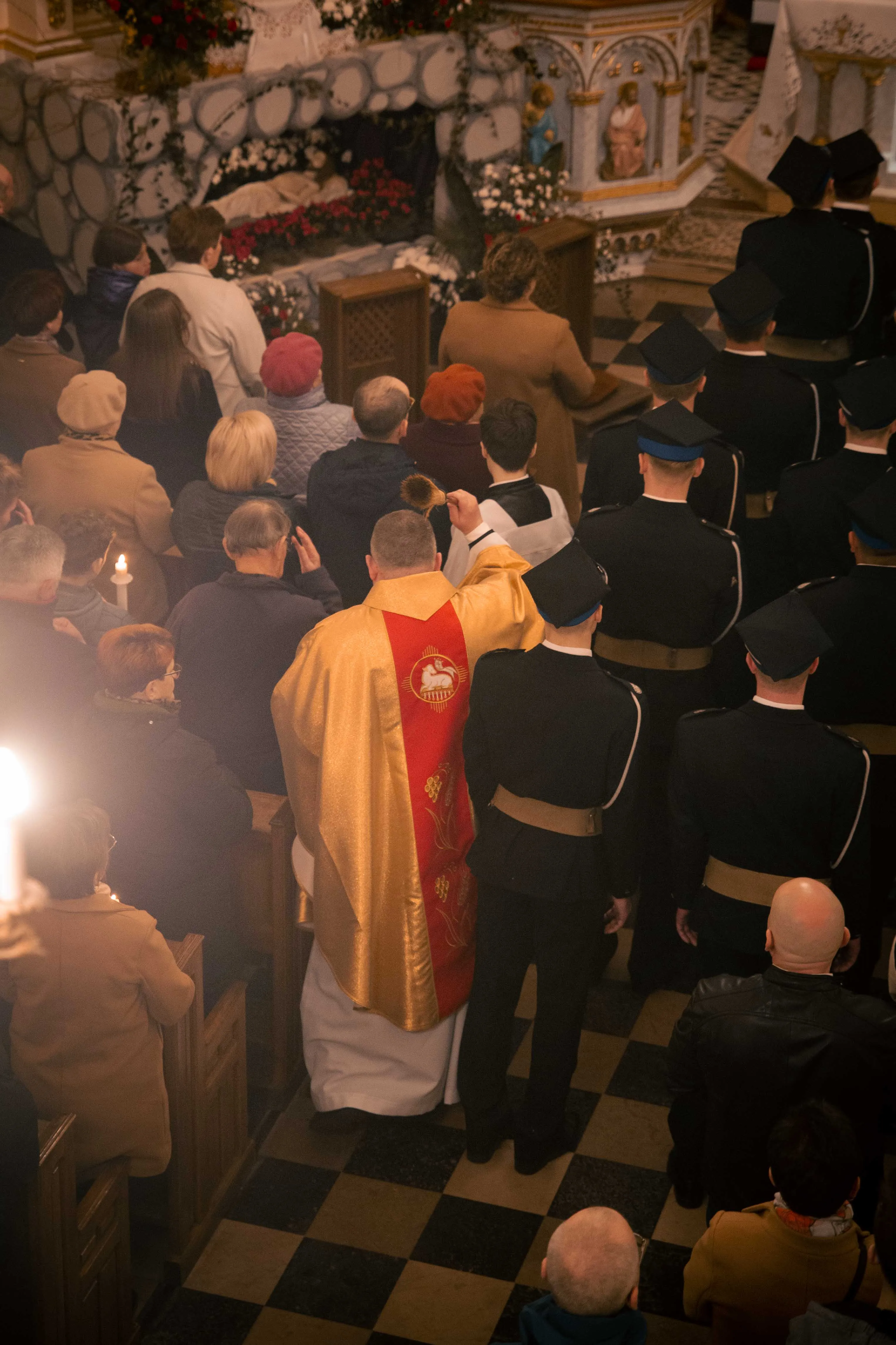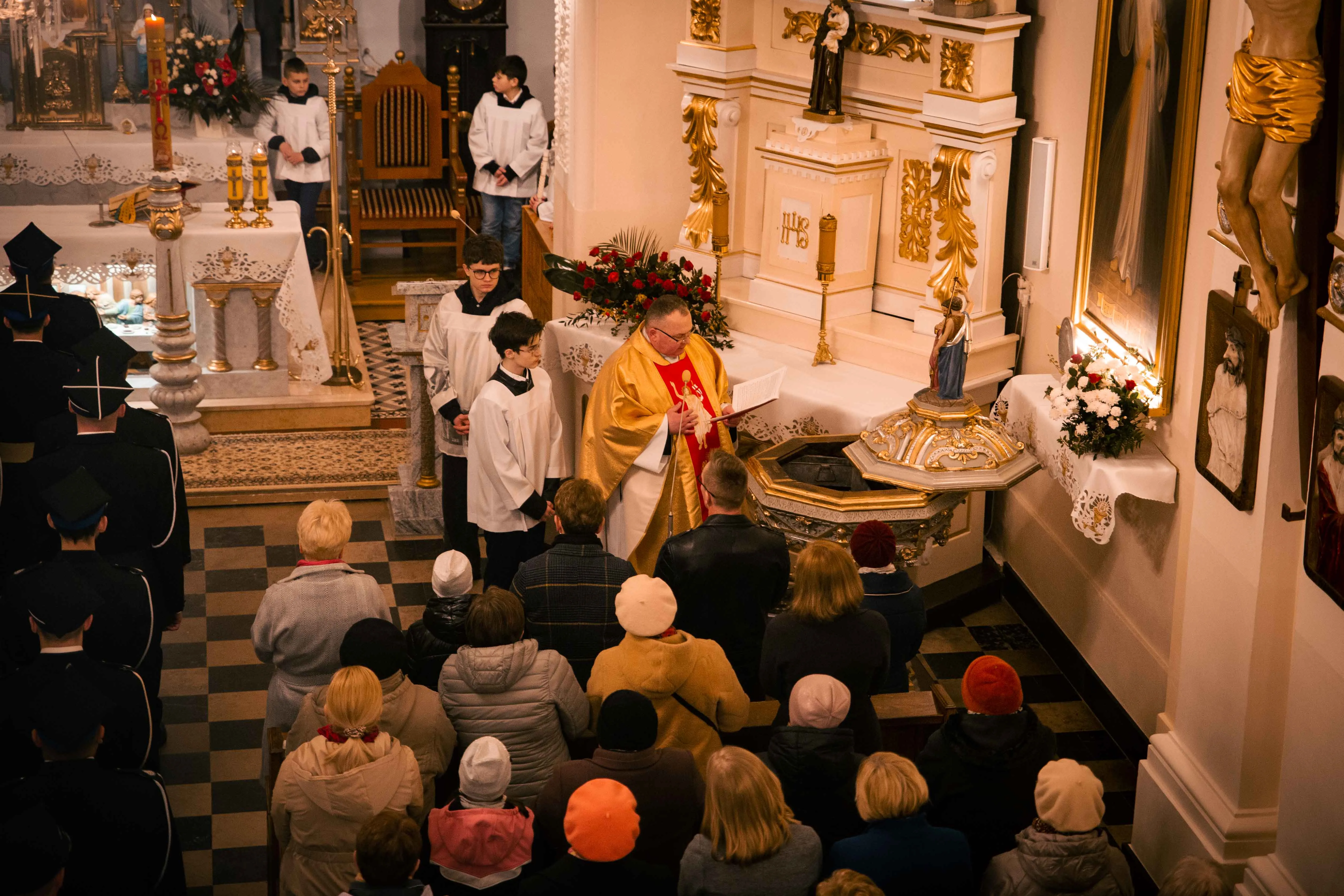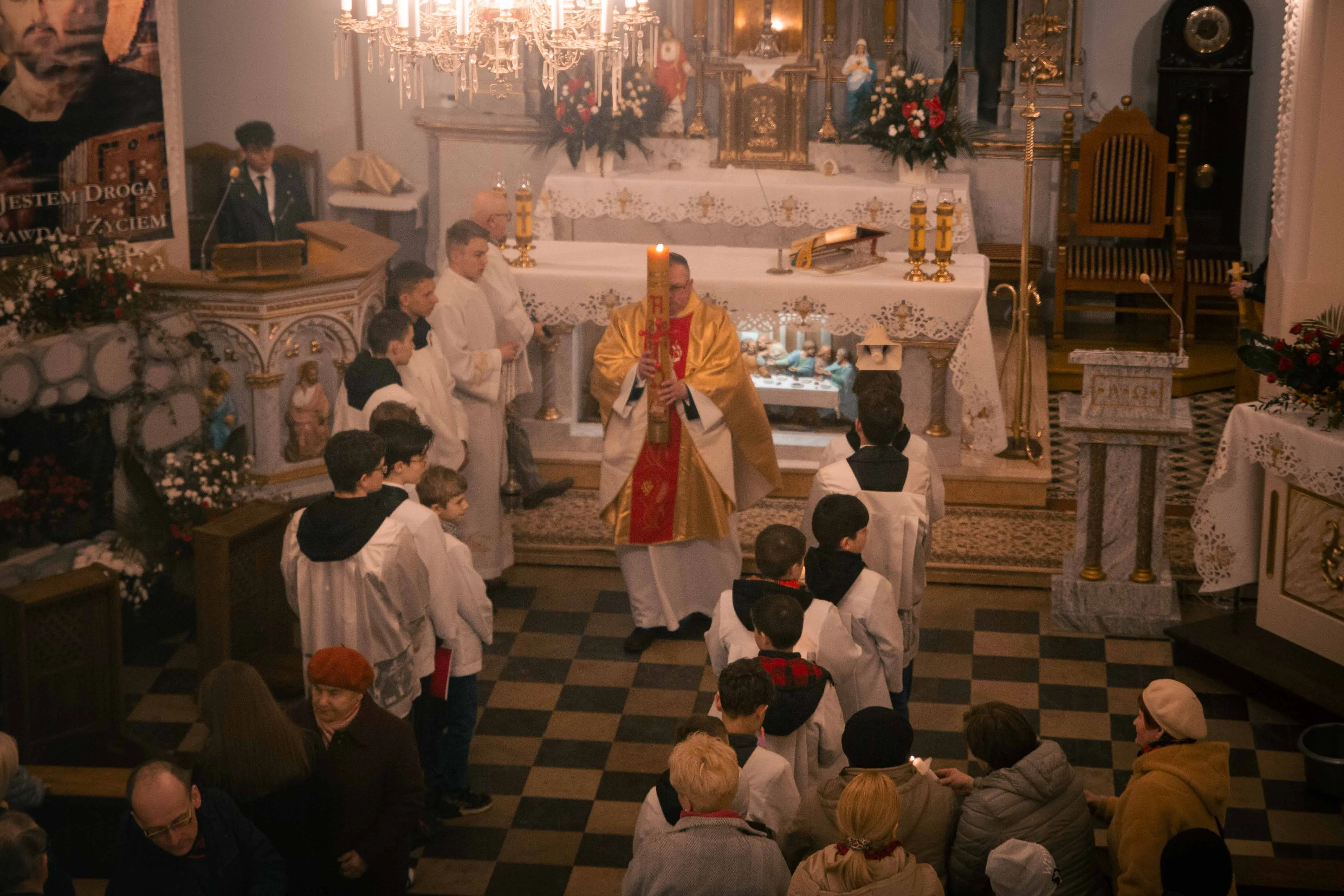 Po zapadnięciu zmroku odprawiana jest msza Wigilii Paschalnej, na która składa się: Liturgia Światła, Liturgia Słowa Bożego, Liturgia Chrzcielna, Liturgia Eucharystyczna.