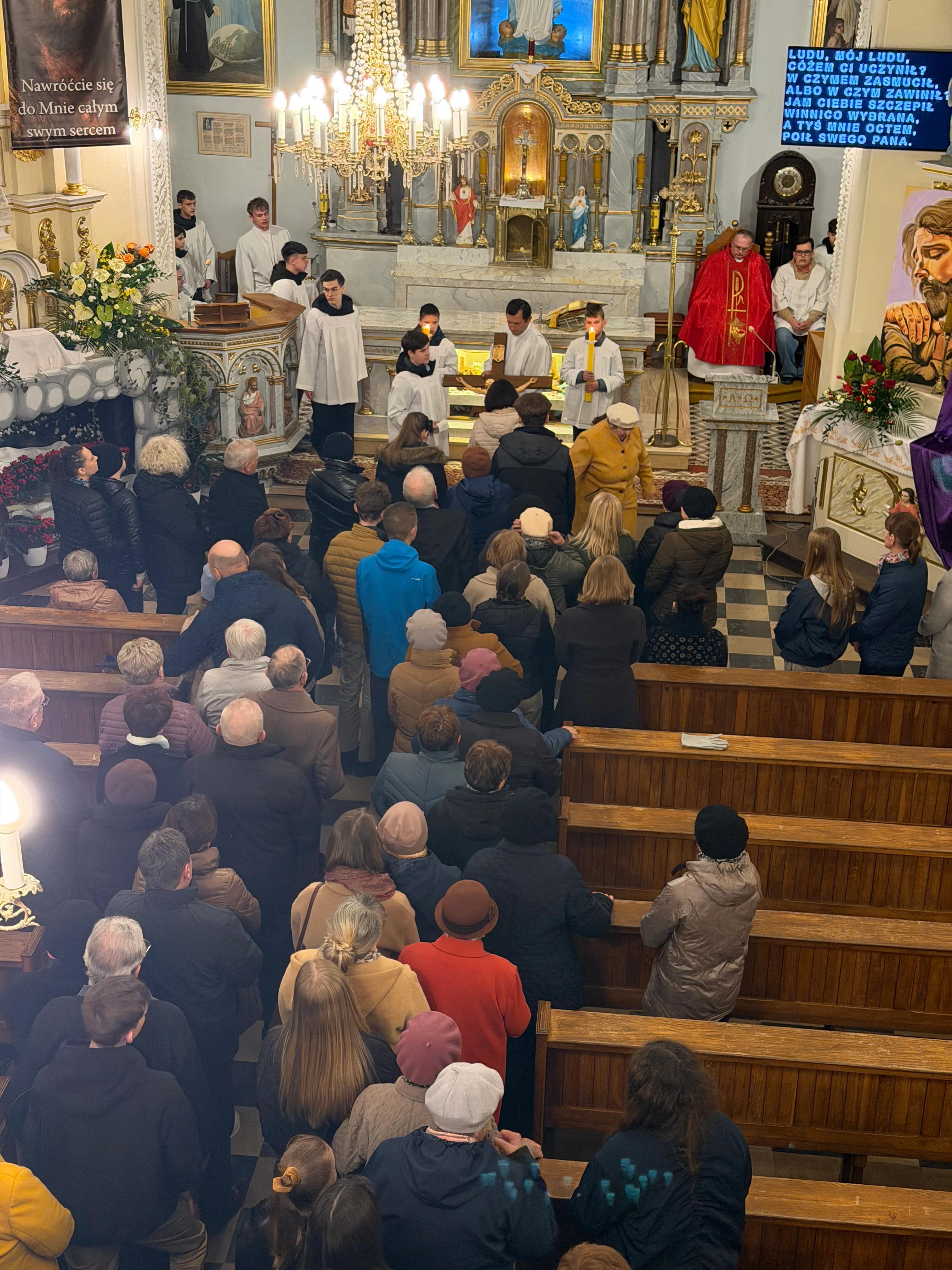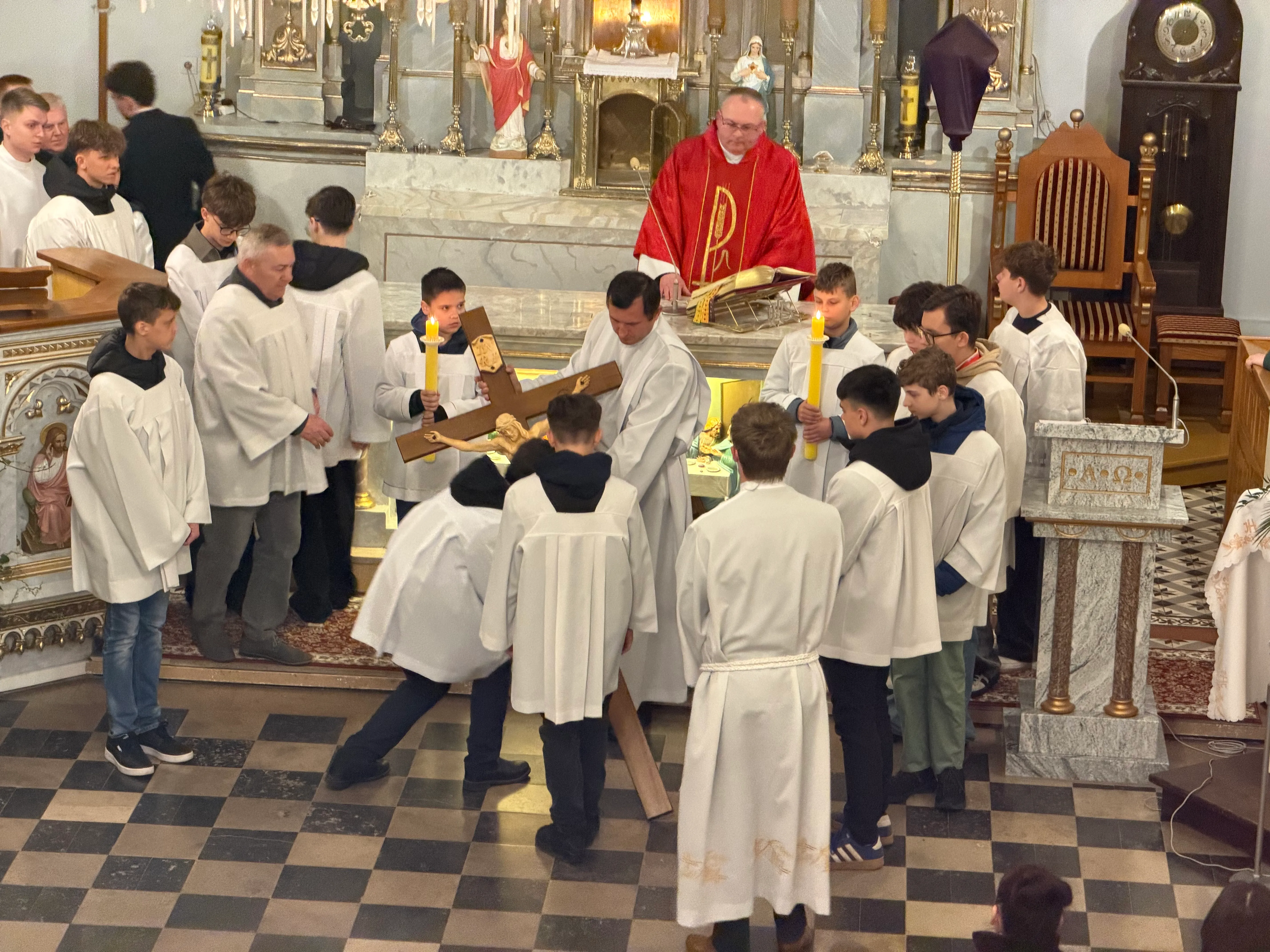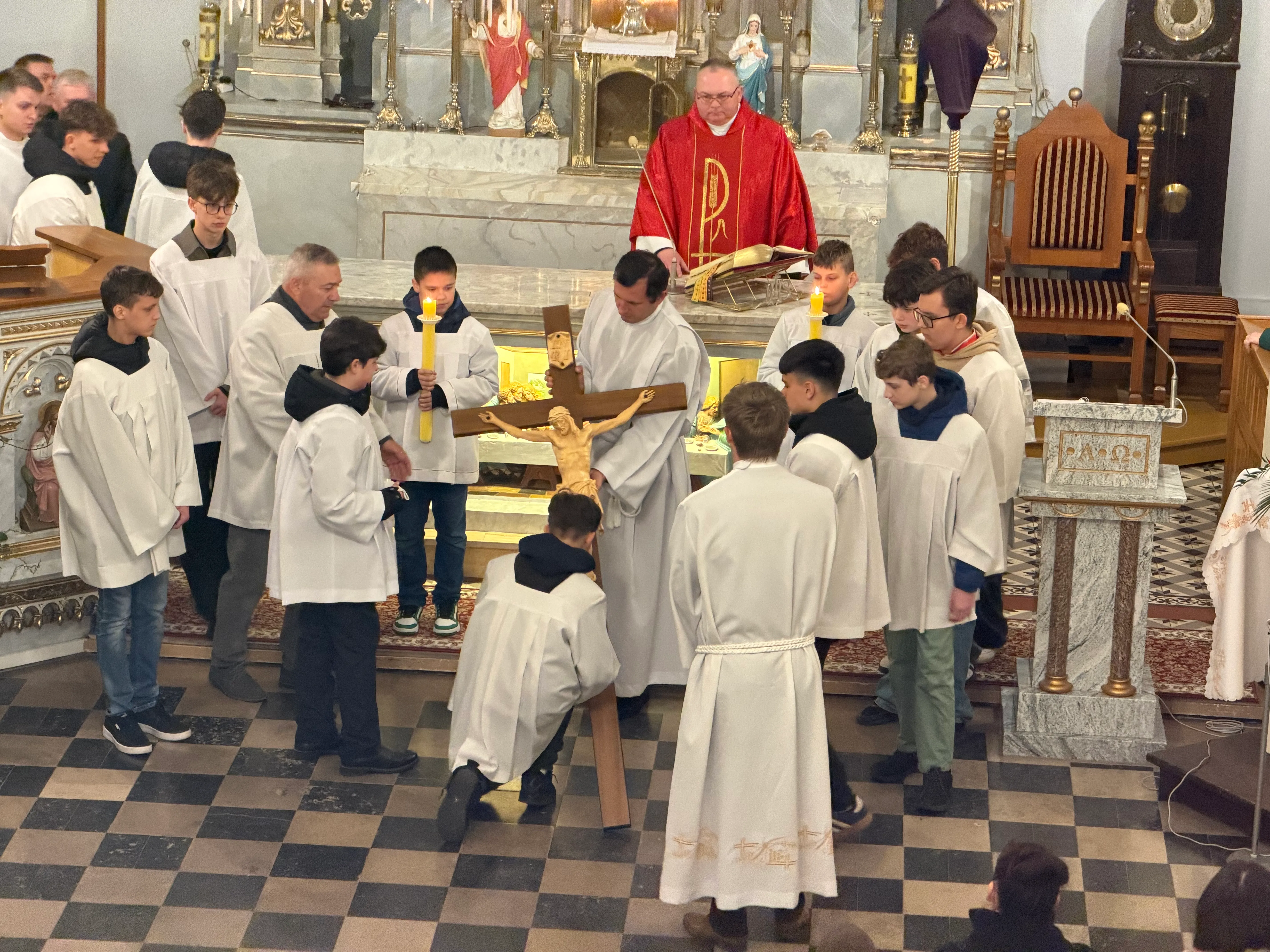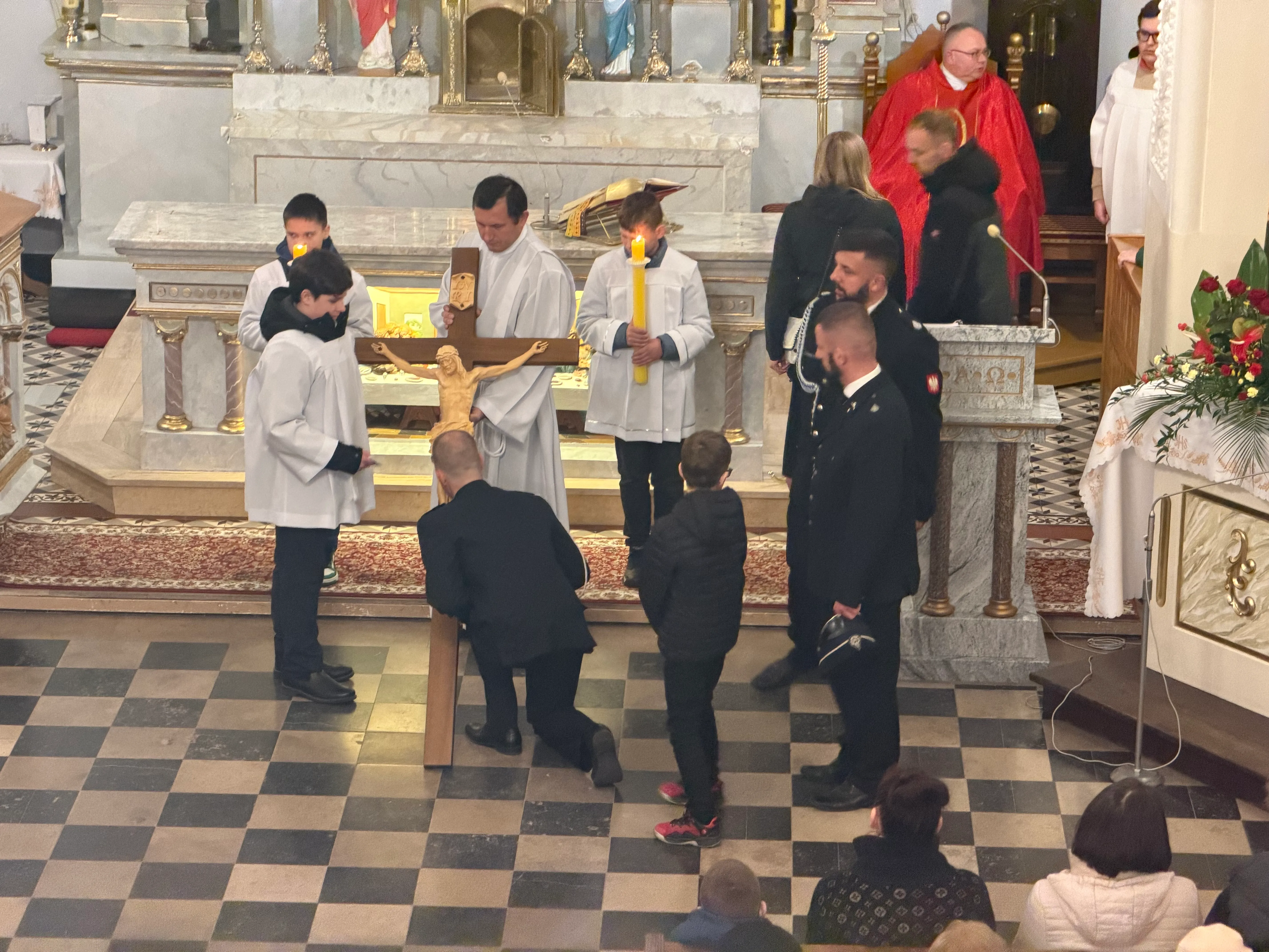Ceremonię Wielkiego Piątku rozpoczęła Droga Krzyżowa. Wielkopiątkowa liturgia jest pamiątką zwycięstwa odniesionego przez umęczonego i ukrzyżowanego Jezusa Chrystusa. W tym dniu używa się czerwonych szat liturgicznych symbolizujących miłość zwyciężającą na krzyżu, ale nie odprawia się Mszy świętej. Liturgię rozpoczęła milcząca procesja. Kapłan dokonał aktu prostracji, czyli leżenia krzyżem, co jest znakiem najgłębszej adoracji, uniżenia i pokuty.