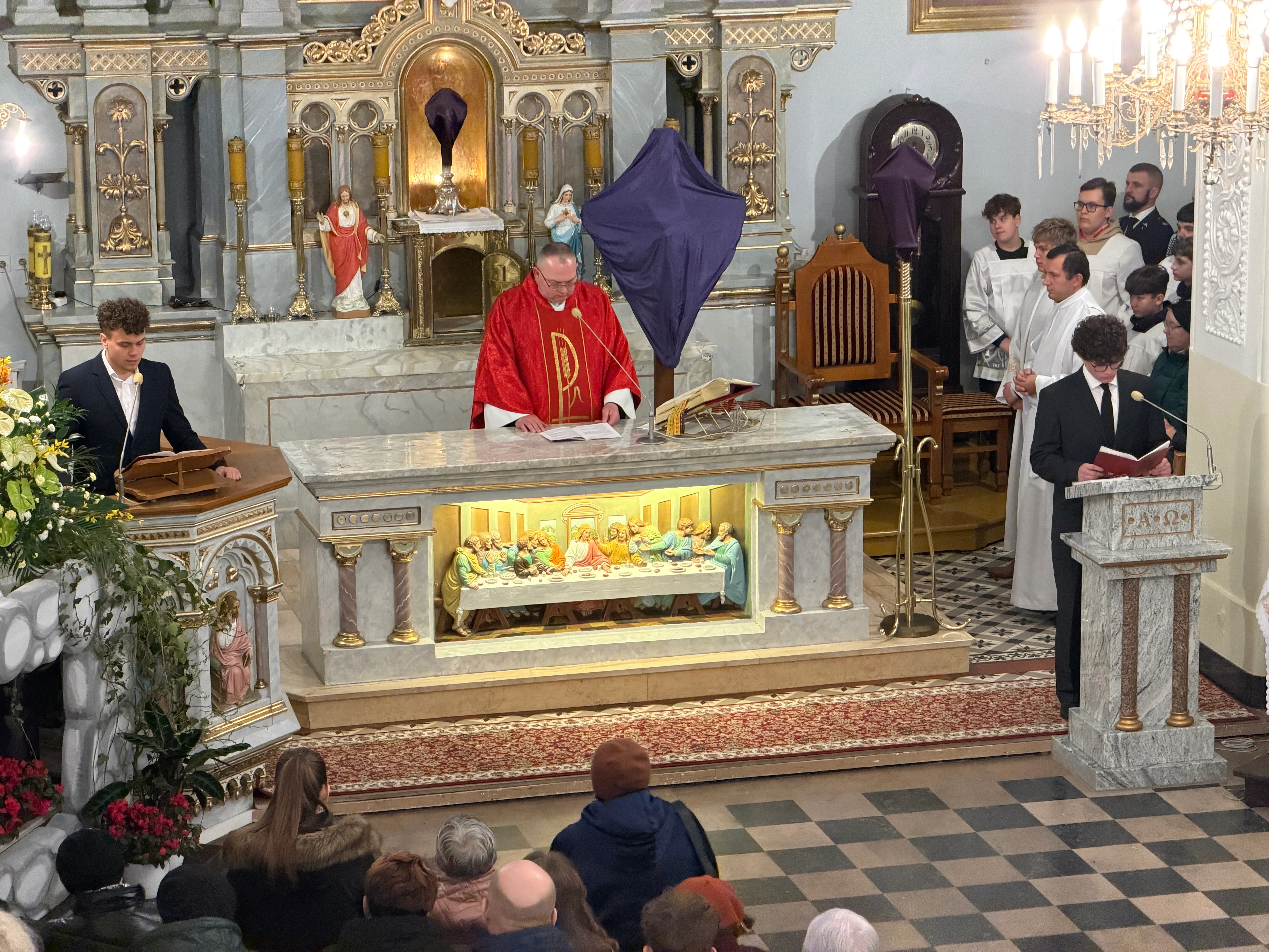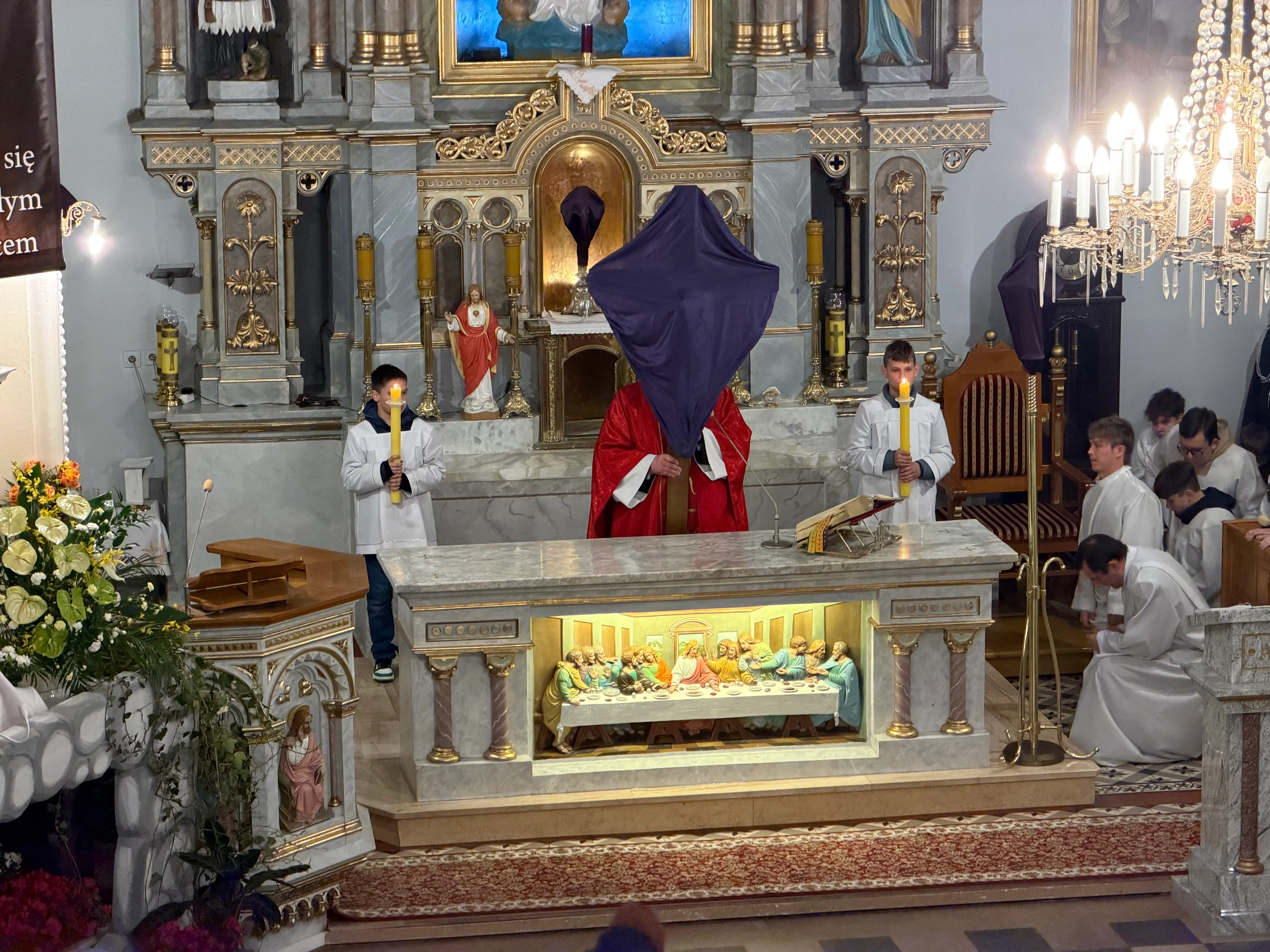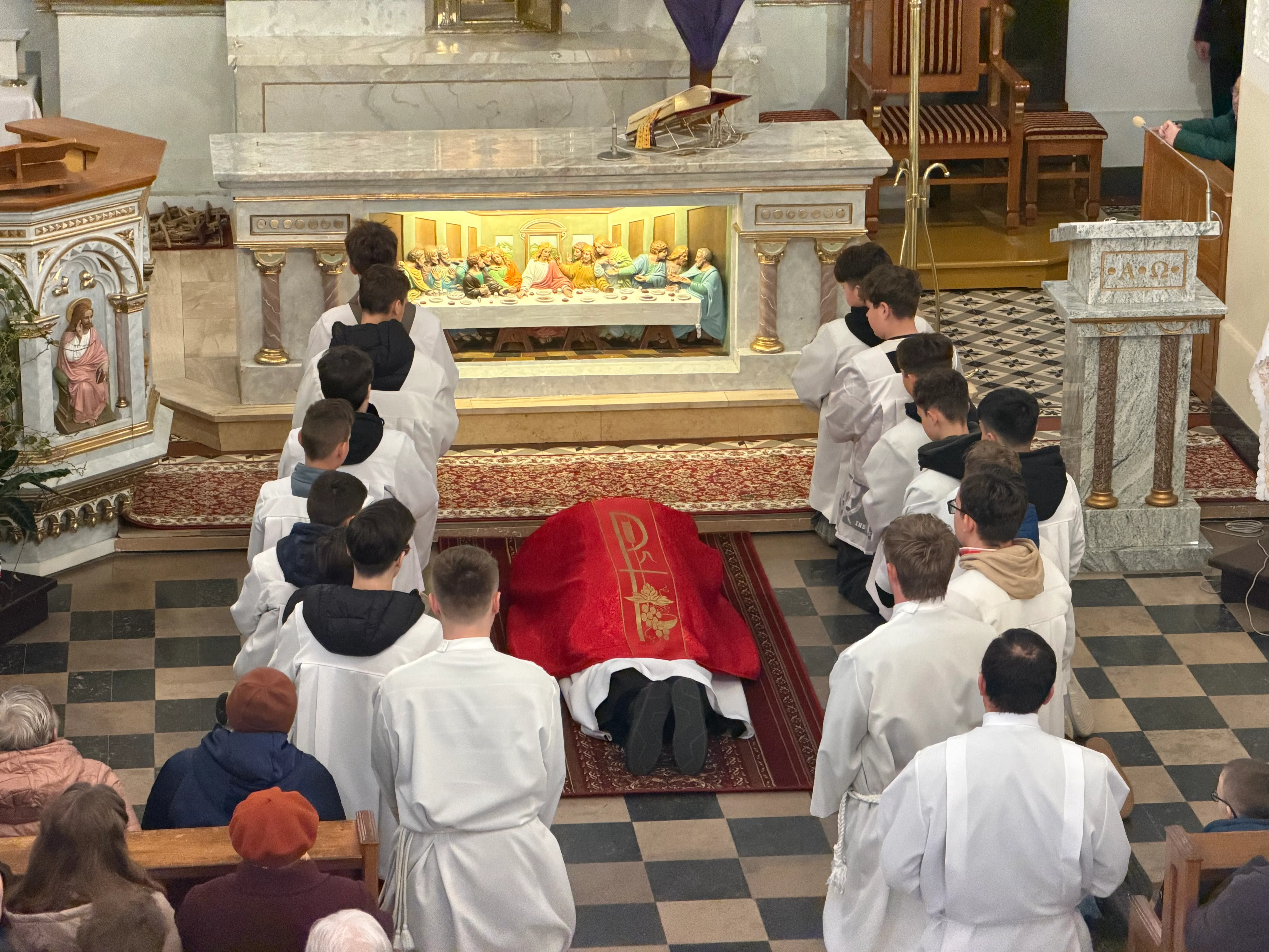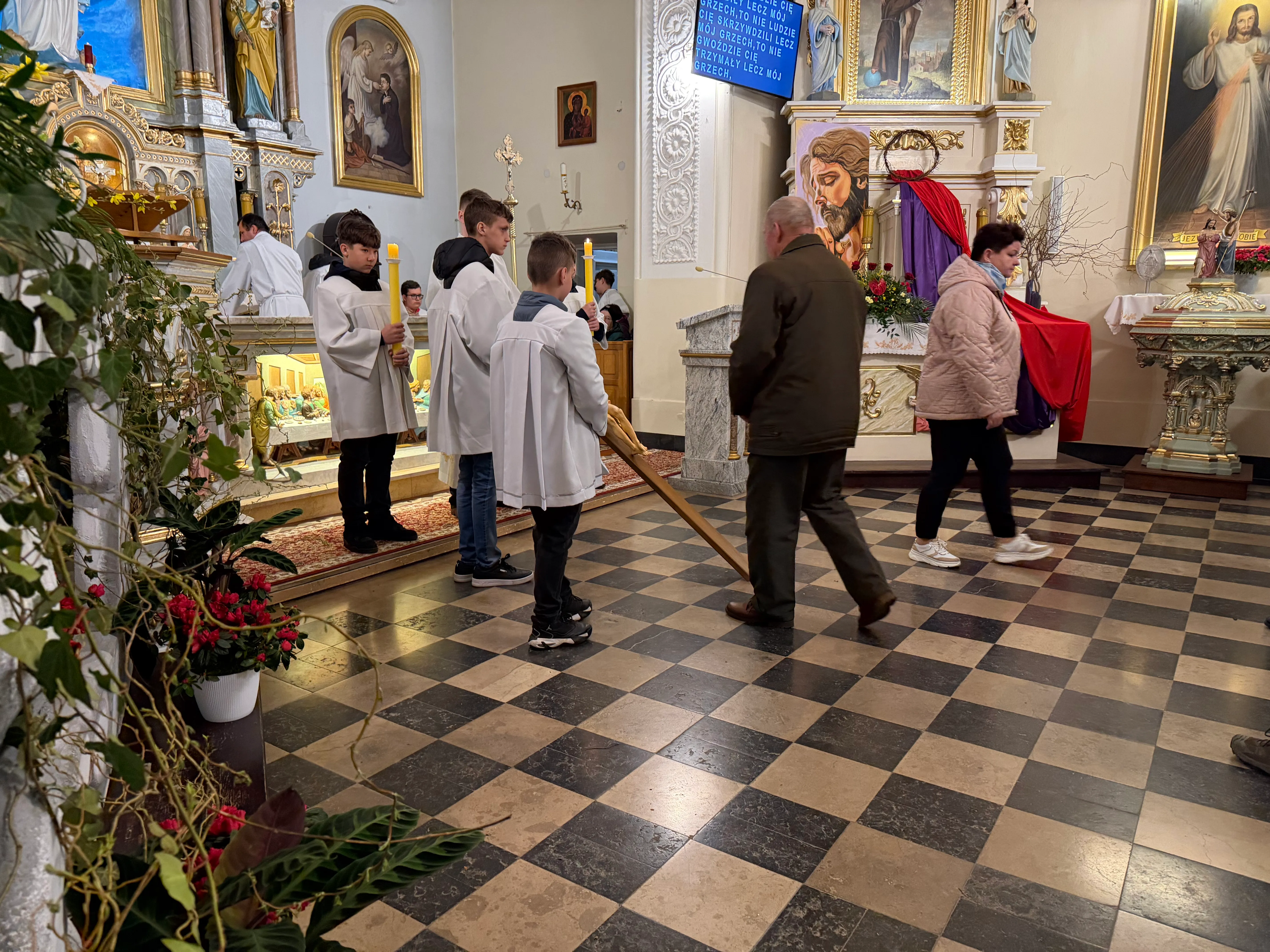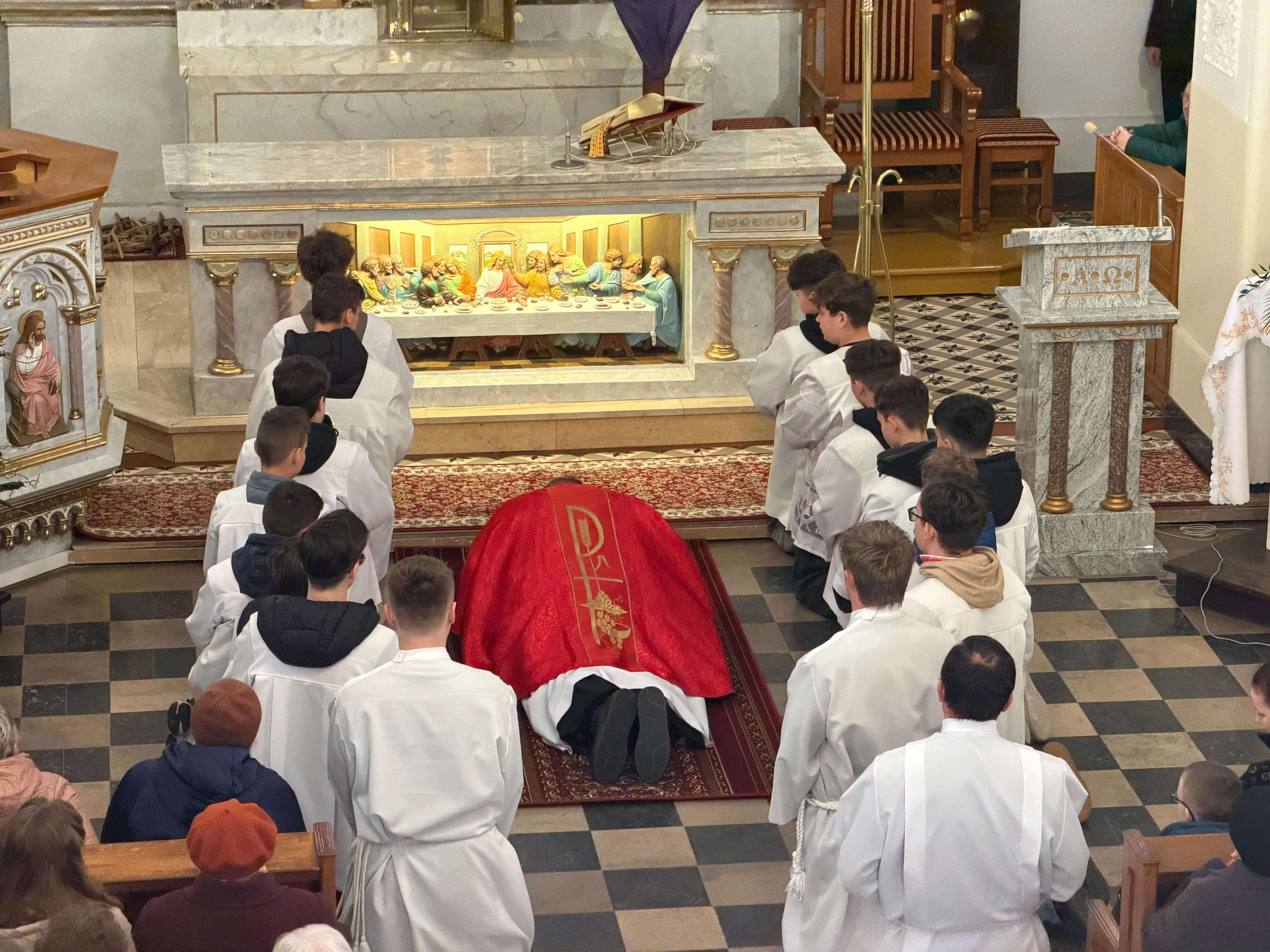 Ceremonię Wielkiego Piątku rozpoczęła Droga Krzyżowa. Wielkopiątkowa liturgia jest pamiątką zwycięstwa odniesionego przez umęczonego i ukrzyżowanego Jezusa Chrystusa. W tym dniu używa się czerwonych szat liturgicznych symbolizujących miłość zwyciężającą na krzyżu, ale nie odprawia się Mszy świętej. Liturgię rozpoczęła milcząca procesja. Kapłan dokonał aktu prostracji, czyli leżenia krzyżem, co jest znakiem najgłębszej adoracji, uniżenia i pokuty.