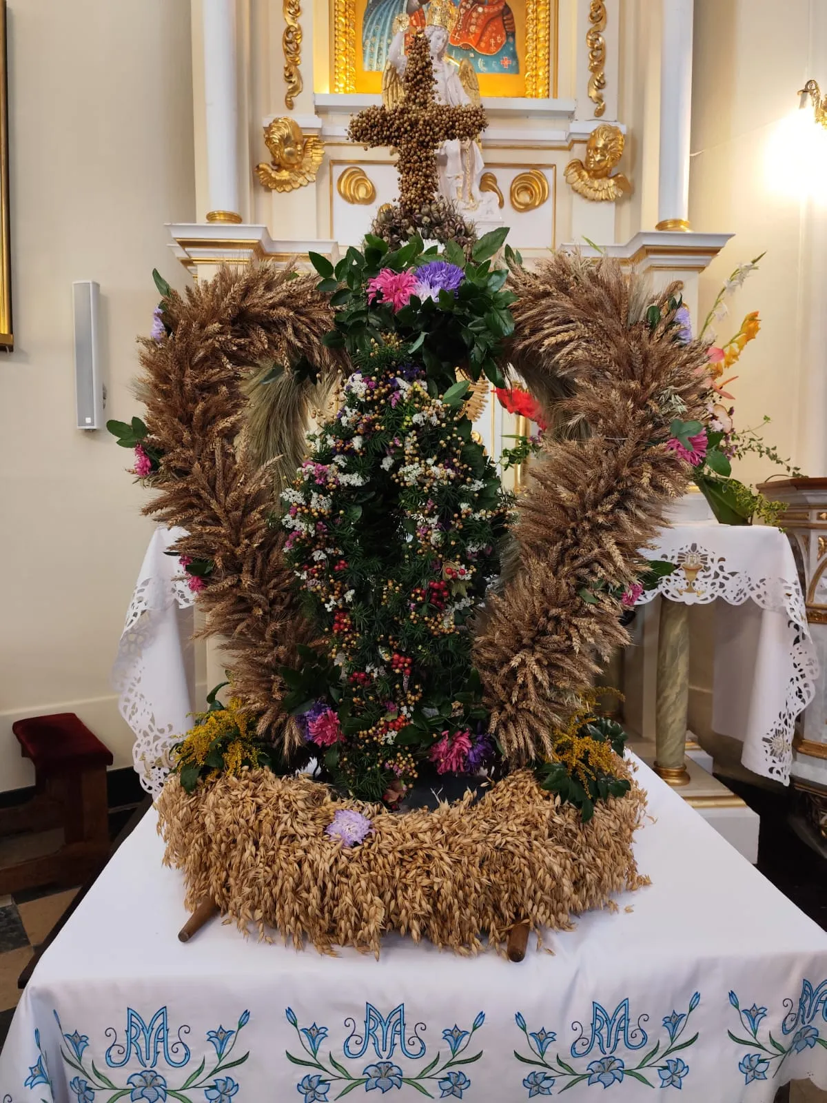 Tradycyjnie też został zaprezentowany i poświęcony wieniec dożynkowy przygotowany tym razem przez Koło Gospodyń Wiejskich z Brzeźnicy Bychawskiej.